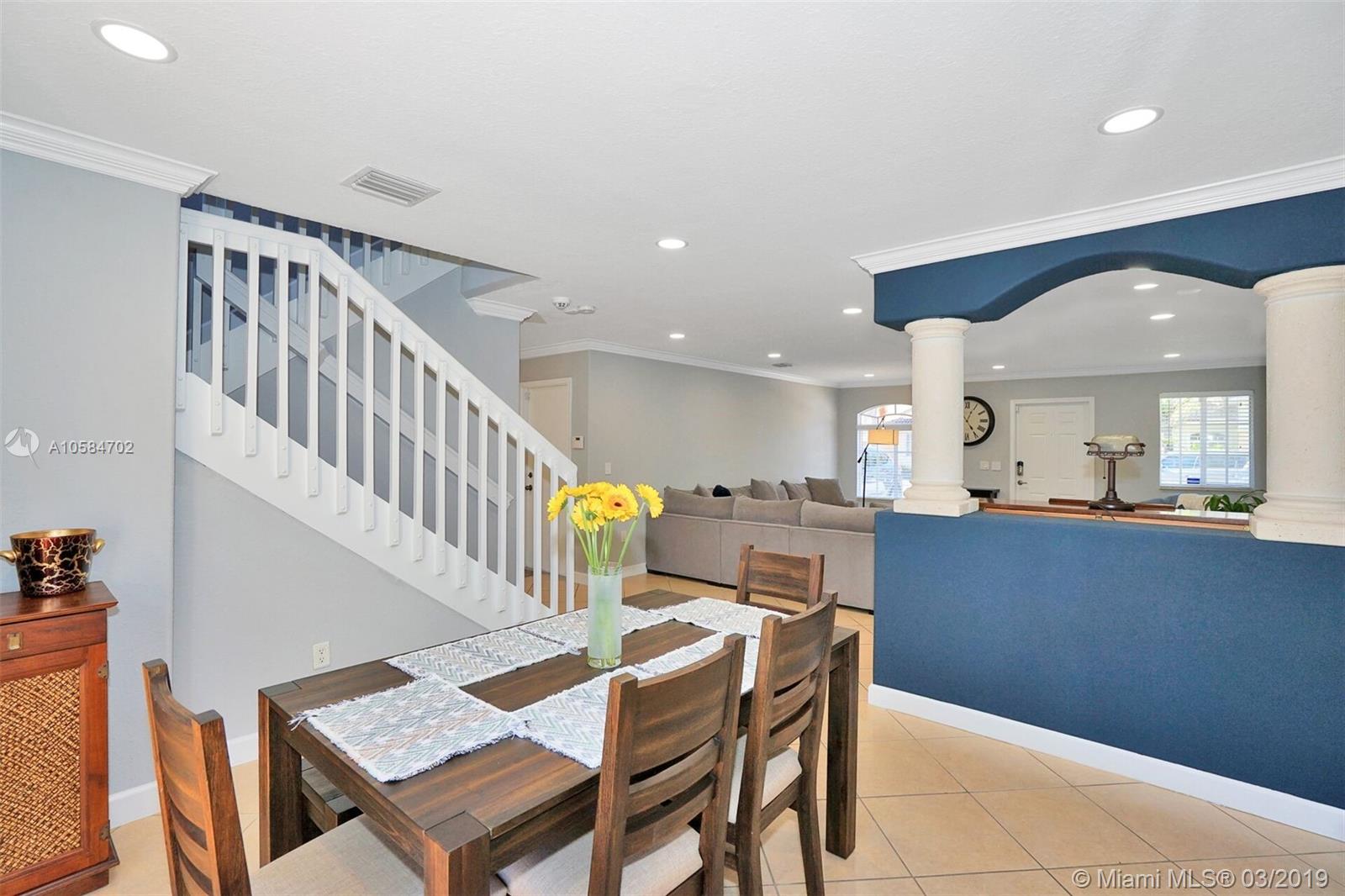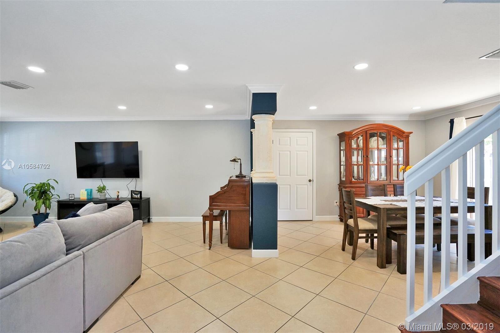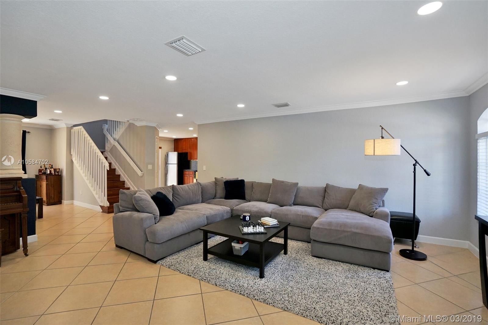 Large 1860 sq. ft., 3 bedrooms, 2 baths, 2 story townhome located at Bella Colina in Miami Lakes. Laminate floors upstairs, tile downstairs. Hide hat lighting. Stainless steel appliances except the range, washer and dryer. Walk-in closet. Tub and shower in the master bathroom. Big patio. Beautiful townhome. This one won’t last.