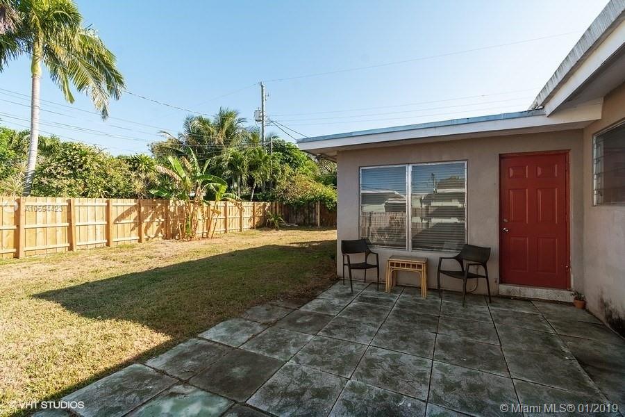 Entry includes a large foyer entering into the living room, and step up open dining room area. Nice open floor plan. Exterior area newly painted. Some new interior paint. Large fenced backyard. Landscaping recently refreshed. All appliances stay, including electric range, refrigerator, dishwasher, washer and dryer. Kitchen has spacious wood cabinets. En suite owners bedroom, and nice sized 2nd bedroom. Close to downtown Ft Lauderdale, Los Olas Drive, and the beach.