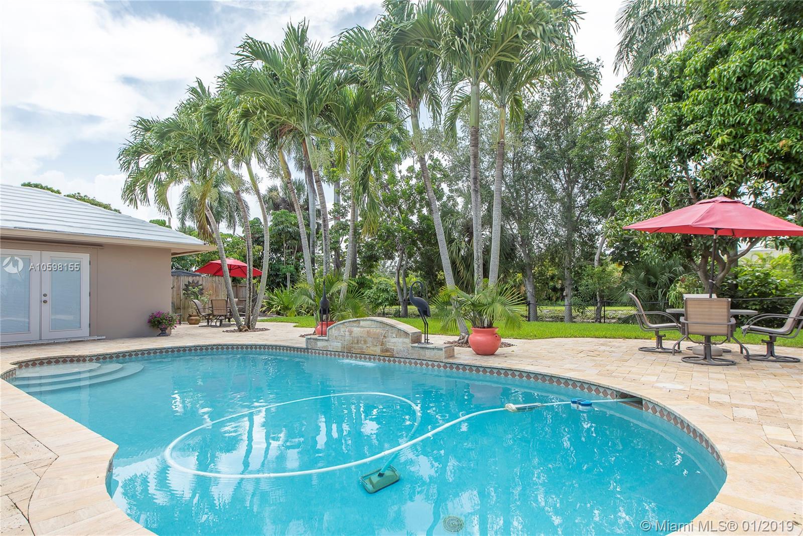 Enjoy the sunset while relaxing by your pool in this tropical island setting. This immaculate El Dorado Estates 3/2 waterfront pool home is conveniently located near popular shopping areas and entertainment in a gated neighborhood with 24/7 roaming security. Your beautiful home provides updated kitchen and bathrooms, a large pantry, Stainless Steel appliances, granite counter-tops, and a spacious yard in a tropical setting. The property is fenced and private, with an over-sized 2 car garage , & paved patio. The HOA has a clubhouse, professional tennis courts, picnic area and a professionally designed private (resident only) children's playground. A very secure neighborhood.