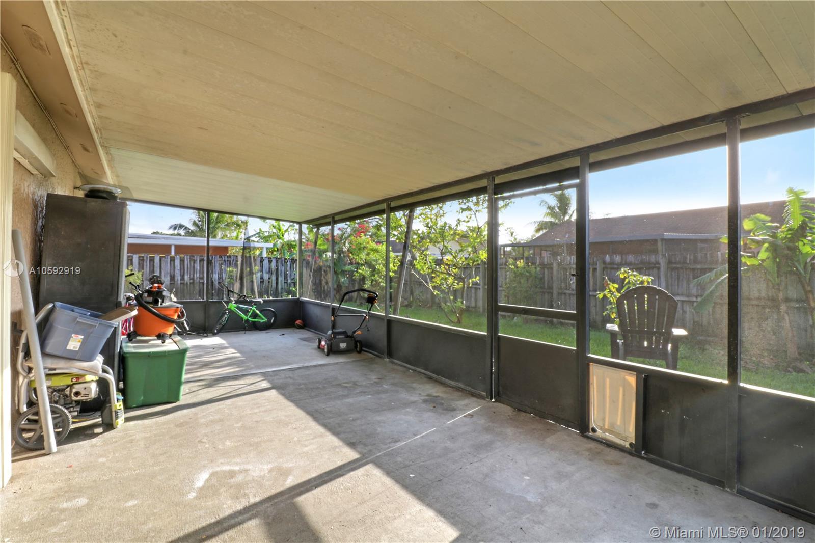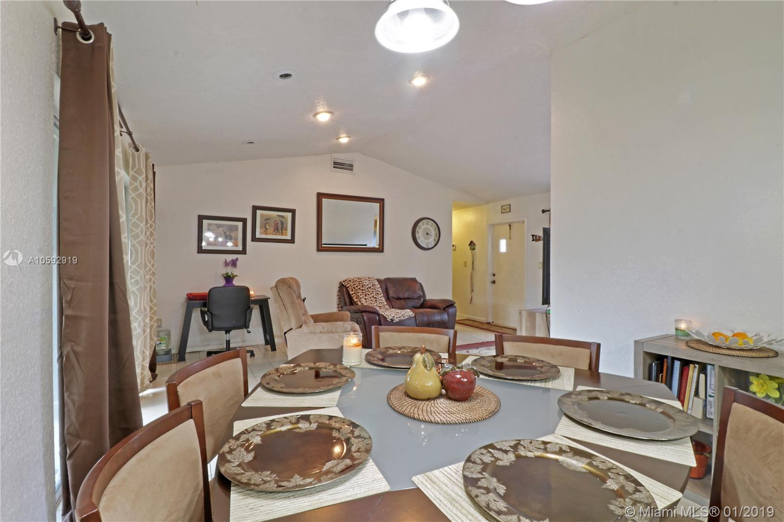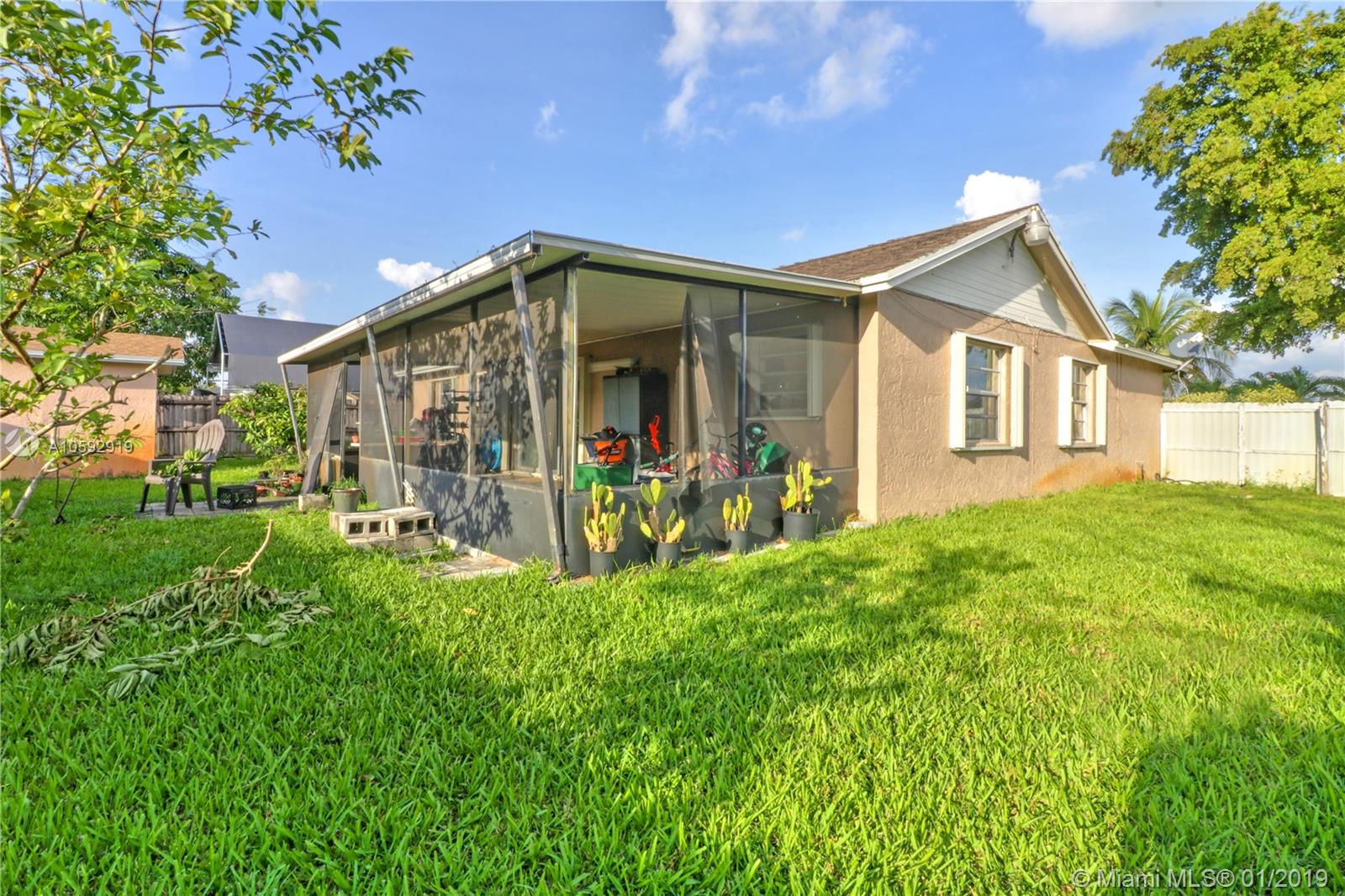 Beautiful 4 bedroom / 2 bathroom / home located in a great community in the county line between Miami Dade & Broward. This property feature Tile floor, Granite counter top and stainless steal appliances. Sliding glass door leading to patio is hurricane impact. There are also hurricane shutters for all around. Home has a nice layout and a big back yard featuring a screened-in terrace, great for entertainment, and a big storage shed. Close to all points of interest and main highways such as Palmetto, turnpike, I75 & I 95.