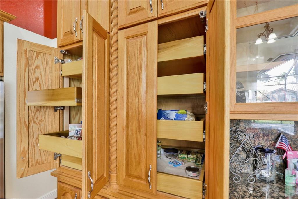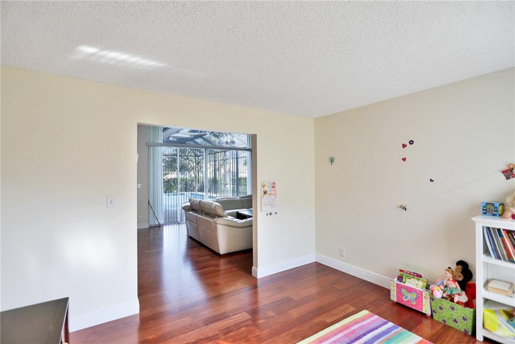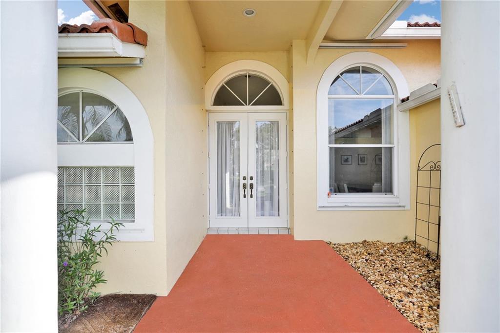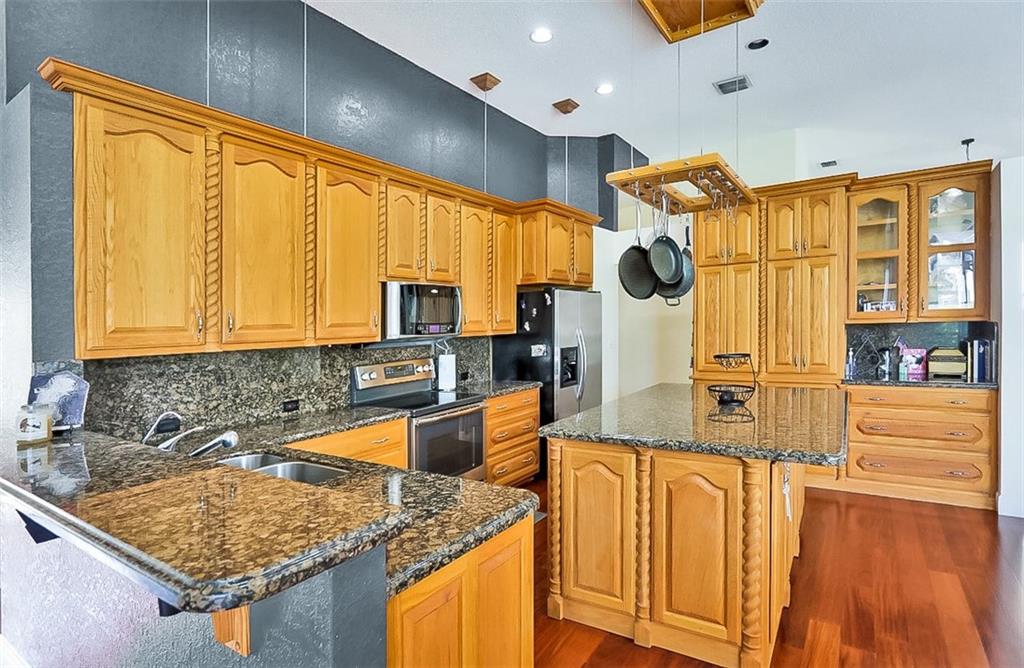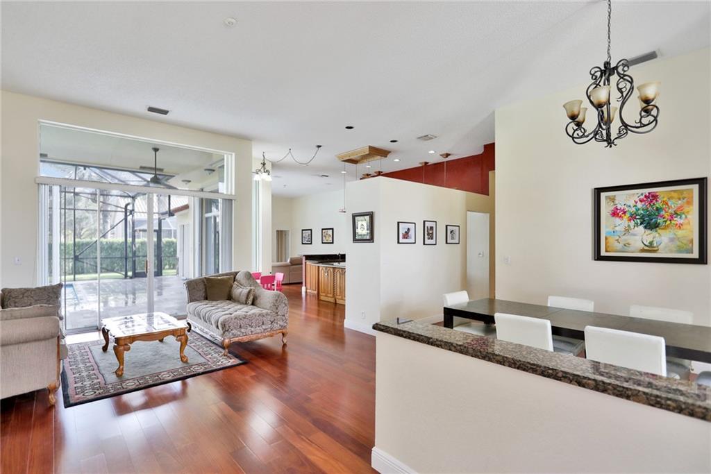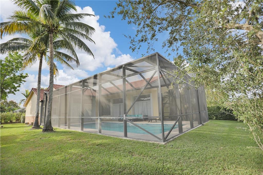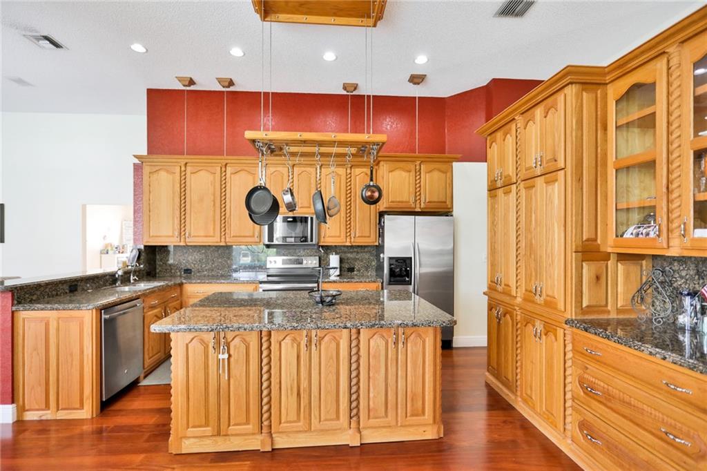 Magnificent home in the exclusive Kensington Gardens. You will be welcomed by soaring high ceilings and hardwood floors in this 5/4 with 3 car garage. You are sure to love the open floor plan and split bedroom layout. A private in-law suite in the back of the house is an added bonus. Matriculates hand crafted solid red oak kitchen cabinets with incredible upgraded features. A huge granite center island as well as stainless steal appliances complete this chef's dream kitchen. 2005 roof is in excellent condition as well as 2 A/C units from 2010. Easy to close hurricane shutters as well as an alarm. This 2015 custom built Van-Kirk heated pool with swim out bench and two therapy jets & 1000 SqFt of natural Travertine, complete this huge corner lot oasis that has ample space for entertaining.