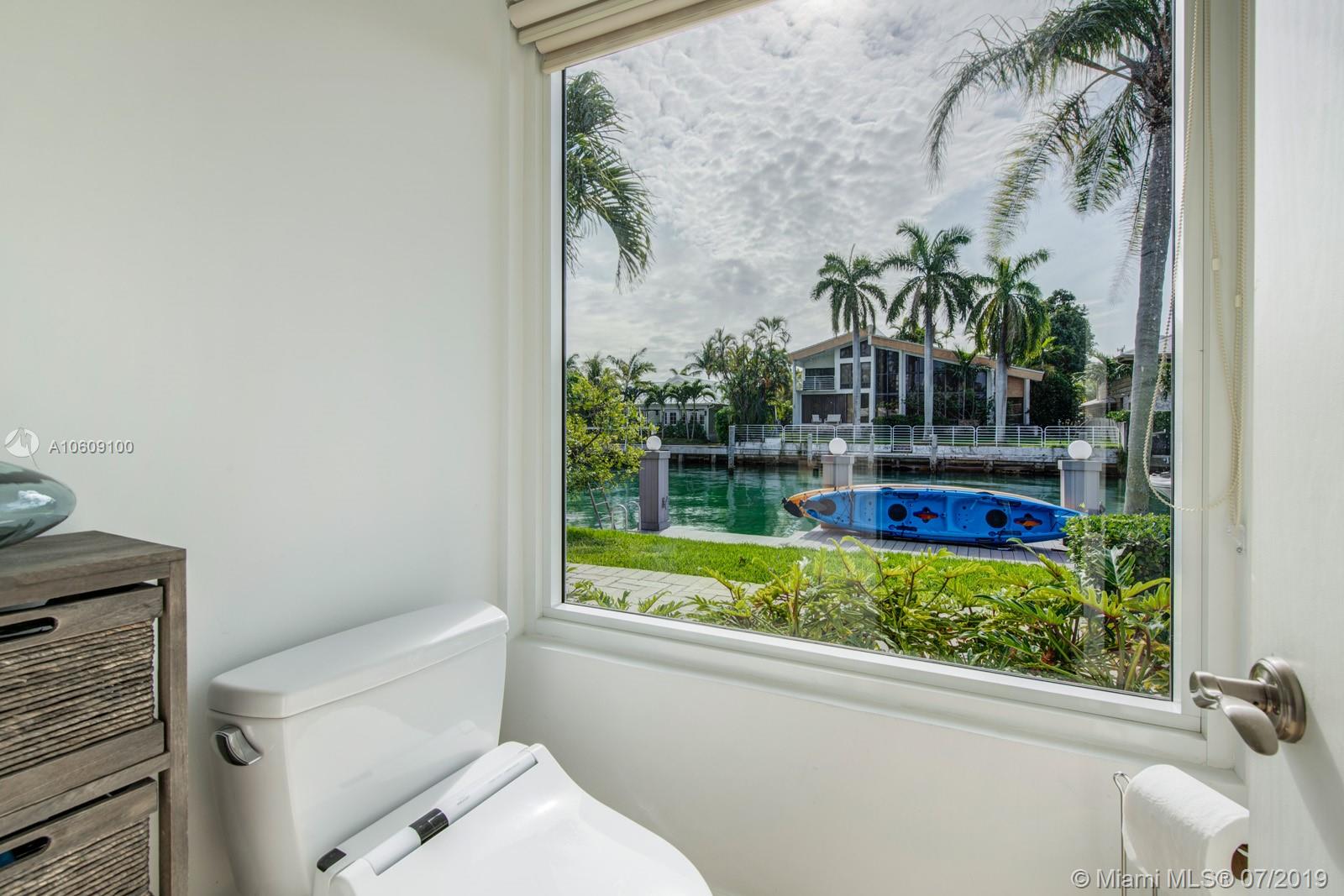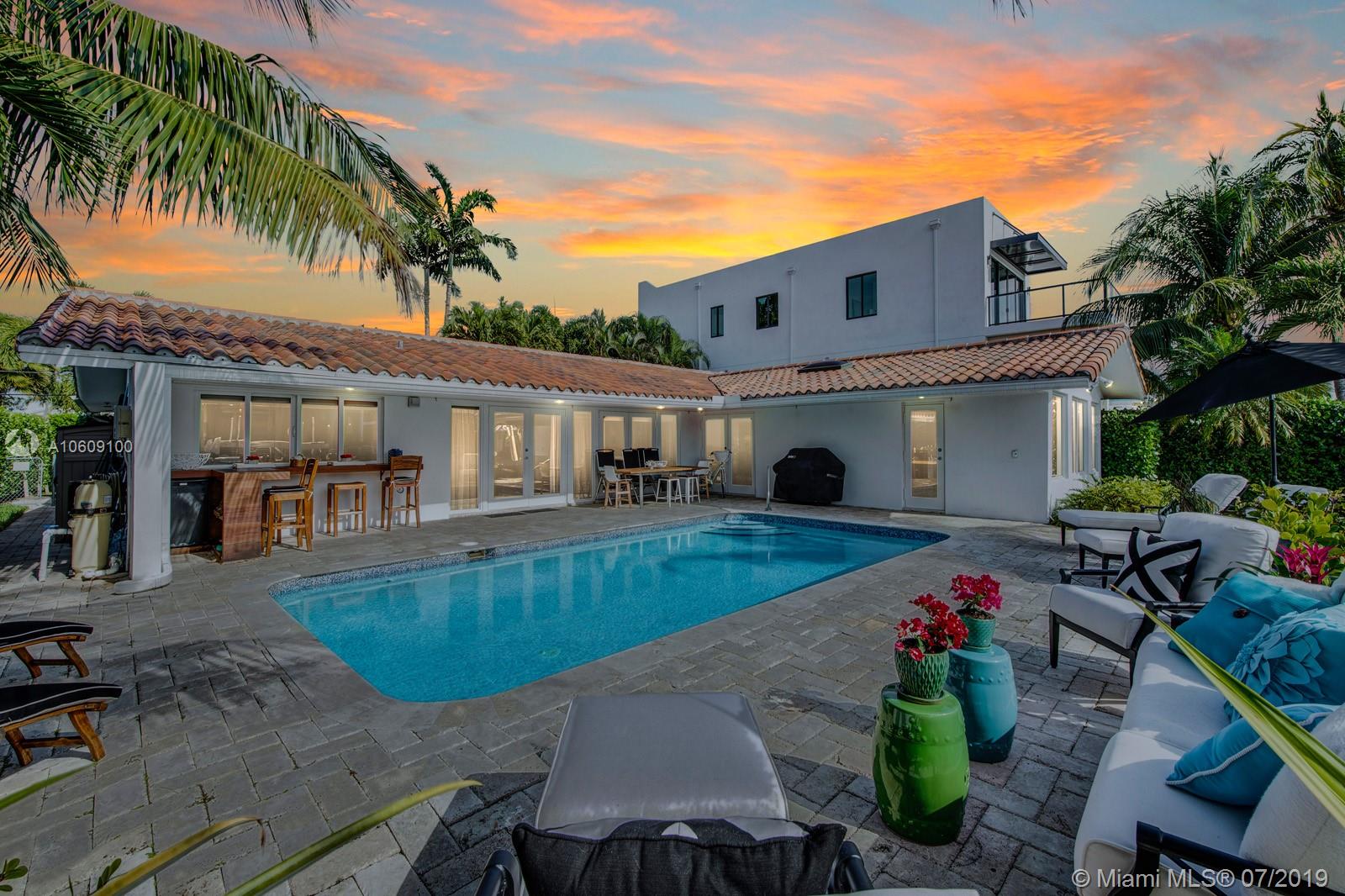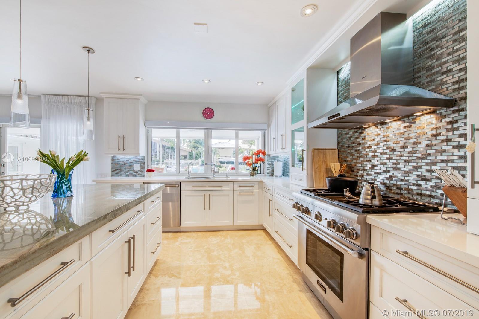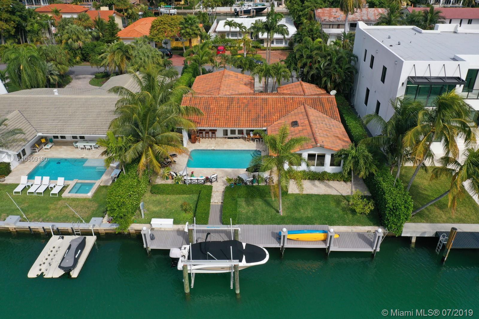 This elegant turn-key home sits four houses from the open Bay, no fixed bridges, ocean acess.75’ dock with h20 & electric. 2018 boatlift. Inside the guarded gate of Sans Souci Estates, this tropical waterfront home, with marble floors throughout, flooded with sunlight, features a large chef’s kitchen with an elegant emerald quartzite island & Thermador stainless steel appliances with natural gas. The open floor plan is exceptional for entertaining. Spacious master bed & luxurious master bath, large soaking tub & walk-in shower with water view. Walk-in closets. Saltwater pool. Built-in outdoor teak bar with fridge. Mosquito repellent & sprinkler system. Impact windows throughout. A short ride to luxury boutiques, restaurants & beaches in Bal Harbour. Make this piece of paradise yours!