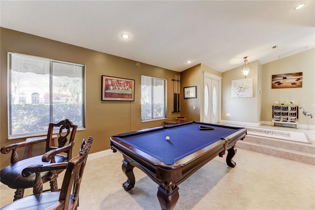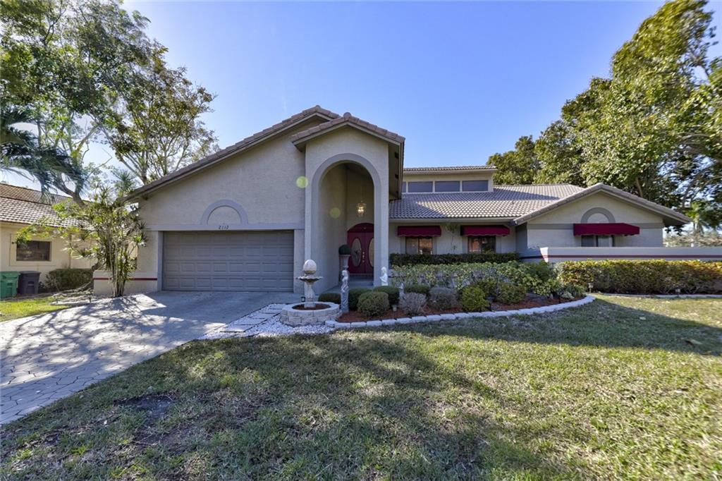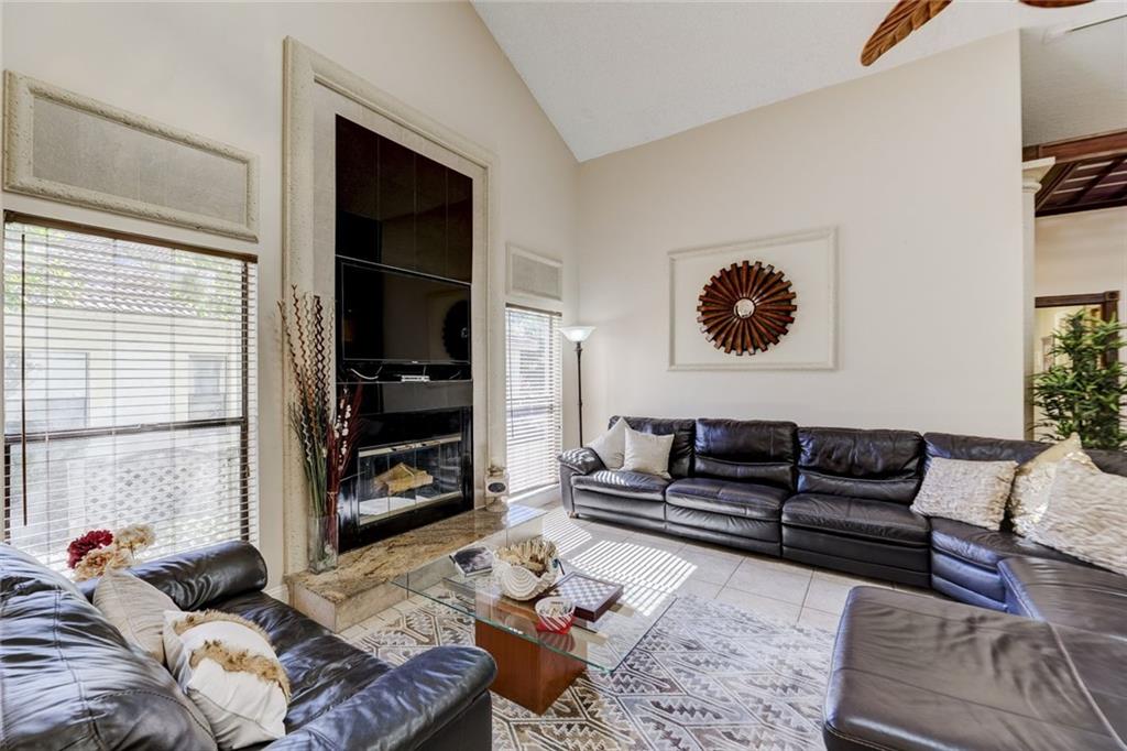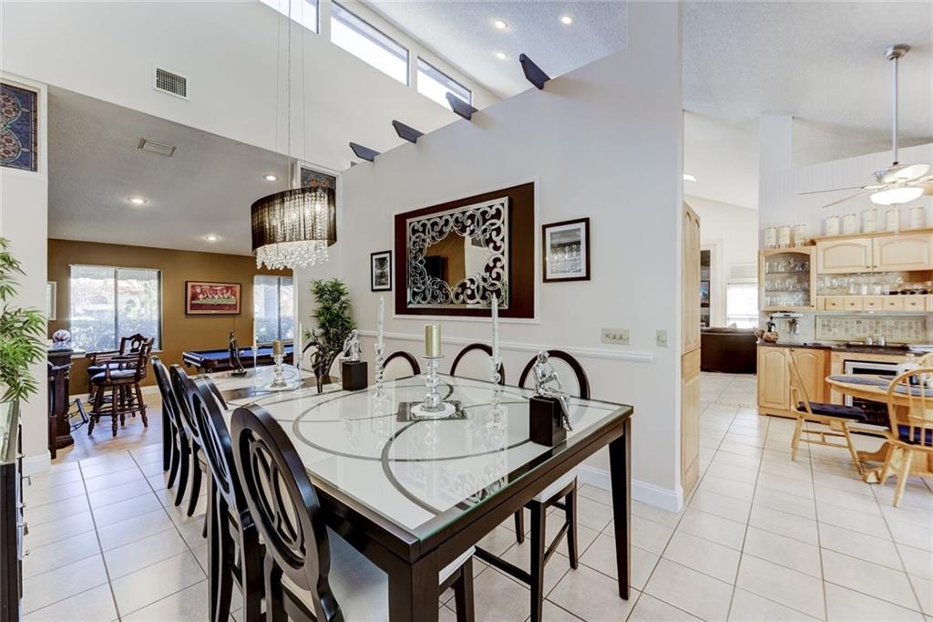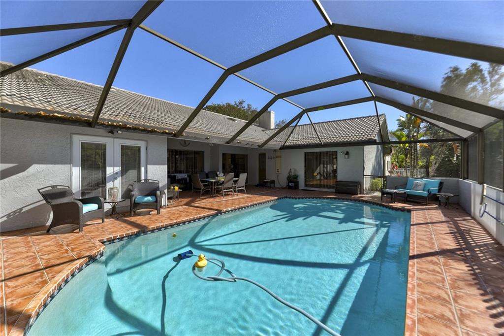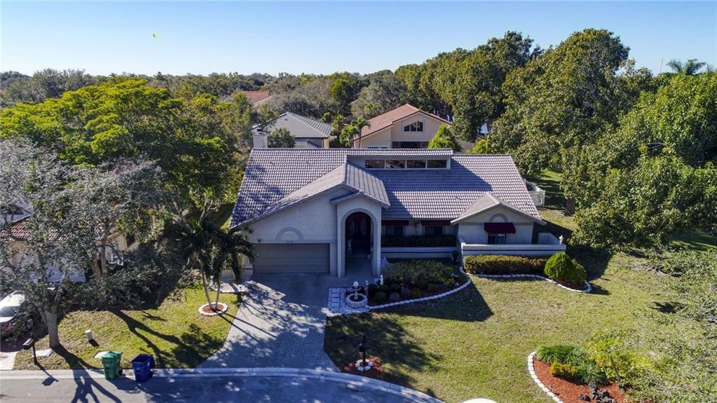 Impressive Contemporary Style Home situated on a Private cul de sac. This 4/2.5 Single Story Tranquil Retreat offers a Fantastic layout which includes a split-bedroom floor plan, Volume ceilings, Large Family room w/fireplace, Eat-in Kitchen w/tons of Cabinet space & New Appliances (2017), Large Owner's Suite w/his & her closets, updated bath & a bonus room perfect for an Office/Exercise Room/Nursery/Meditation Room. Add'l features include New Tiled floors & a Gorgeous Remodeled Cabana Bath (2017). The outside Oasis provides a play area adjacent to the screen enclosure, a Beautiful Sparkling Heated Pool, an Outdoor Shower (hot & cold water BRAND NEW 2018) AND an Outdoor Kitchen w/ a bar, Perfect for Serving and Entertaining! This Fantastic Home is in a Premier Guard Gated Golf community!