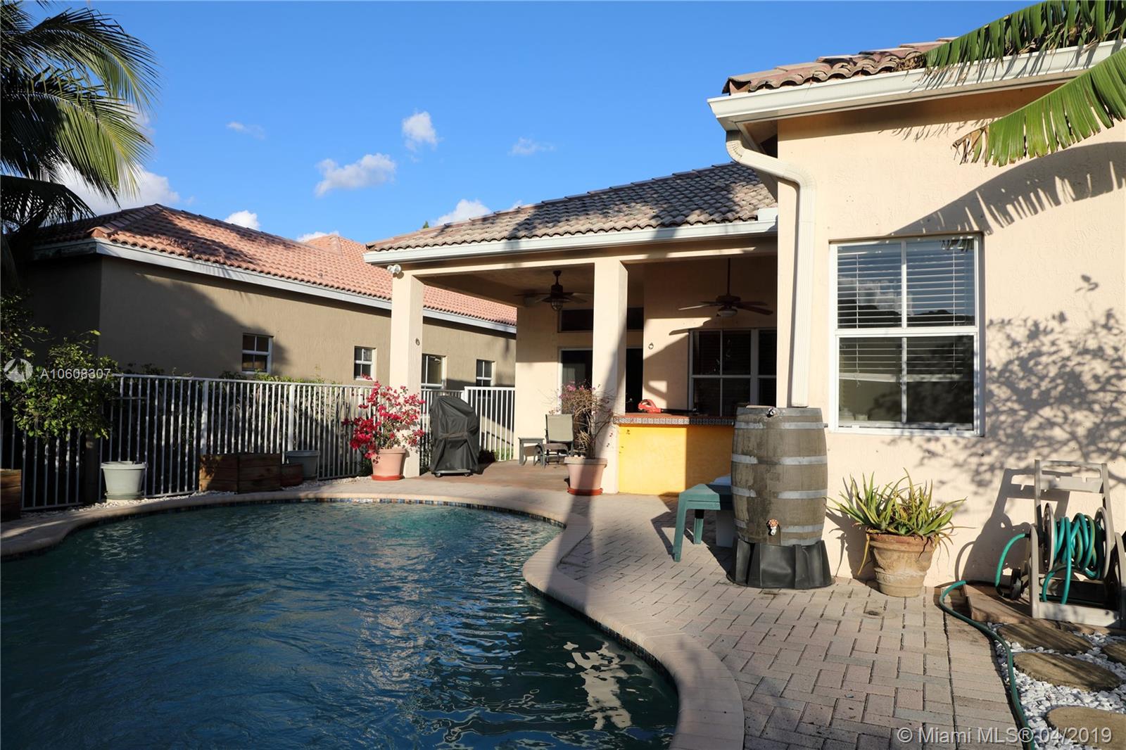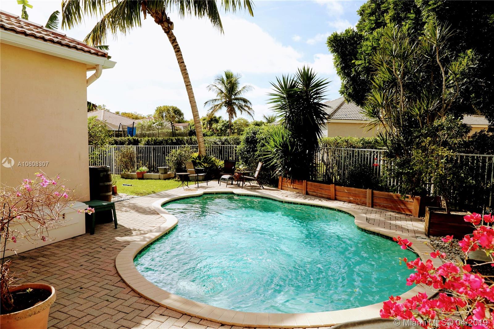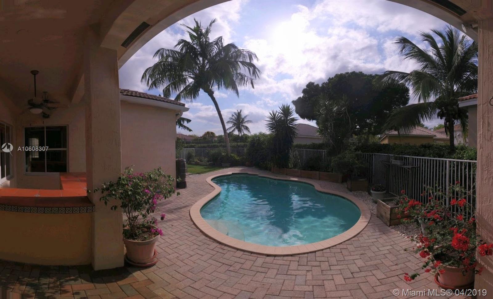 Florida Pool Home with beach style backyard in The Ridges, covered patio with bar. 3 beds, 2 bathrooms, palm trees, fruit trees, rainwater irrigation system, butterfly garden. Appliances have maintenance protection plans, crown moulding, new AC, fenced backyard. All the best Weston schools at walking distance: Everglades Elementary, Falcon Cove Middle School and Cypress Bay High School. Showing Time, call me and enter 4322 Foxtail Ln on YouTube for video and/or Google Maps for Virtual Tour. Moving date: March 25th.