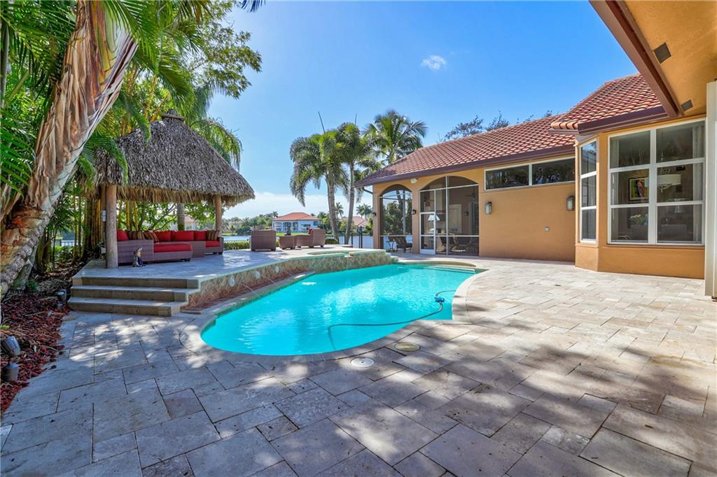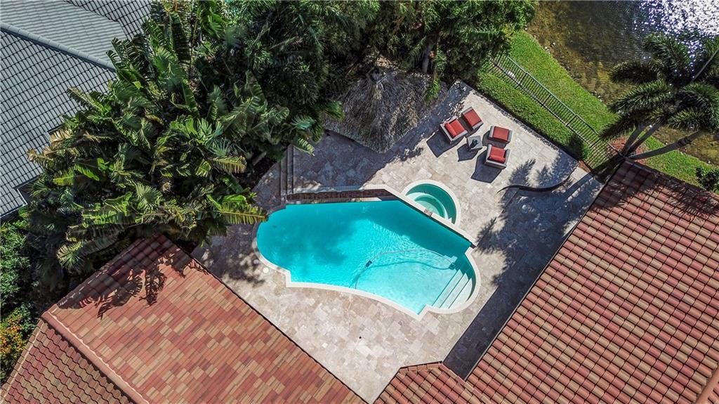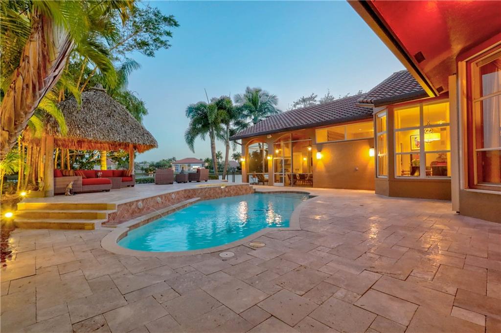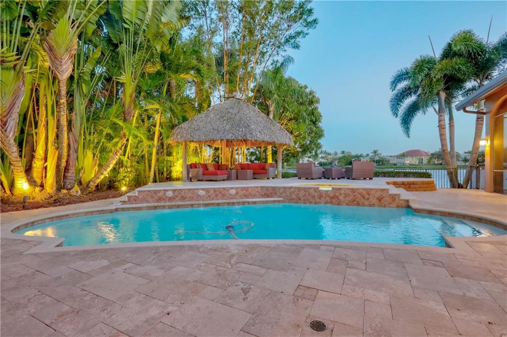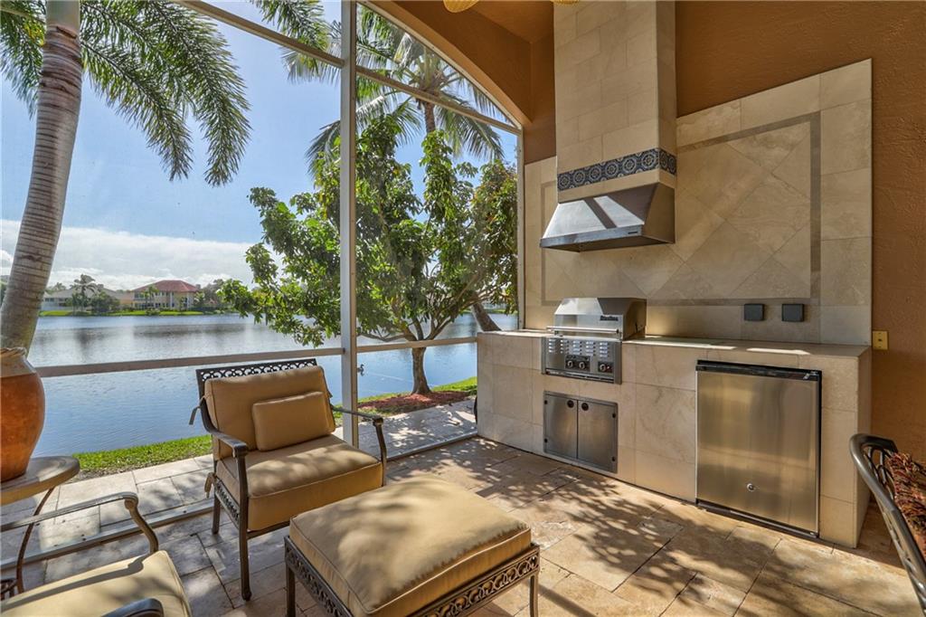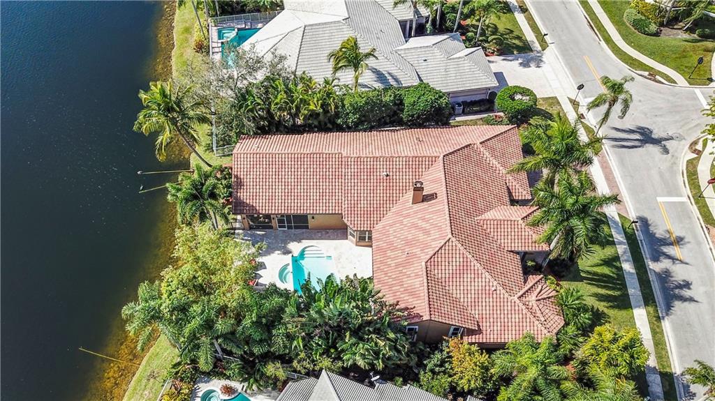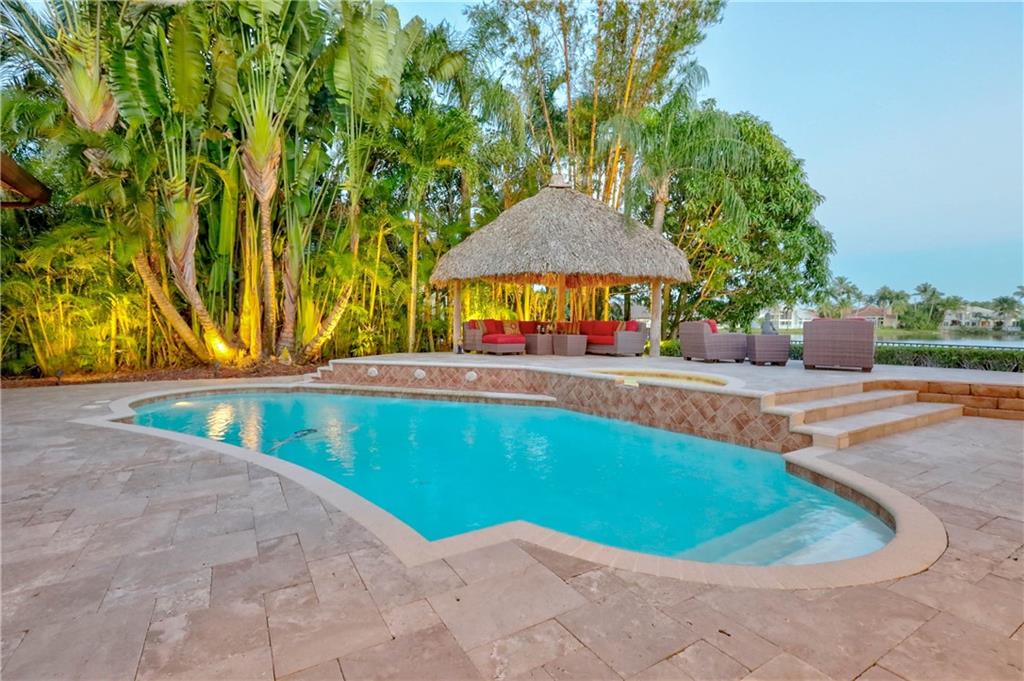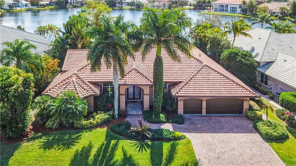 Gorgeous lakefront home in guard gated community of Plantation Palms! Over 4,000 square feet under air with 6 bedrooms/4 bathrooms. Triple split floor plan w/14' volume ceilings! Home features a beautiful kitchen w/wood cabinetry, granite counter tops, Jennair SS appliances, wine fridge & large pantry. Saturnia marble flooring in the main living areas. Wood flooring & porcelain tile in the bedrooms. Master suite includes two walk-in closets w/built-ins. Enjoy entertaining in the backyard which features stunning lake views, over sized pool deck w/travertine marble pavers & tiki hut. 330 sq ft screened in patio, outdoor kitchen with built-in BBQ grill & exhaust. Roof 2007. Impact rated garage doors. Zoned for A-rated Central Park Elementary!