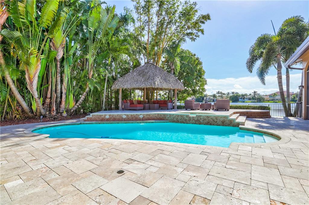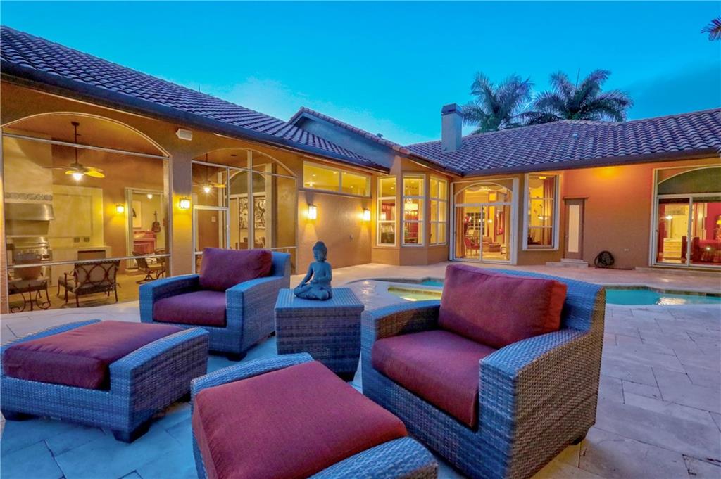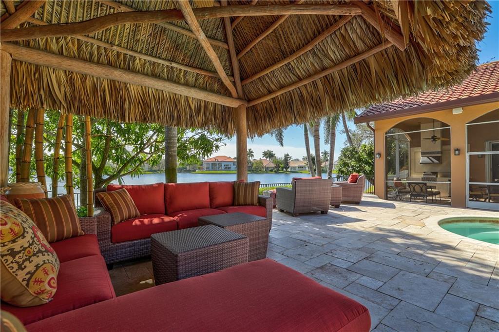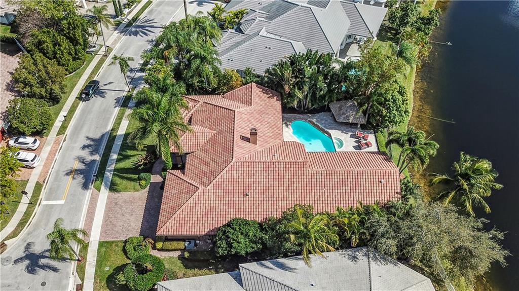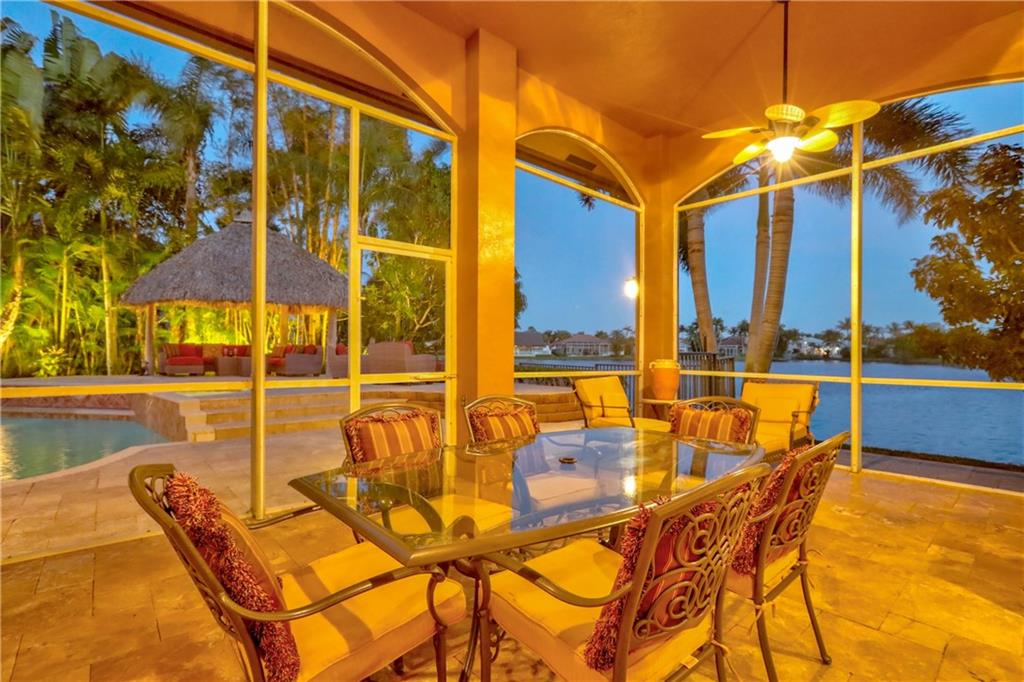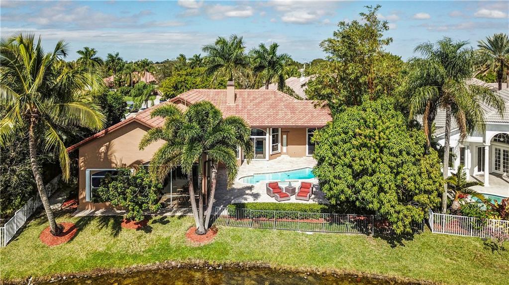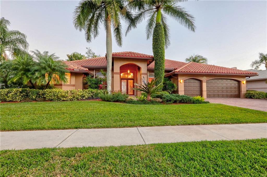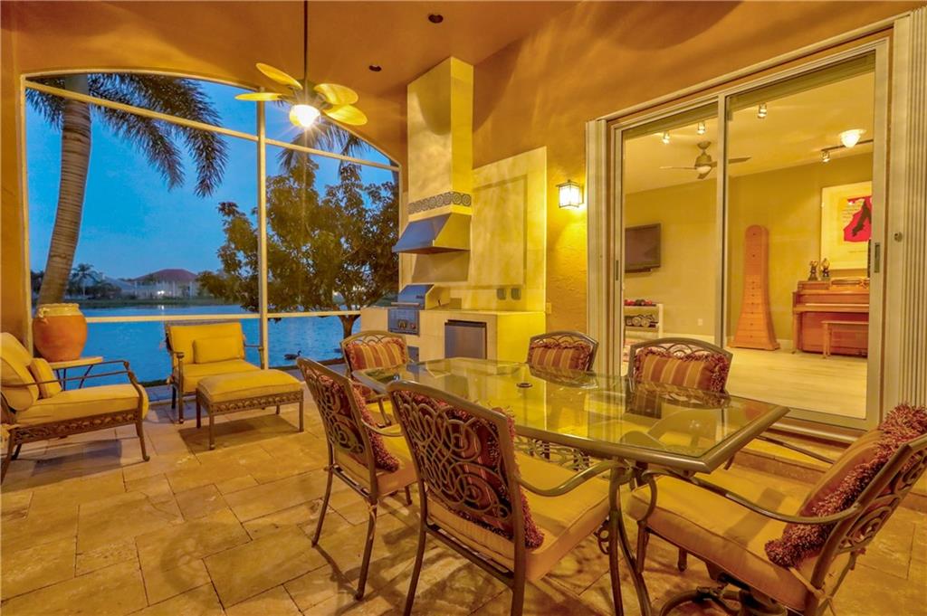 Gorgeous lakefront home in guard gated community of Plantation Palms! Over 4,000 square feet under air with 6 bedrooms/4 bathrooms. Triple split floor plan w/14' volume ceilings! Home features a beautiful kitchen w/wood cabinetry, granite counter tops, Jennair SS appliances, wine fridge & large pantry. Saturnia marble flooring in the main living areas. Wood flooring & porcelain tile in the bedrooms. Master suite includes two walk-in closets w/built-ins. Enjoy entertaining in the backyard which features stunning lake views, over sized pool deck w/travertine marble pavers & tiki hut. 330 sq ft screened in patio, outdoor kitchen with built-in BBQ grill & exhaust. Roof 2007. Impact rated garage doors. Zoned for A-rated Central Park Elementary!