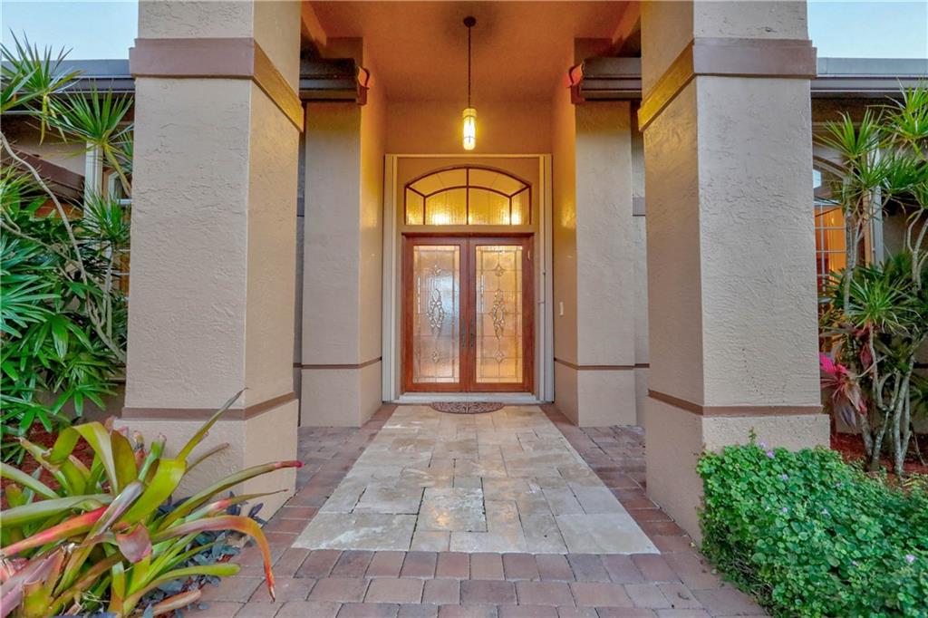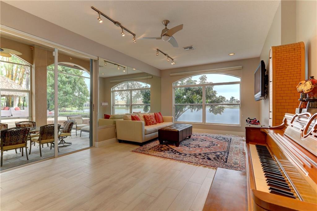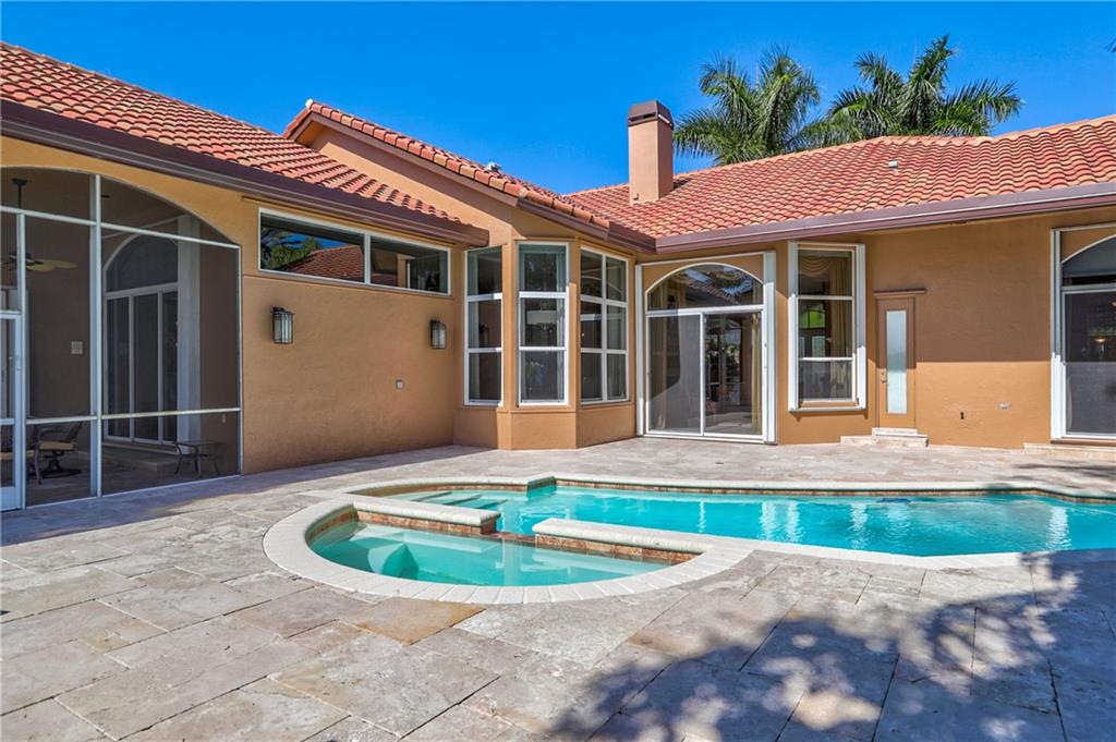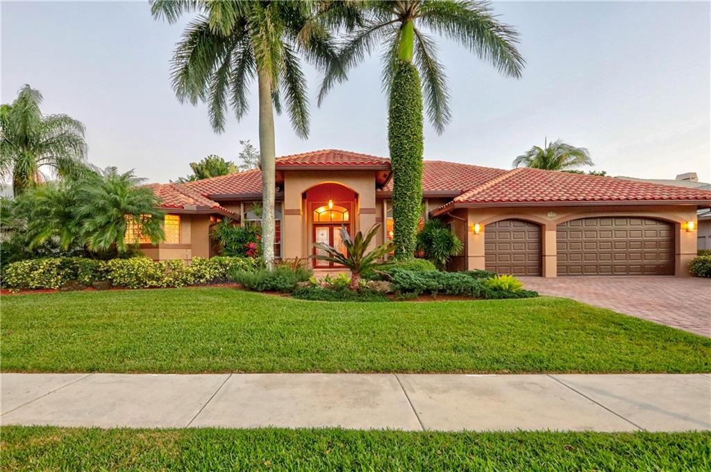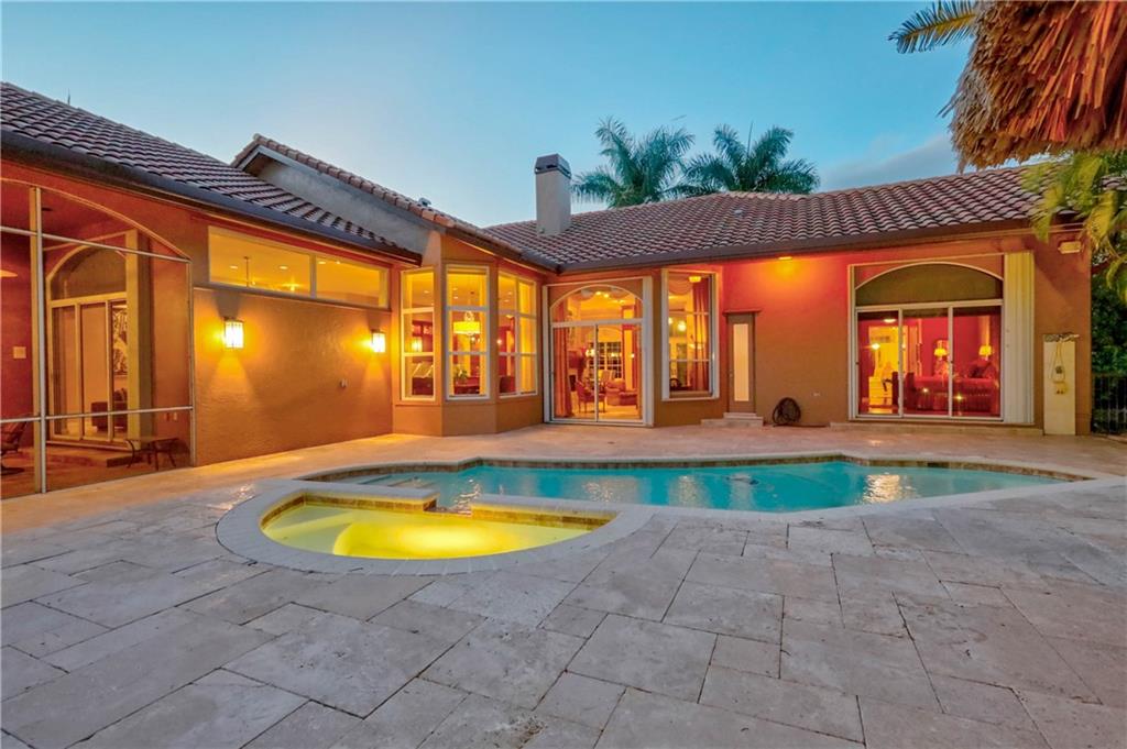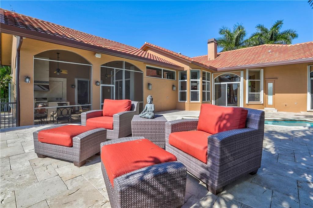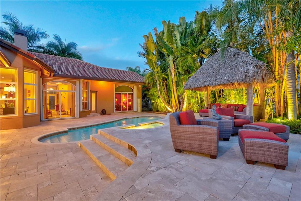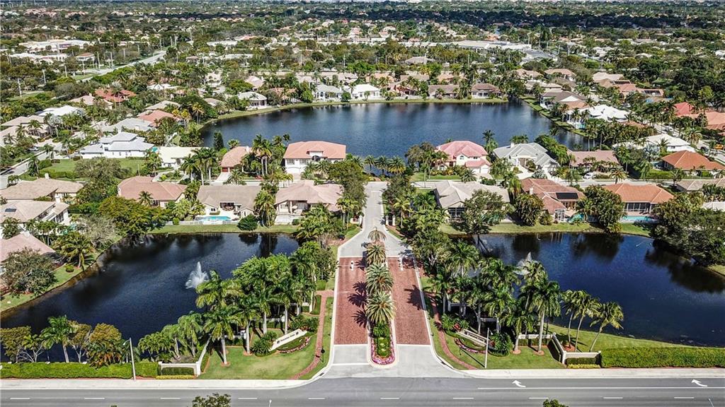 Gorgeous lakefront home in guard gated community of Plantation Palms! Over 4,000 square feet under air with 6 bedrooms/4 bathrooms. Triple split floor plan w/14' volume ceilings! Home features a beautiful kitchen w/wood cabinetry, granite counter tops, Jennair SS appliances, wine fridge & large pantry. Saturnia marble flooring in the main living areas. Wood flooring & porcelain tile in the bedrooms. Master suite includes two walk-in closets w/built-ins. Enjoy entertaining in the backyard which features stunning lake views, over sized pool deck w/travertine marble pavers & tiki hut. 330 sq ft screened in patio, outdoor kitchen with built-in BBQ grill & exhaust. Roof 2007. Impact rated garage doors. Zoned for A-rated Central Park Elementary!