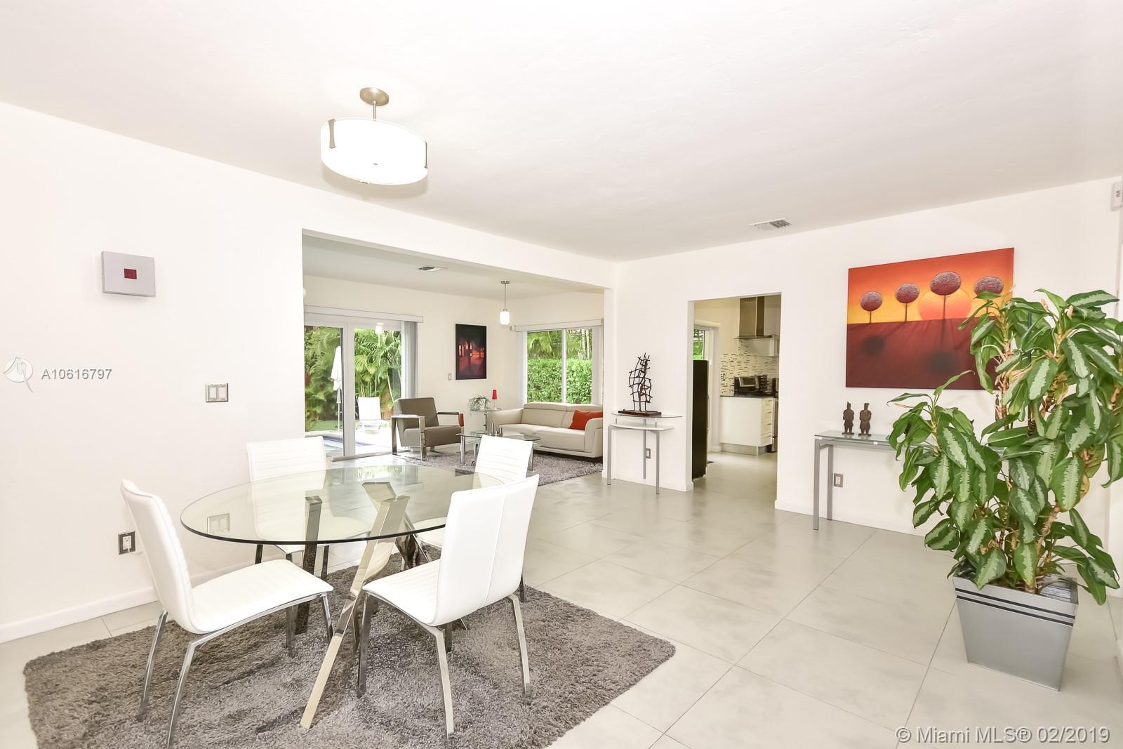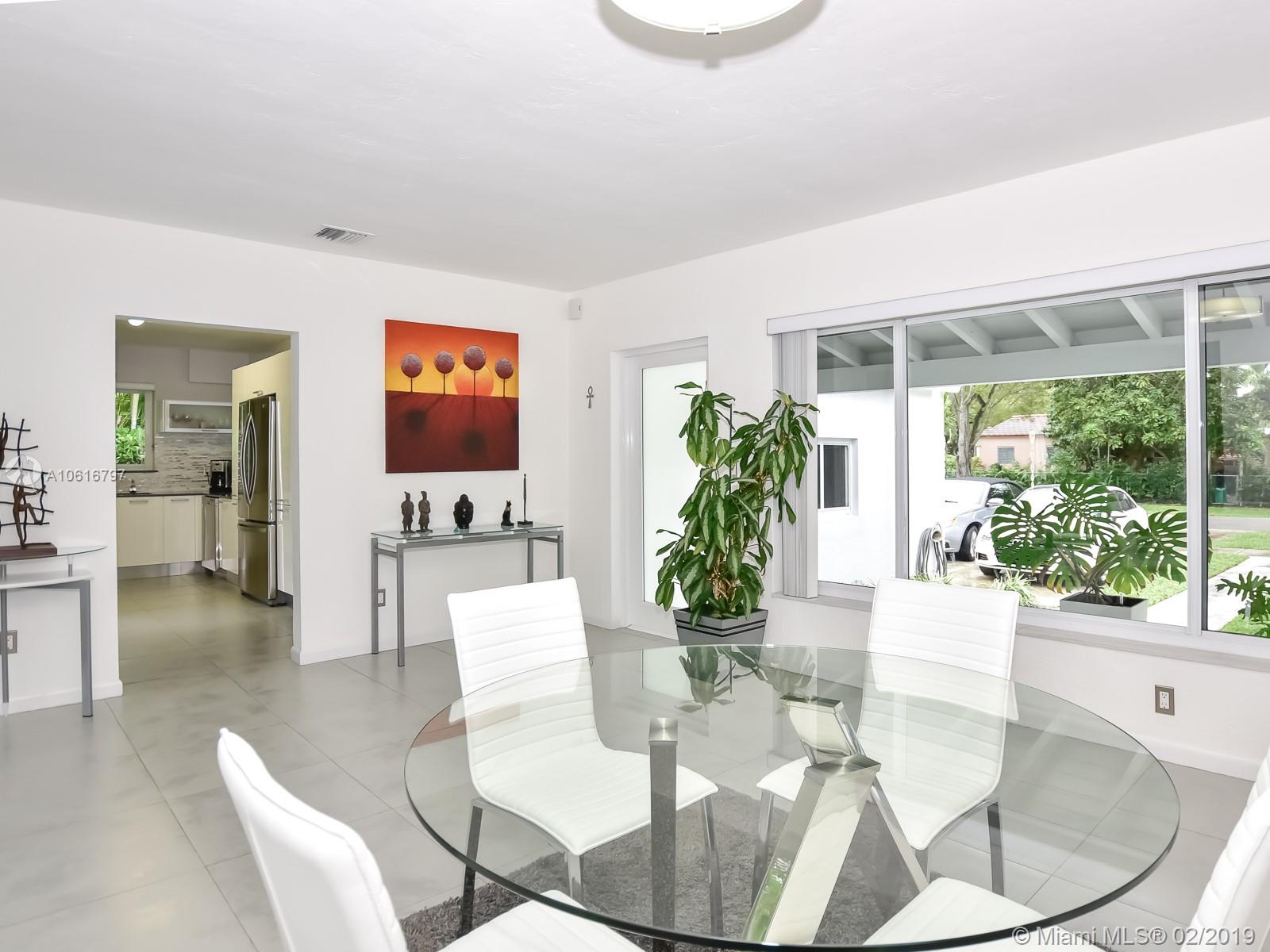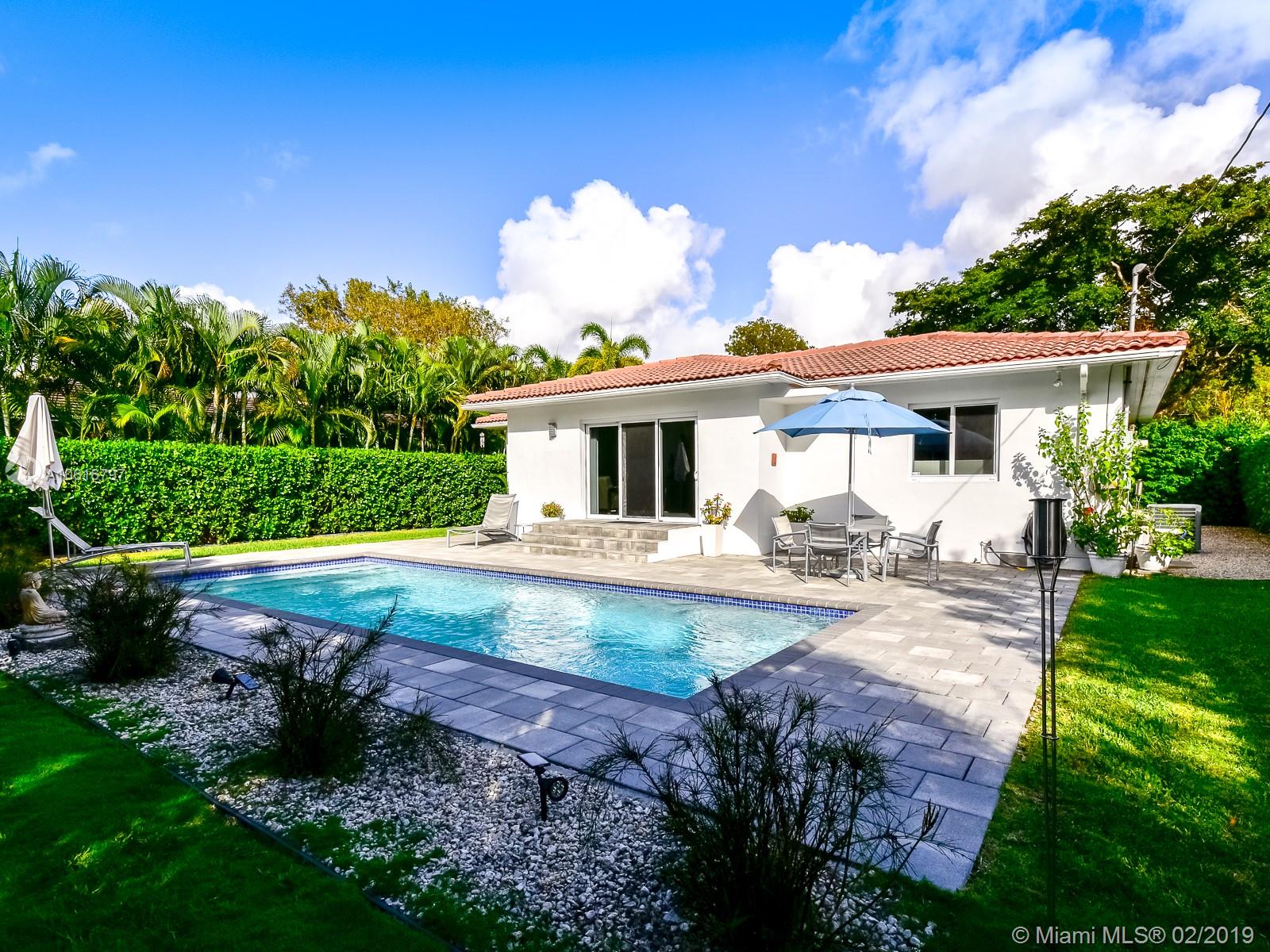 Meticulously remodeled with no expense spared! This delightful Mid Century 2 beds & 2 baths features a gorgeous kitchen with SS appliances and quartz counter tops that opens up to a spacious living room and backyard, new porcelain tile throughout, new bathrooms, spacious master suite with custom walk in closet, hurricane impact windows & doors and much more.Located on a quiet block in Miami Shores, the resort style backyard has been tastefully landscaped, has a salt water pool and a large patio which is perfect for an afternoon barbecue or to host a family gathering. Additional features include new plumbing, updated electric and a converted garage which is ideal for a home office or additional bedroom. Within walk-in distance to local shops, restaurants, the theater and much more.Turn Key!