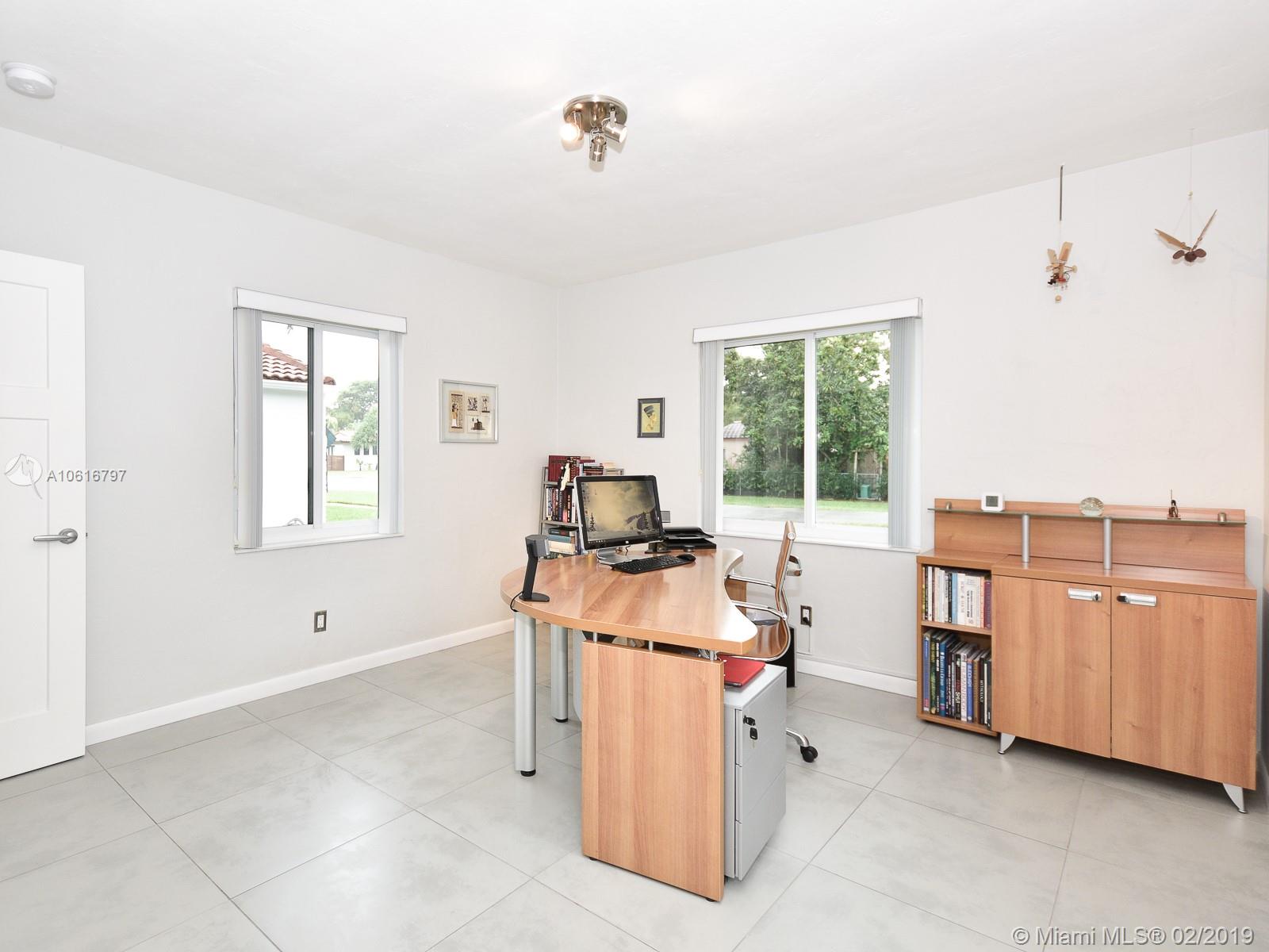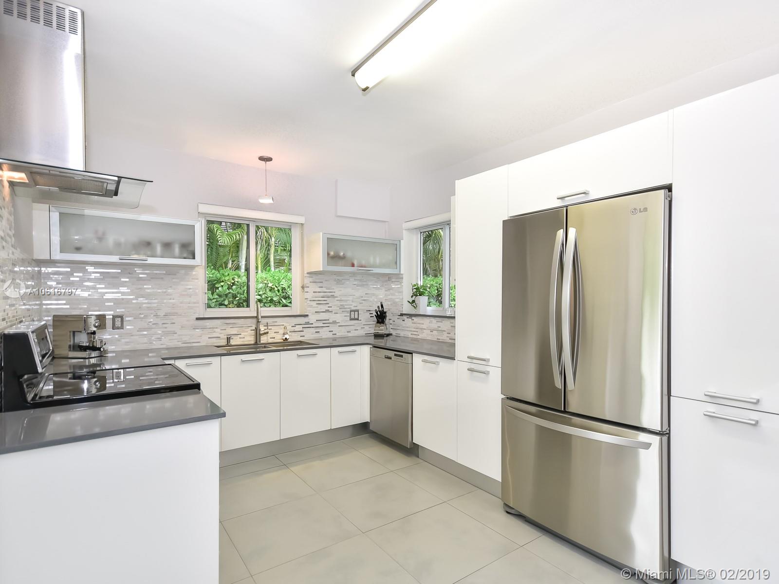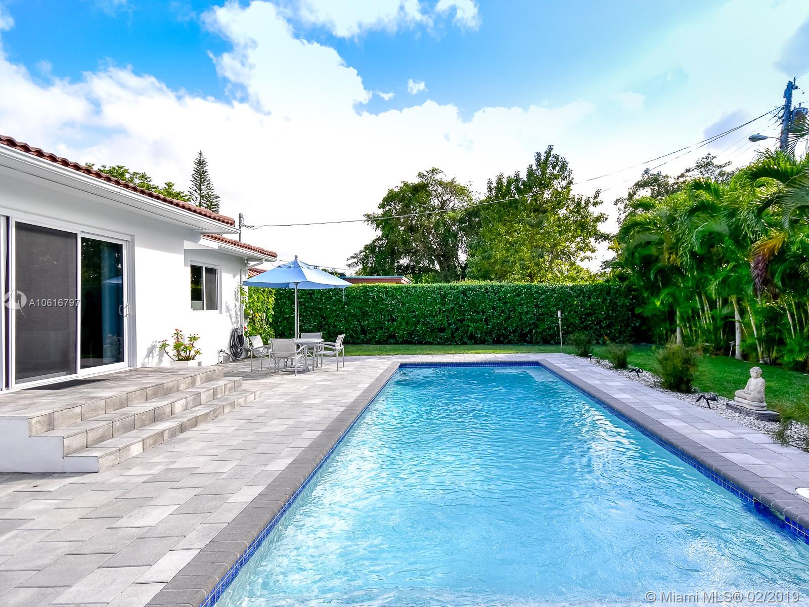 Meticulously remodeled with no expense spared! This delightful Mid Century 2 beds & 2 baths features a gorgeous kitchen with SS appliances and quartz counter tops that opens up to a spacious living room and backyard, new porcelain tile throughout, new bathrooms, spacious master suite with custom walk in closet, hurricane impact windows & doors and much more.Located on a quiet block in Miami Shores, the resort style backyard has been tastefully landscaped, has a salt water pool and a large patio which is perfect for an afternoon barbecue or to host a family gathering. Additional features include new plumbing, updated electric and a converted garage which is ideal for a home office or additional bedroom. Within walk-in distance to local shops, restaurants, the theater and much more.Turn Key!