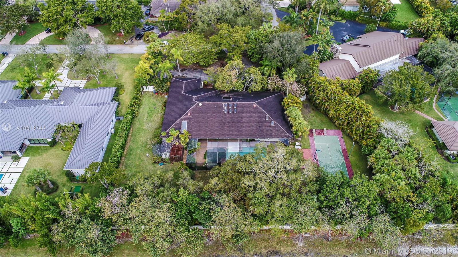 This home is tucked away on a lush 36,155 angled lot and priced with a creative buyer in mind. A unique opportunity to design a dream home inside the spacious floorplan with high wood vaulted ceilings and skylights. The Pine Bay Estates community of Coral Gables has a voluntary and quite active homeowners association and located close to public and prestigious private schools. Master suite and versatile space located on one side of house, 4 bedrooms and den on the other. In addition home has a formal dining room, kitchen opening to large family room, and screened pool area. House also has a sports court, impact windows (not doors), 4 AC's, areas with wood floors, and an indoor laundry room. Enjoy private serenity within walking distance to Pinecrest Gardens & Sunday Farmer's Market.