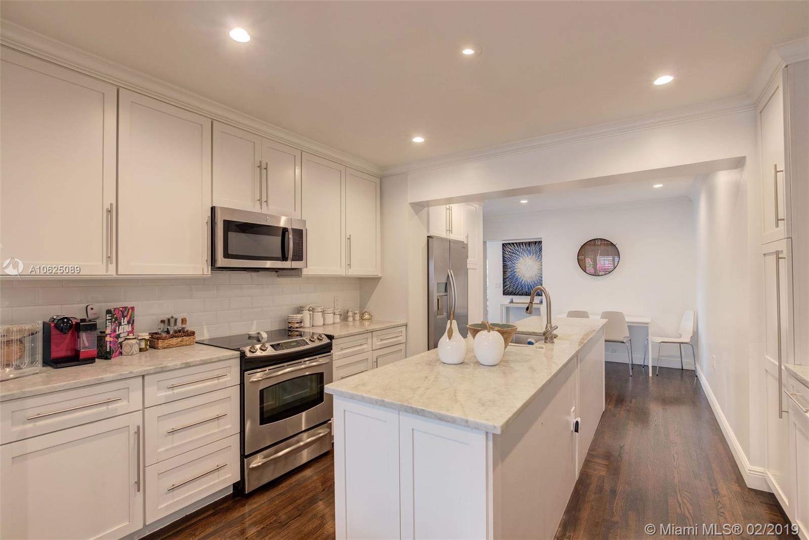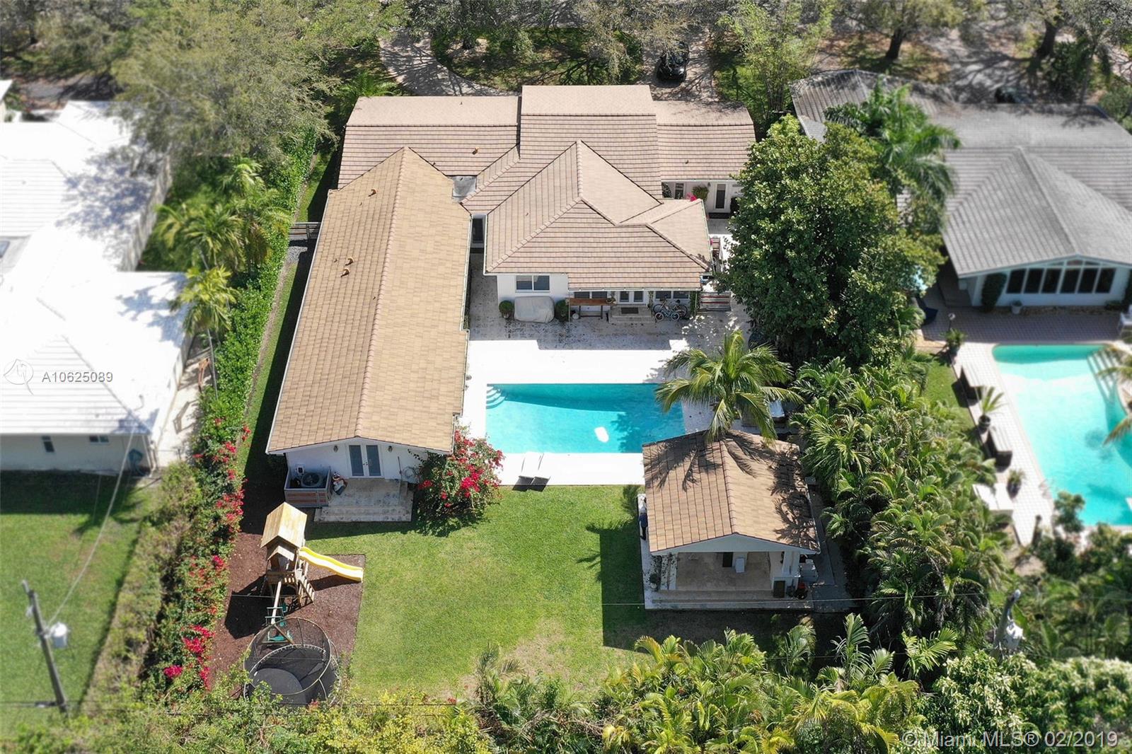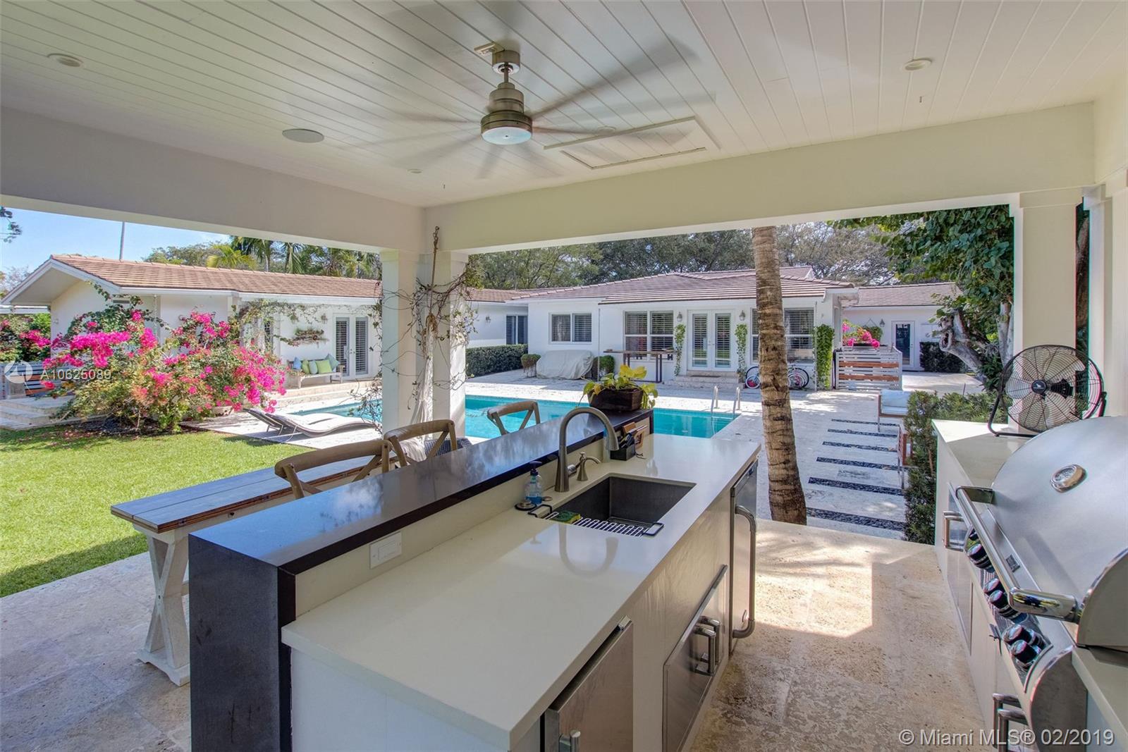 Relaxing ambiance defines this completely remodeled Plantation style home. Enjoy the beach house feeling as you enter the living/dining room, abundant natural light, white plantation shutters & beautiful garden/ pool/gazebo view. Elegant wood floors throughout the house, marble in living room, French doors open to the garden, high impact windows, comfortable floor plan, 5 bedrooms w/ private bath + a cabana bath. Kitchen connects two areas of the house, white wood cabinets with Carrara marble counter top, SS appliances & wine cooler. The summer kitchen by the pool is the perfect place to entertain any time of year, grill, refrigerator, ice maker & sink. Oversize lot, lush landscaping & gorgeous Bougainvillea.