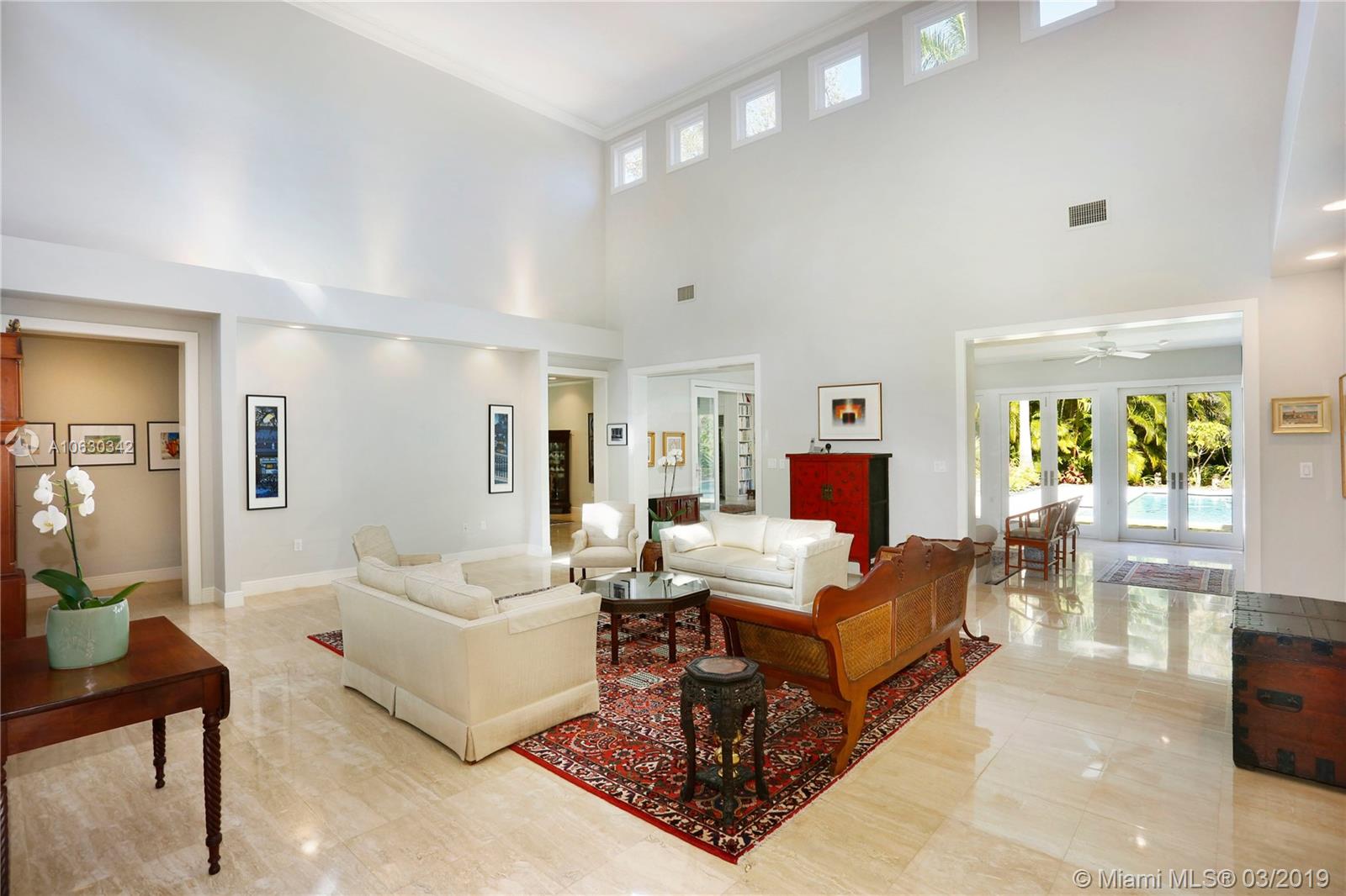 Absolutely beautiful home on private tree lined street in South Gables. This 5 bedroom, 6 bathroom home has been exquisitely updated including a newly enclosed family room, new gourmet kitchen, new master bathroom, full house generator, and impact glass windows and doors. Magnificent oaks and lush landscaping welcome you into this gated property and fabulous one story house with center great room with vaulted ceilings. Generous rooms and split plan make this home so wonderfully livable! The backyard features a newly resurfaced pool, covered patio and outdoor summer kitchen with cabana bath, all on the most private 27,000+ square foot lot. 2 car garage, laundry room, gym, and Pinecrest Elementary!