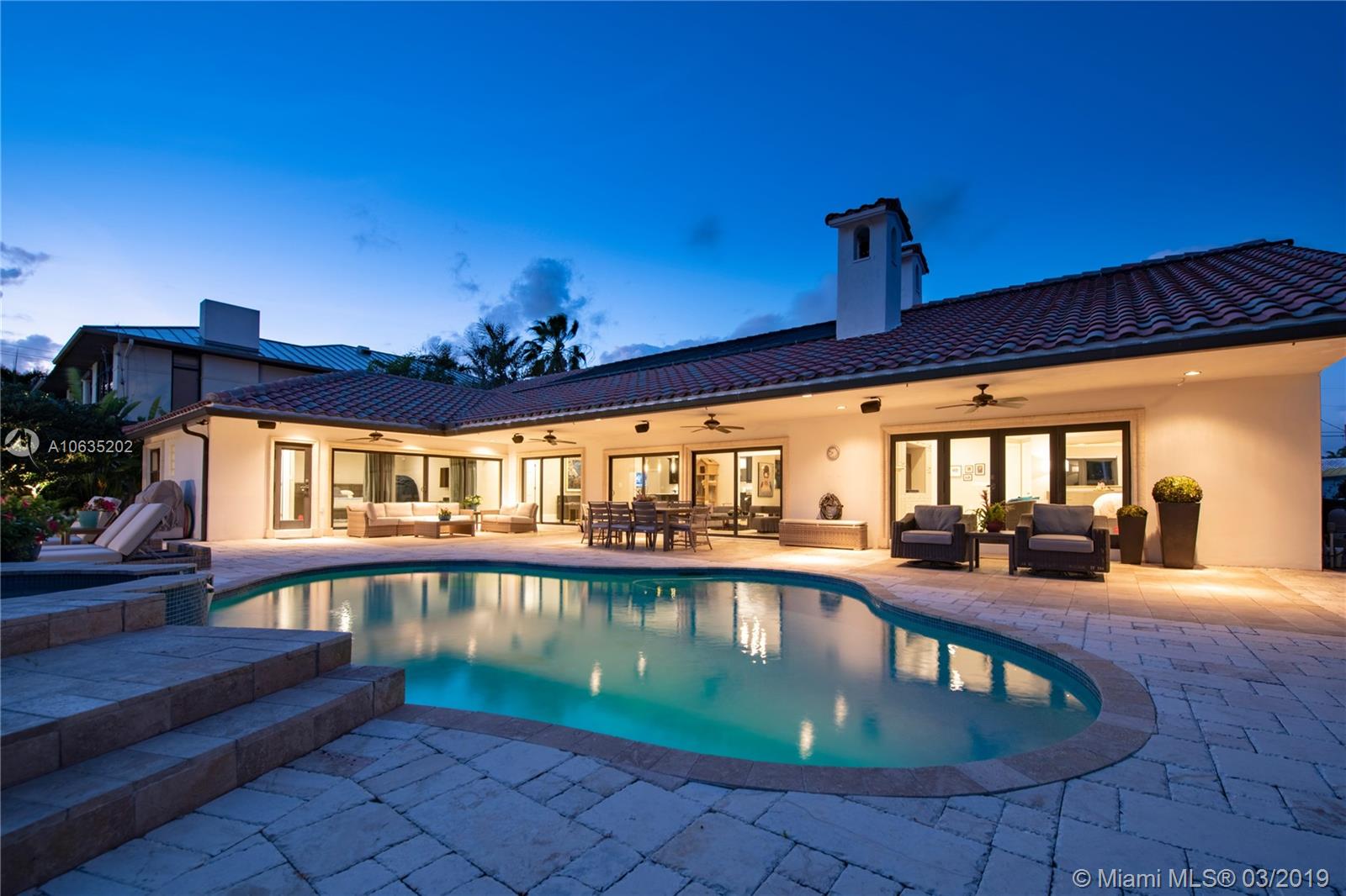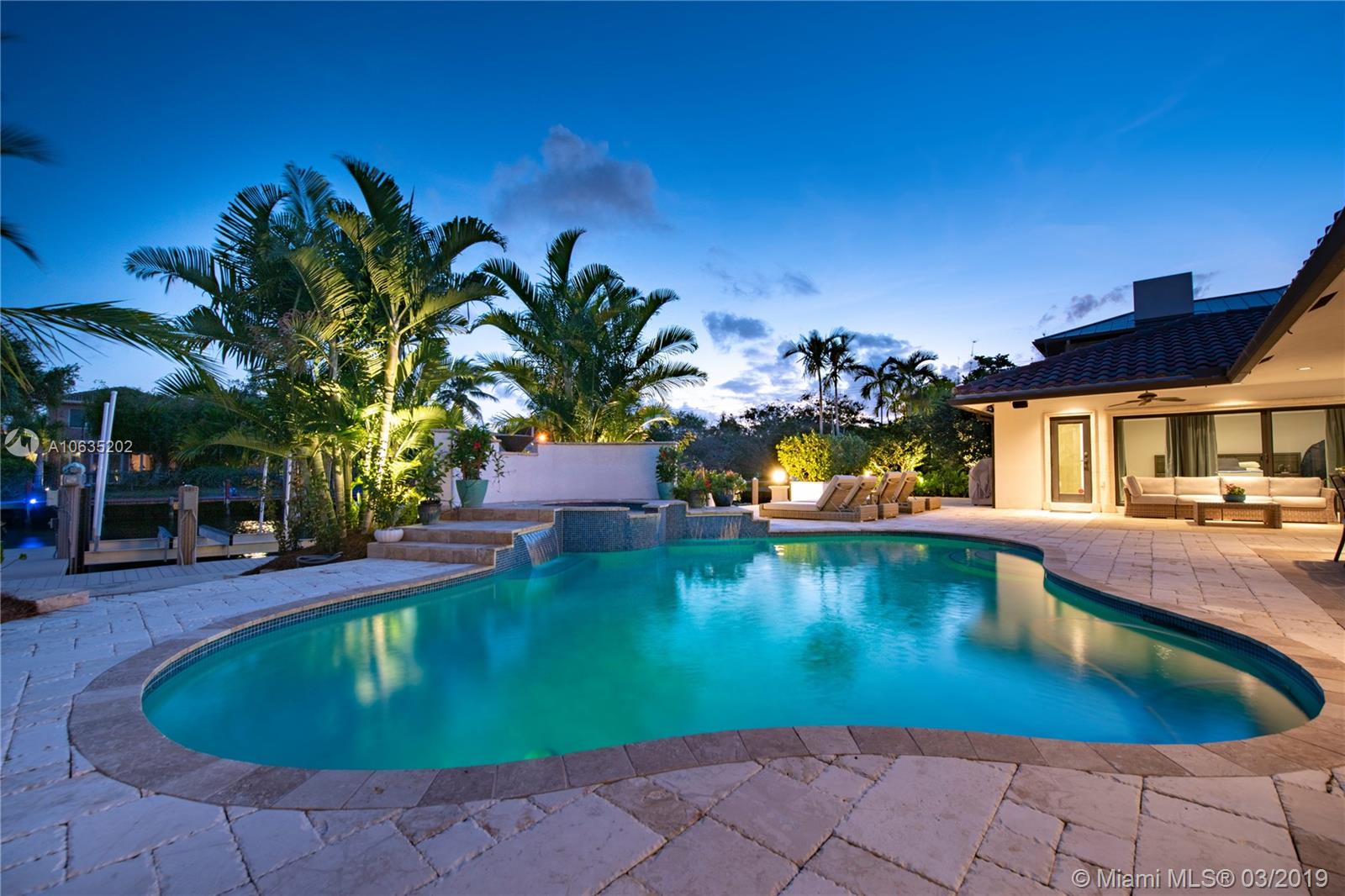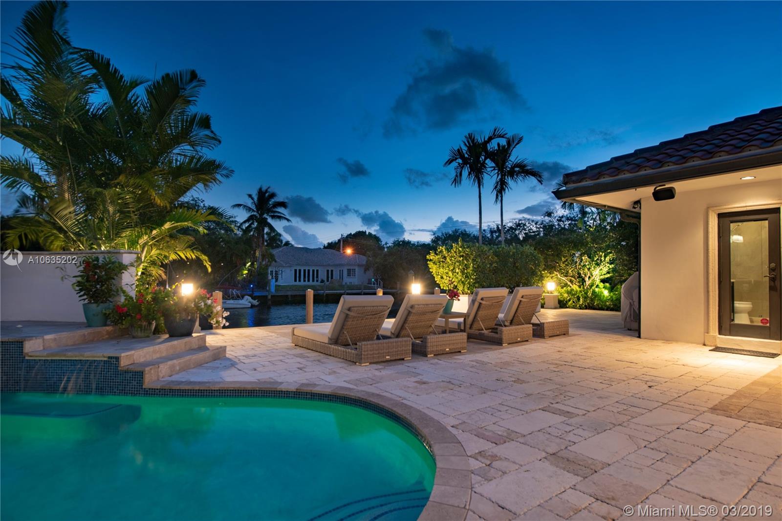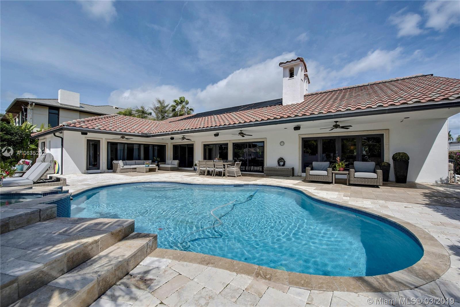 Open floorpan in this Spanish style updated home, all in one story! Large master bedroom with it's own a/c, his and hers closet. Master bath with double sinks, jacuzzi, huge shower for two with rain head, towel warmer and electric Toto toilet. Kitchen is well equipped with induction cooktop, ice maker, Subzero fridge and wine cooler, large granite island counter for entertaining. Control4 home automation system with gate and front door cameras for safety and entry! Two stone wood burning fireplaces. Lot is 125' deep so it allows for large backyard with lagoon style pool with waterfall spa. Dock is 100', has shore power and 16,000 pound boat lift. Walled and gated residence with Chicago brick circular driveway, lush landscape and outdoor lighting.