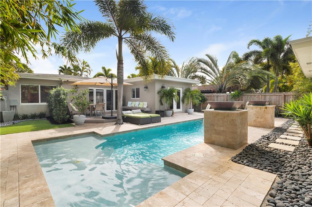 Welcome home to a tropical oasis of serenity, inspired by lush landscaping, cascading water features & a salt water pool & spa. This updated home is situated in E. Fort Lauderdale's desirable subdivision of Poinsettia Heights. The luminous open floor plan is conducive to today's lifestyle with hurricane impact windows & doors that seamlessly integrate indoor & outdoor living spaces. The gourmet kitchen offers tremendous counter space ideal for entertaining & opens onto the dining area & great room. The master suite & lavish bathroom provide the ultimate retreat. A separate air conditioned studio/office is only steps from the main house. A fenced & private front yard, sun deck overlooking the pool & spa & outside living area complete the private allure of this residence. Sq ft from IMAPP