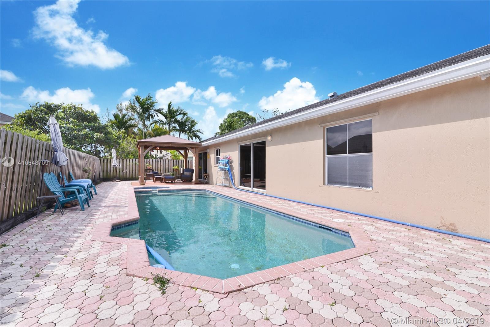 Best Priced Pool Home in Davie! This 4/2 pool home in Country Creek Estates is PRICED TO SELL. This home is beautifully landscaped with great drive up curb appeal. This home is great for entertaining! Enjoy the privacy of the fenced in backyard swimming in the pool, enjoying the spa or relaxing in the lanai. The split floor plan adds to the spacious feel. The kitchen overlooking the pool has newer appliances. The master bedroom has a large walk in closet; master bath has dual sinks and tub/shower combo. Guest bath has a remodeled step in shower. Vaulted ceilings, tile and laminate throughout. Utility room has a full size washer and dryer. Low HOA $270 per quarter! Monitored alarm system with 8 security cameras. Newer AC 2015 with Nest Thermostat. Roof 2006. Close to NSU.