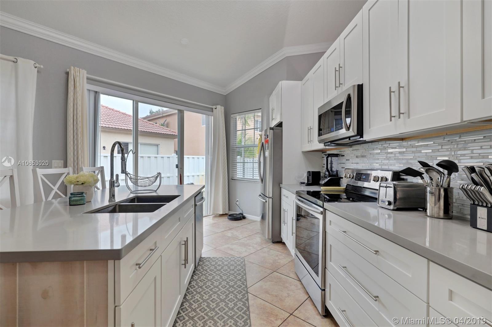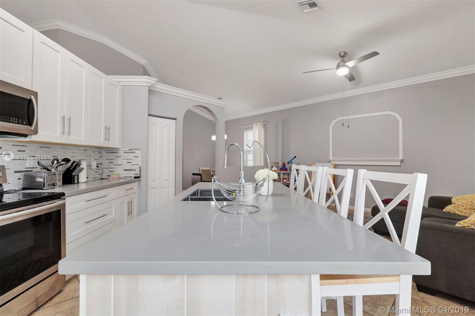 Enjoy the comfort of this well maintained home with 3BR/2BA and 2-car garage in the highly sought after Monarch Lakes community. In this split bedroom plan home, you’ll find a living area with neutral colored tiled floors and a stunning white kitchen equipped with stainless steel appliances, Quartz counter tops, and large island with storage and seating for 4. You will also find a formal living room, dining room, as well as a family room off of the open kitchen. On one side of the home, you will find the master bedroom with two walk-in closets and master bath with dual sinks, garden tub and separate shower. On the opposite side, two space bedrooms and remodeled full bathroom. The outdoor space includes a covered patio. Great community with low HOA dues of $125.