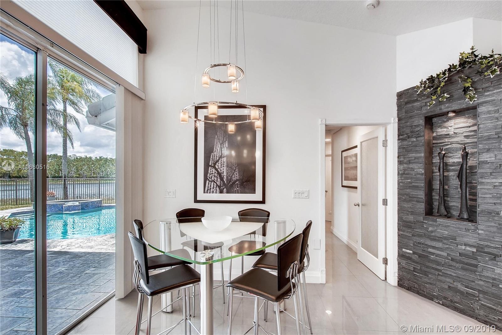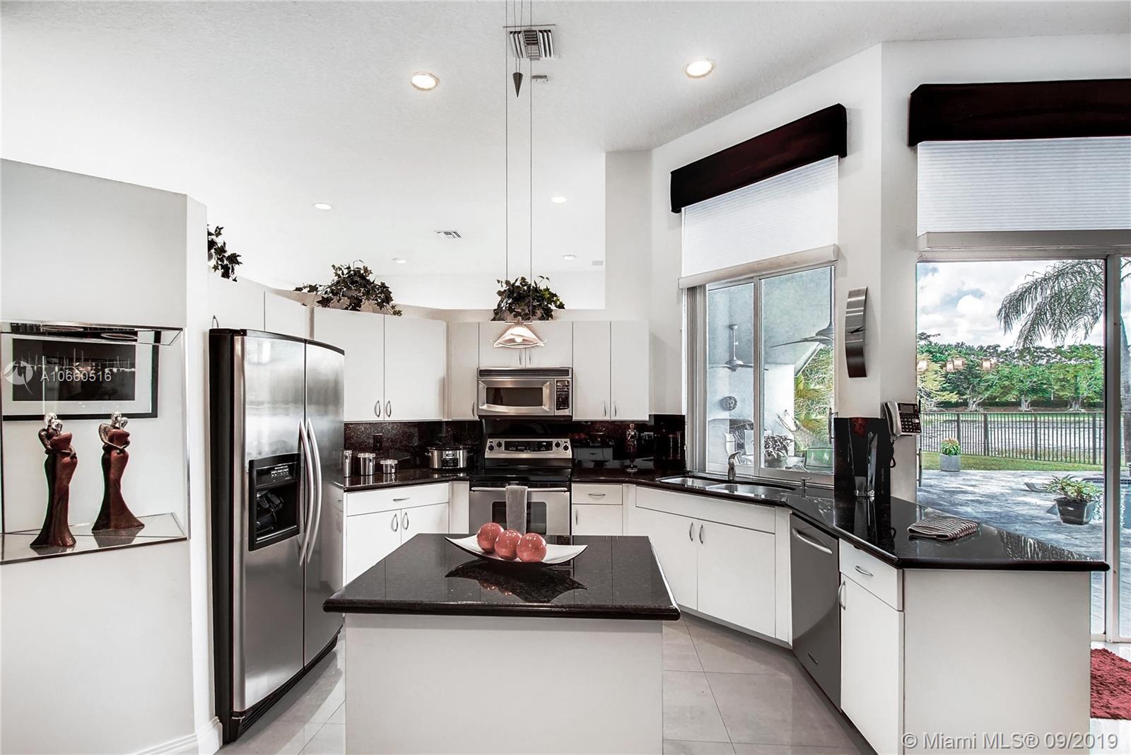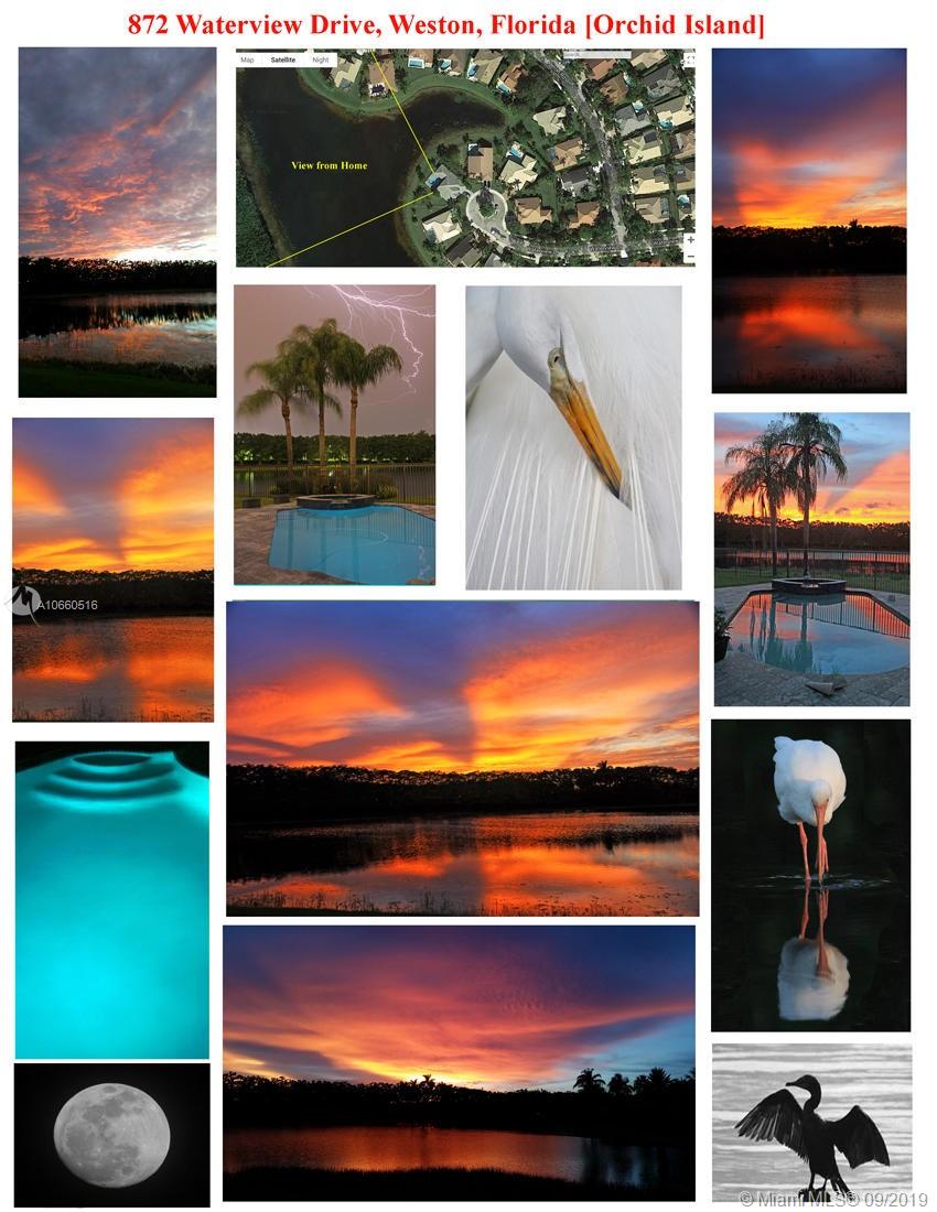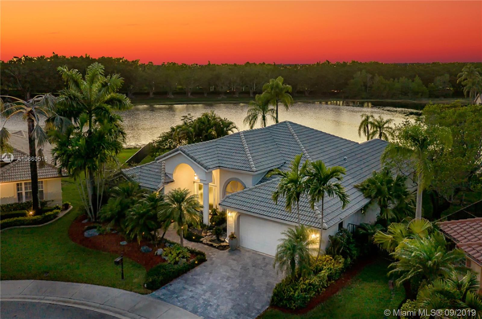 LUXURIOUS WESTON WIDEST (Sunset) LAKE VIEW HOME: ORCHID ISLAND w/community tennis, basketball & playground. Cul-de-sac, exotic landscaping, marble pavers front & back. 18" glass-like Porcelain tiles throughout, granite tops, marble master bath, stainless steel sinks & appliances. ROOF: 2007. Stone entertainment wall, 71' TV surround sound, music, intercom throughout. Each window & door alarmed + motion, fire & smoke sensors. Huge side yard, 16,101 sq. ft. Pie-shaped lot. Waterfall pool faces directly west for year-round sunsets. Large Jacuzzi tub in Master, single Jacuzzi in the second bathroom. Toilets are all Kohler & separated by doors for privacy. All closets have systems. TURNKEY.