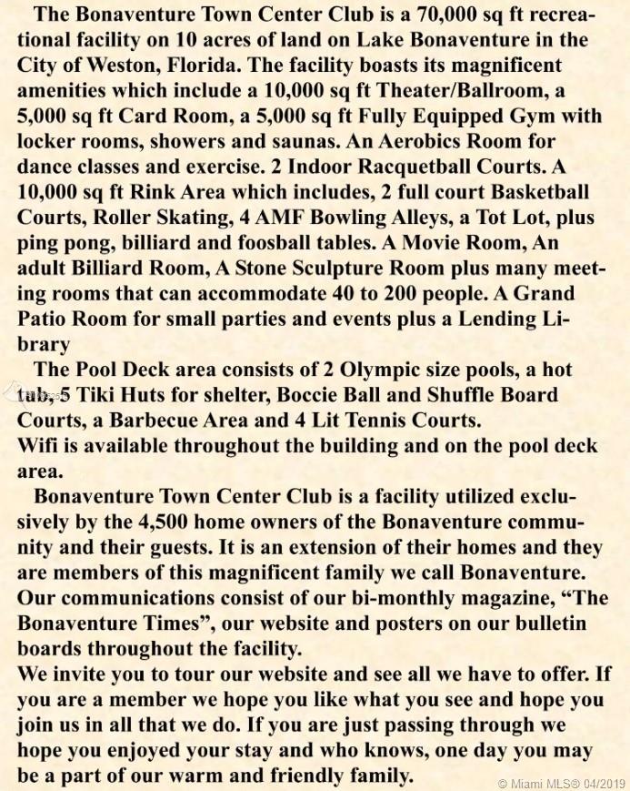 Perfect 2 bed 2.5 bath home in sought after Coconuts at Bonaventure. This home has been well maintained by sellers and in a great location with Top schools in the area. Updated Appliances, tile flooring on the bottom and wood laminate on the second floor. Close to major highways for easy commute to work or the beaches for some rest and relaxation. Nicely maintained, quiet community in Weston near all restaurants, shopping and major highways. HOA covers lawn maintenance, basic cable, common area, trash, and roof repairs. Bonaventure Town Center offers an amazing club house with all the amenities anyone could want from clubhouses, card rooms, multiple pools, bowling, tennis, basketball, gym, and more. Annual membership of $285 annually.