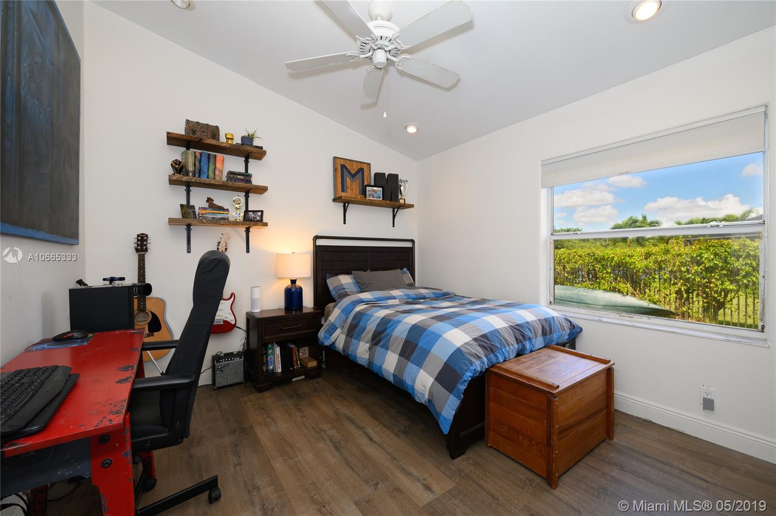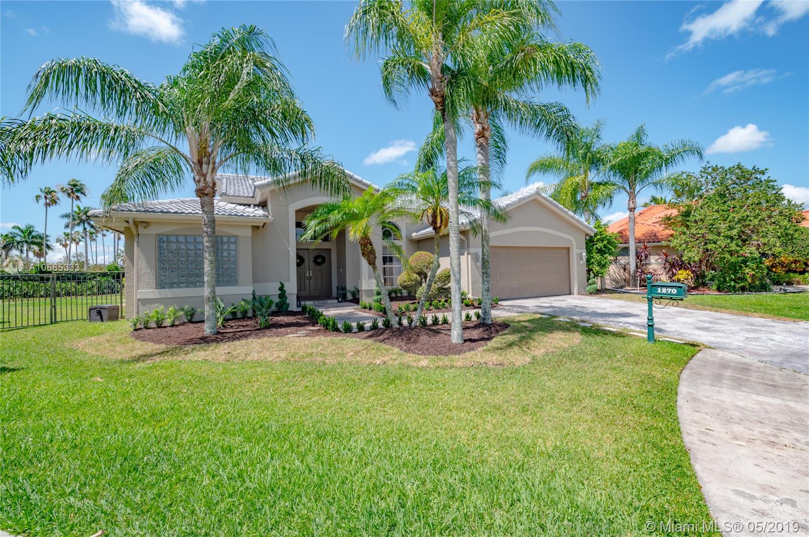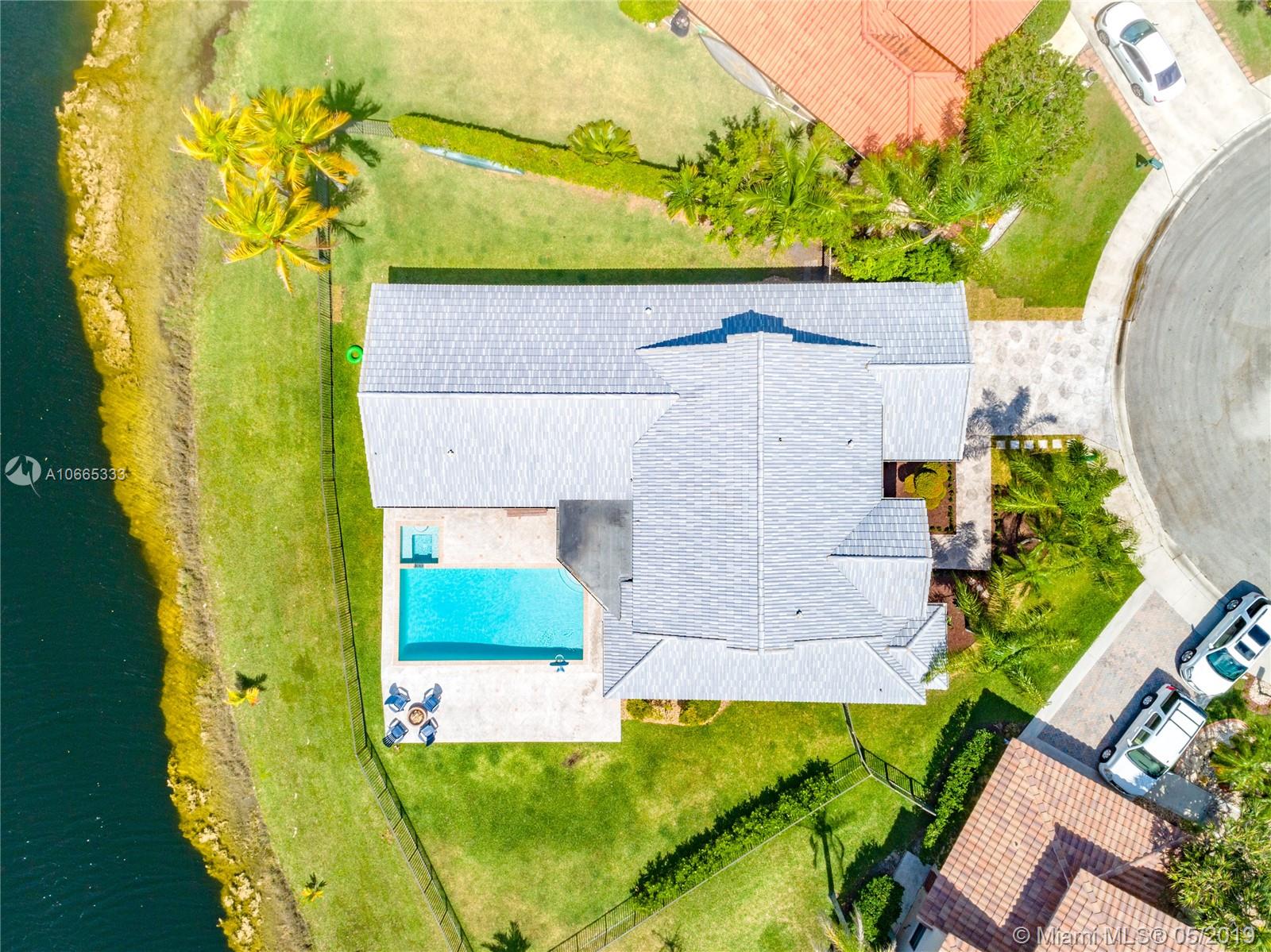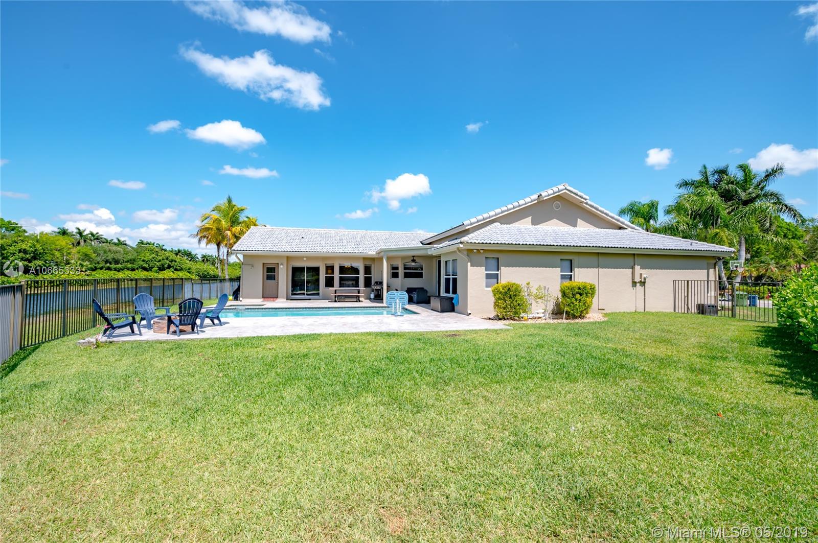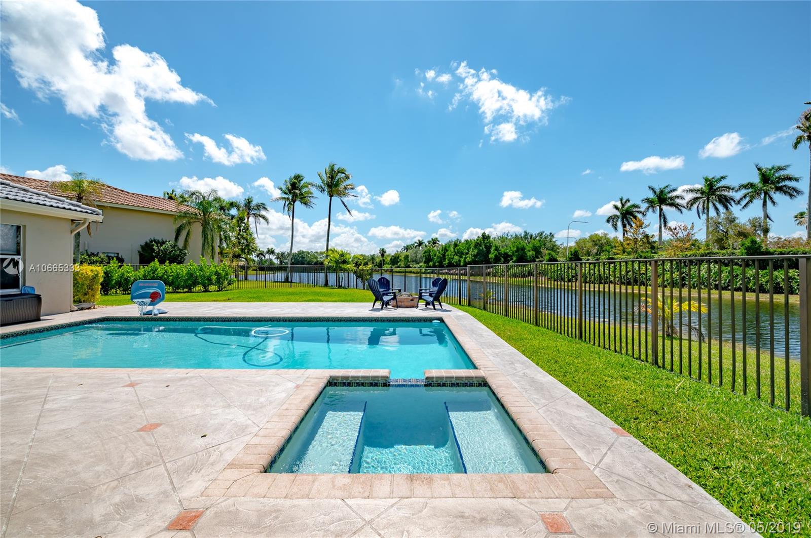 Inviting grand lot in Cul de Sac in exquisite gated Sunset Springs. Captivating water views from the moment you enter. Timeless sunsets. Nicely renovated, many upgrades! New roof, less than 6 years old, 2 A/C units approximately 5 years old, large pool with Spa with newer pool heater and motor. Bathrooms newly renovated. New floors throughout the house, popcorn ceiling removed. Kitchen with all stainless steel appliances almost new, granite countertops. Serene landscape, freshly updated. Biggest one story four bedrooms, 2.5 baths in the community. A+ school. Community has tennis and basketball courts, playground. Ready to move in!