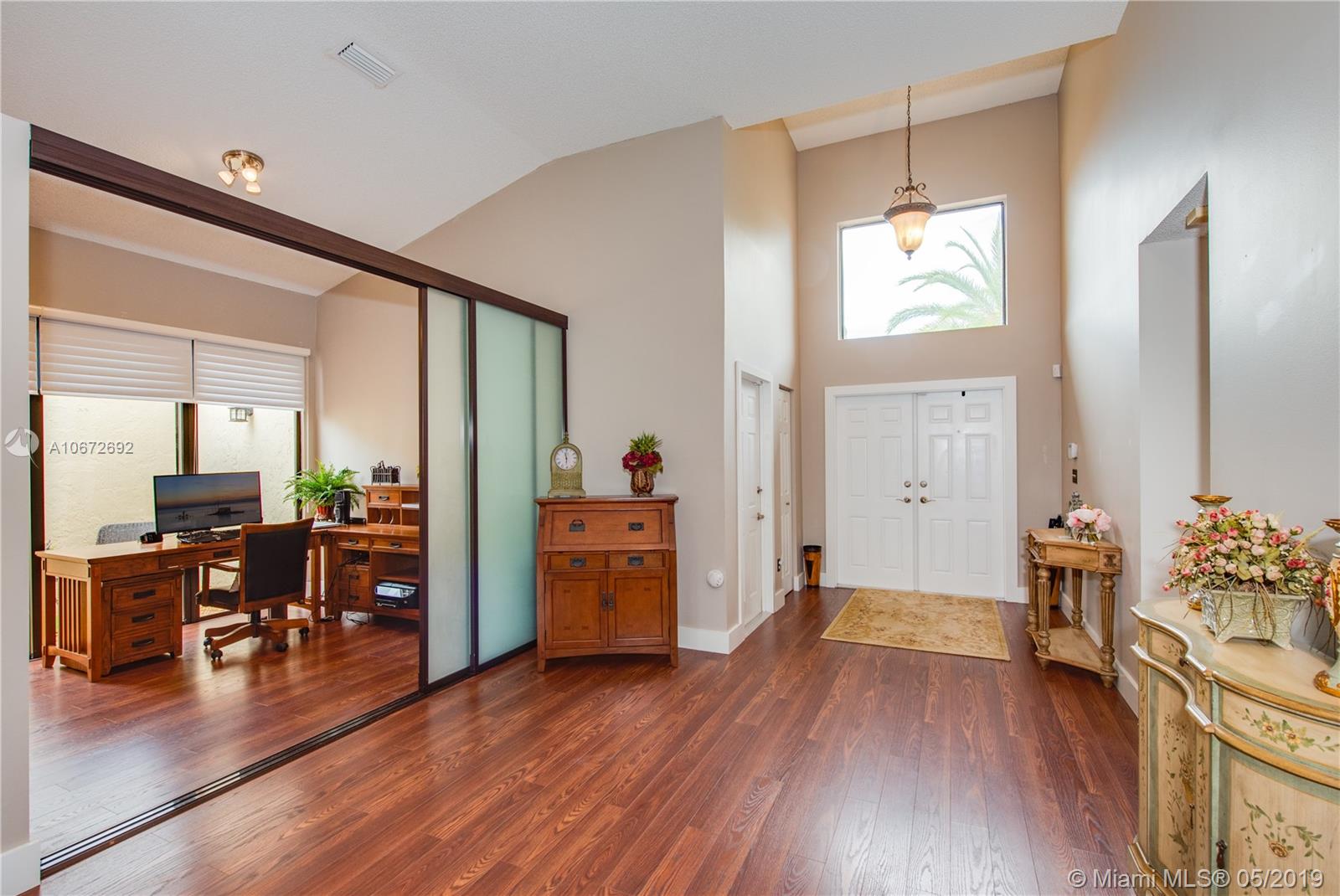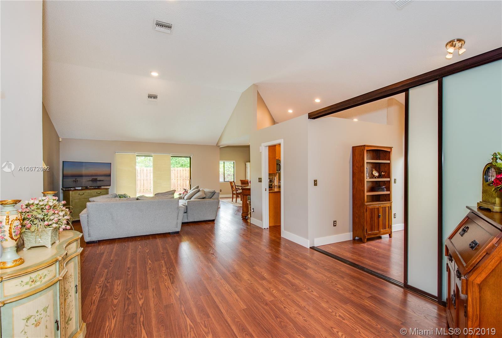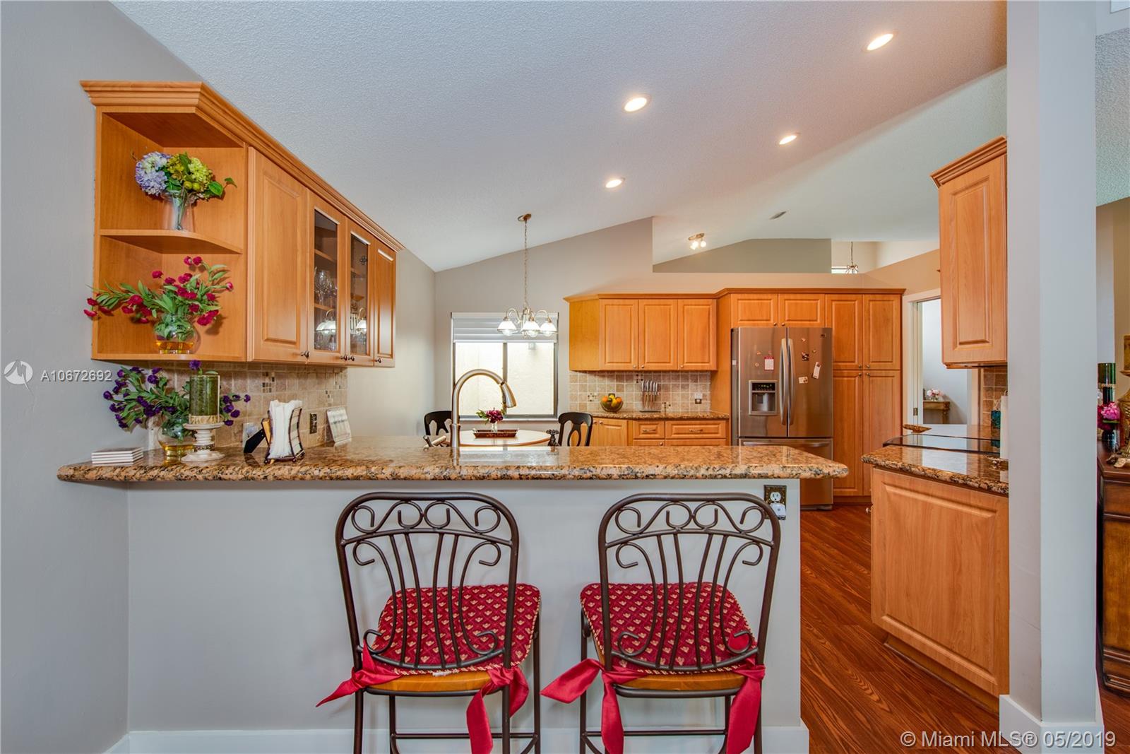 Picture perfect 3/2 with office. This is a unique home with the atrium converted to interior office space for added under air square footage. Loaded with upgrades including beautiful kitchen, highly upgraded baths and gorgeous laminate flooring. Flowing open layout with lots of natural light from the many windows and soaring ceilings. Private fenced yard and large covered patio. Roof 2.5 years old. Quaint Pembroke Pines neighborhood right across street from excellent elementary school. Great location.