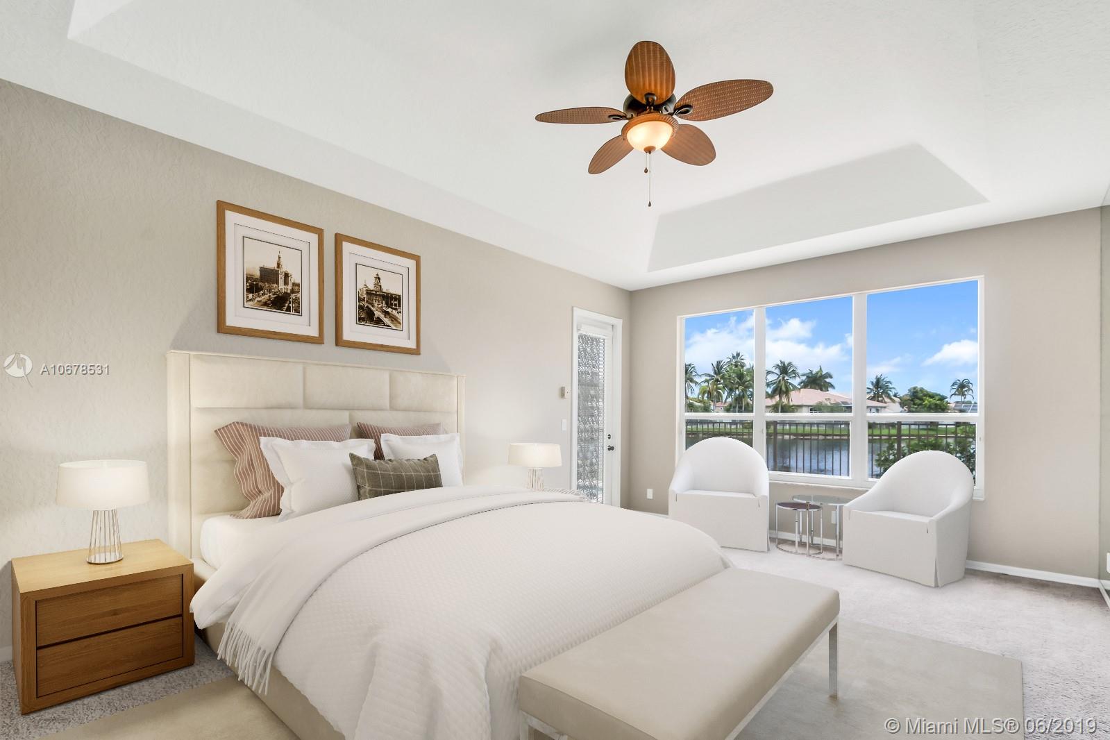 Check out this home in the gated community The Shores at Boca Raton. 3 bed 3.5 bath home with beautiful lake view. Den/office has full bath. Brand new AC units. Pool resurfaced with new equipment. New stainless oven, cook top, microwave and dishwasher. Fresh interior paint and new carpet in the bedrooms. Don't miss out on this one. To help visualize this home’s floorplan and to highlight its potential, virtual furnishings may have been added to photos found in this listing