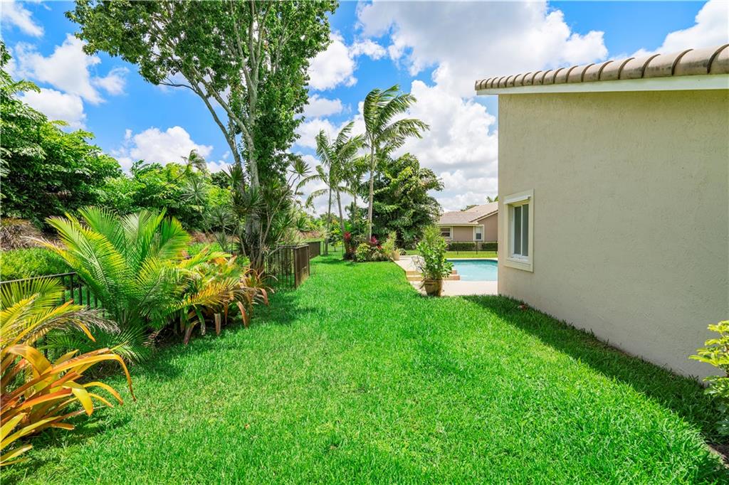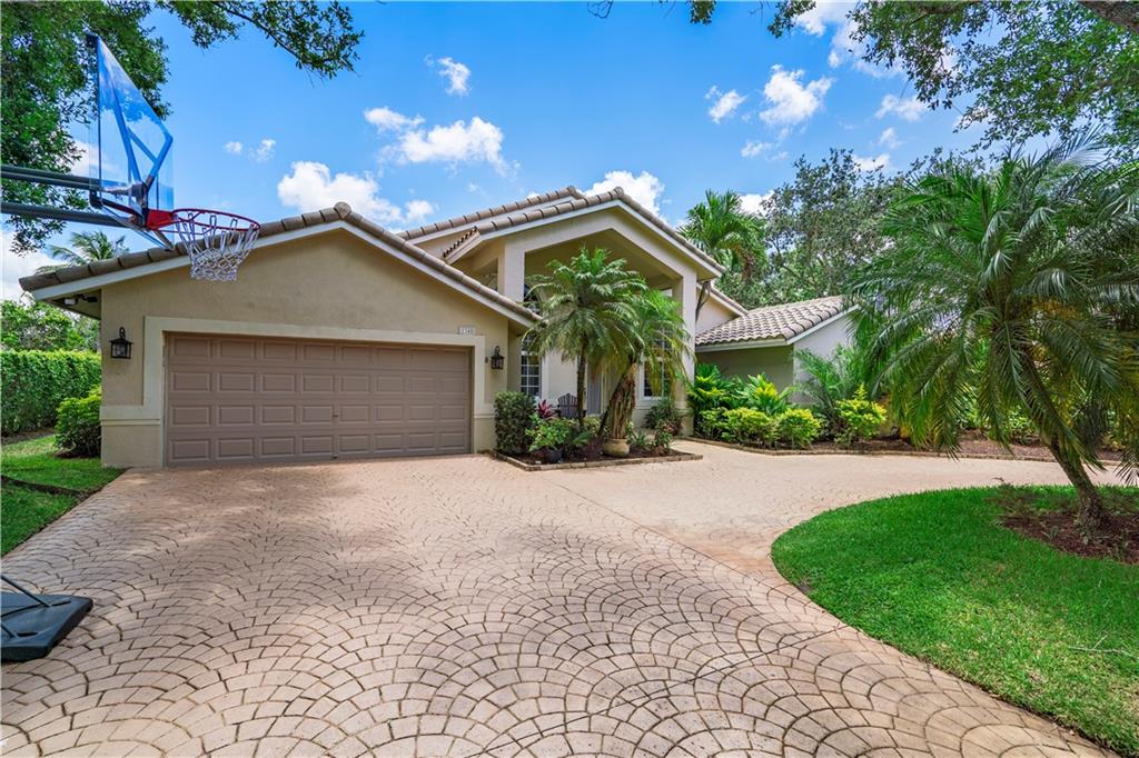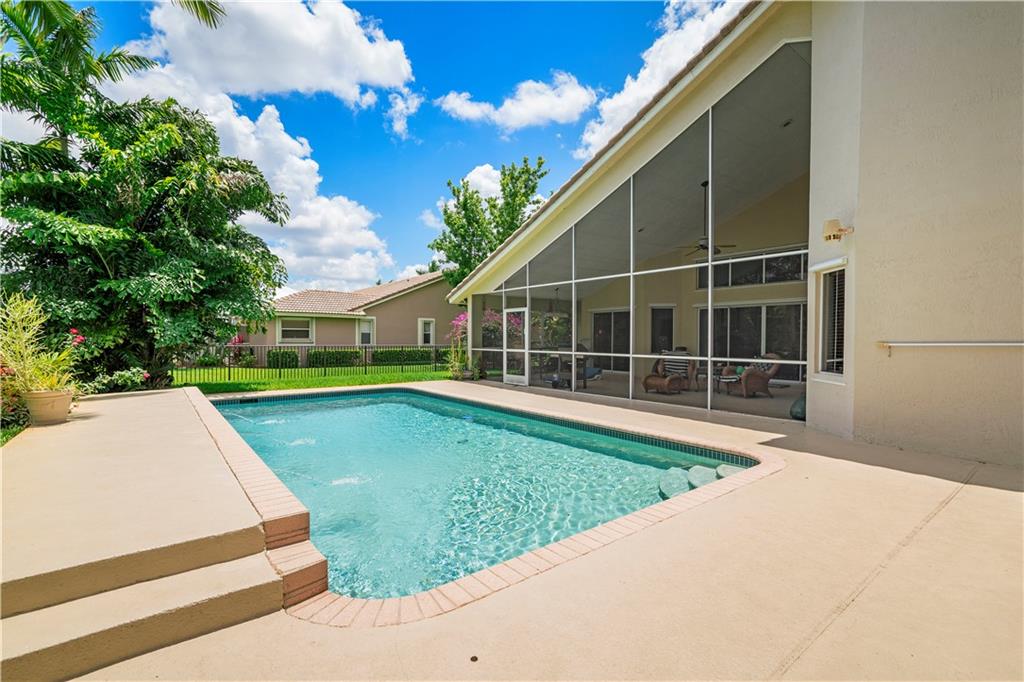 Very private lovely Eagle Trace single story 4 bed 2.5 bath 2 car garage home! The home sits on a tranquil large lot backing up to open green space. Beautiful pool with fountains, outdoor shower, fully fenced & huge screened in lanai. Lush tropical landscaping, & big circular driveway, 2009 roof, soaring vaulted ceilings, lots of natural light, bamboo hardwood floors, split floorplan. Open great room & kitchen w/granite countertops & center island, big eat in kitchen & family room. Large formal dining room & living room are great for entertaining. Master suite has large walk in closet w/custom built ins & remodeled Master Bath has custom, gorgeous shower, double sinks & deep soaking tub. Low HOA & great resort style amenities! Top rated Coral Springs schools, close to shopping & freeway!