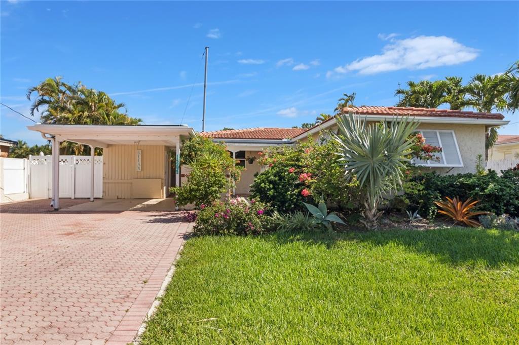 You'll love this vintage sweetheart! This two bedroom, two bathroom waterfront bungalow has a private backyard with a solar heated pool, and 65ft of water frontage with ocean access & NO FIXED BRIDGES. This light and bright home features an updated, open kitchen with custom white cabinetry w/pull-outs, granite countertops and stainless steel appliances. Home has tile floors throughout, crown molding, large closets with built-ins, modern bathrooms, and pot lighting in the living areas. Enjoy mature gardens in the front and back yard that features an covered awning with a seating area and lots of outdoor space for entertaining, the epitome of the South Florida lifestyle! Currently being leased as a legal AirBNB. NOTE: Under Mexican tile terrazo floors.