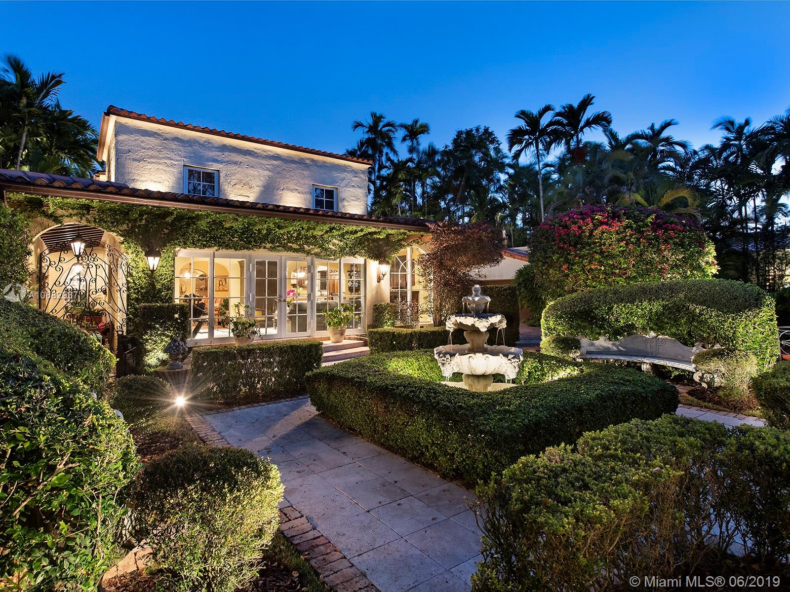 1926 two-story Old Spanish, completely updated with the highest quality craftsmanship, on a .25 acre corner lot, featuring a formal, European-style manicured garden that is ideal for entertaining. A front entrance Loggia with high wood-beam ceiling and Corinthian columns welcomes you to a 3-Bedroom, 1-full Bath upstairs, and a lovely Powder Room downstairs, plus a detached 1/1 Cottage and double car garage. This home boasts an elegant kitchen, with terra-cotta and marble floors, coffered ceiling, and a hand-hammered copper sink, along with high impact windows and french doors throughout, which combines the beautiful view of the gardens into everyday life. Located on Alhambra circle, the home provides easy access to all of Coral Gables' restaurants, clubs, and schools.