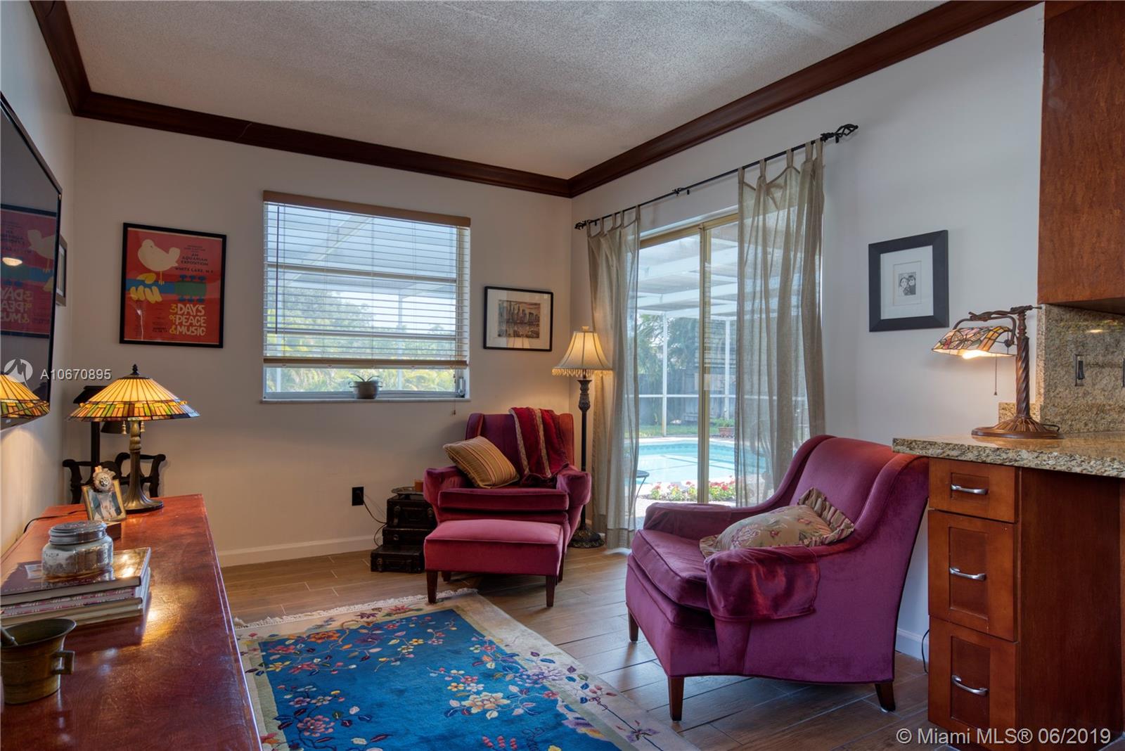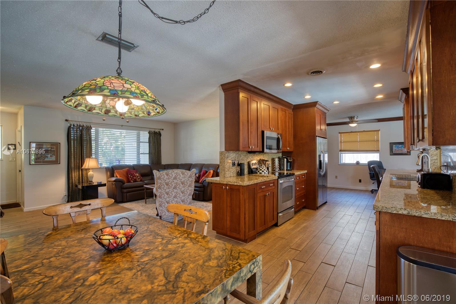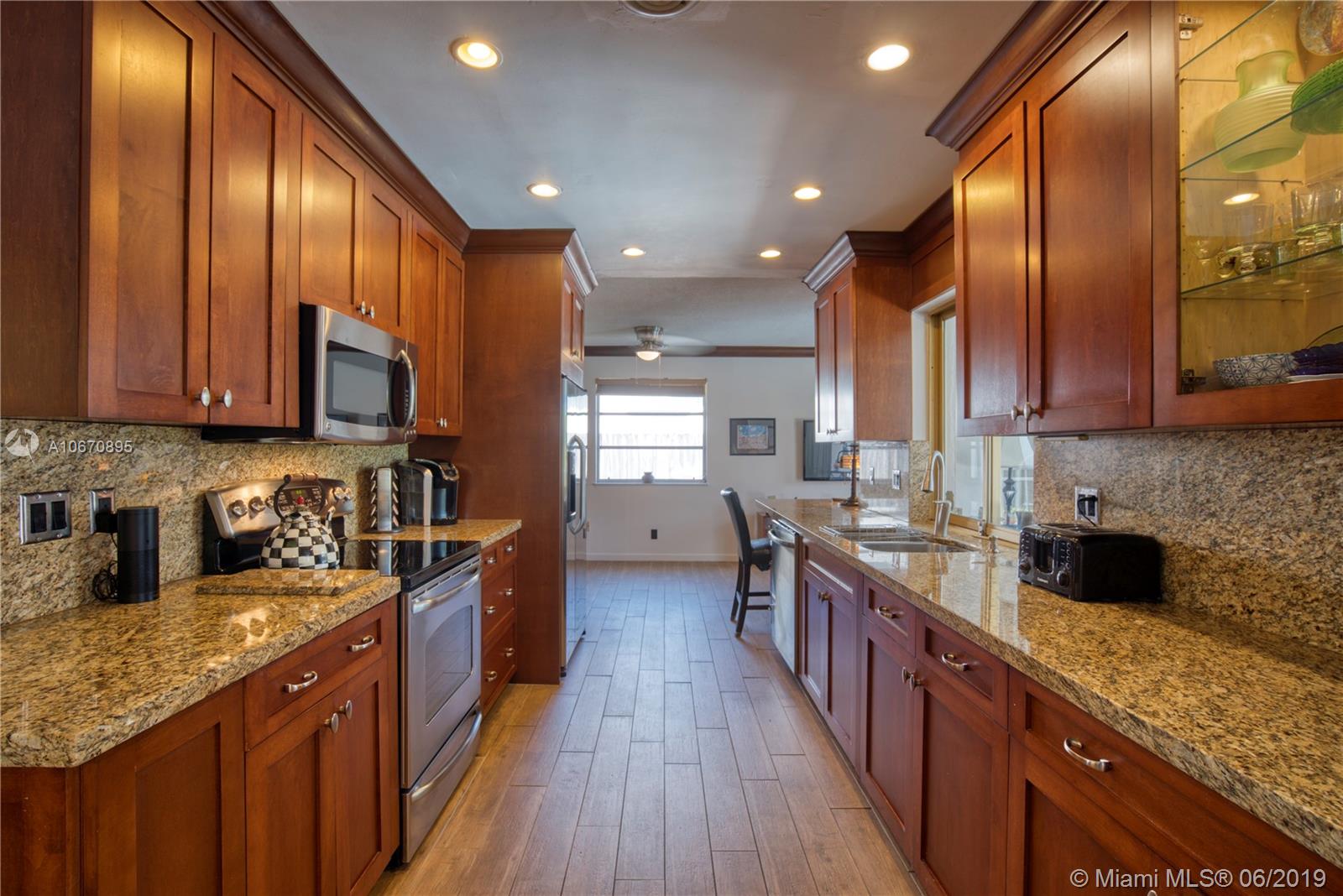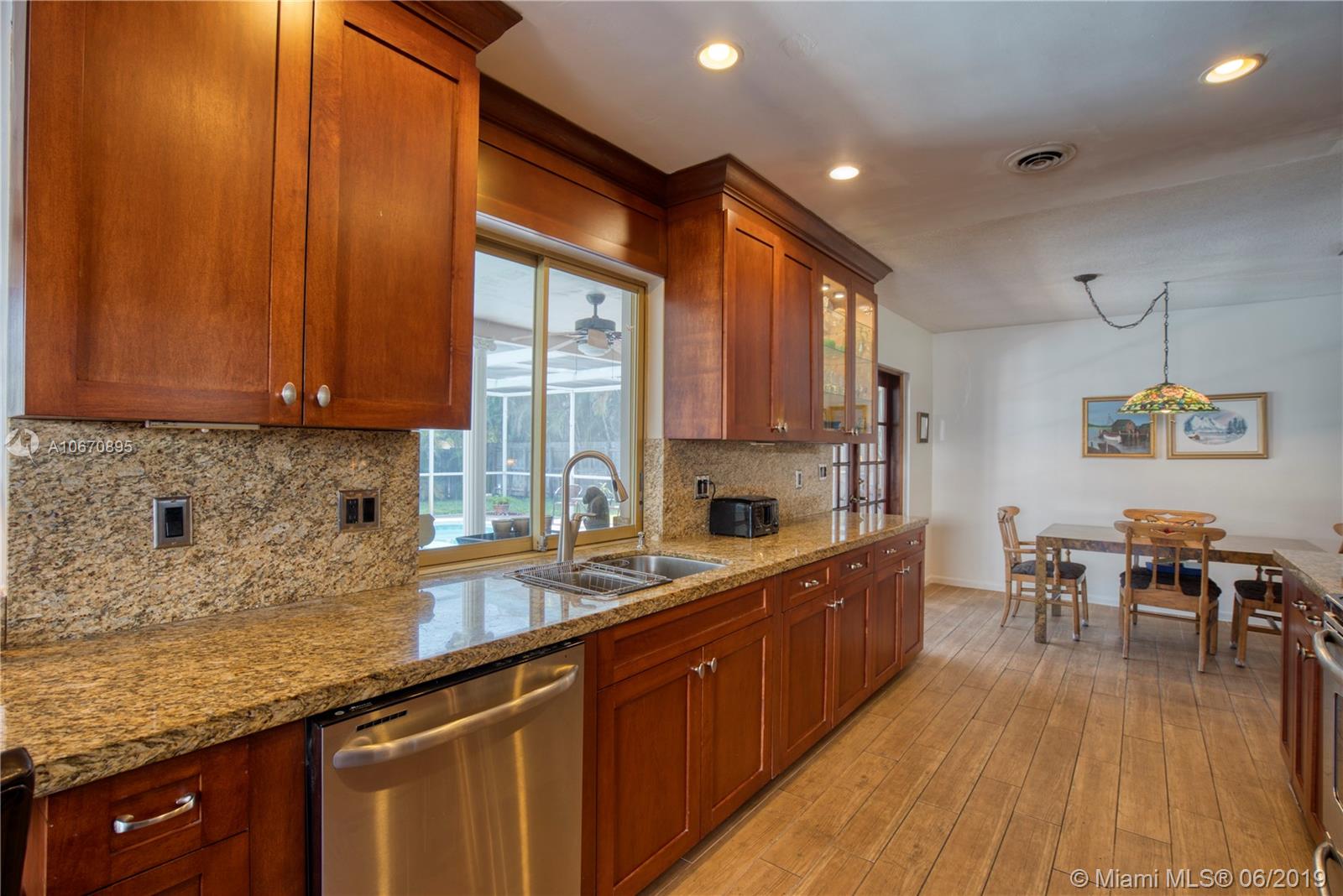 This spacious three bedroom, two bath Hollywood Hills pool home offers a family friendly layout. The newly renovated kitchen provides granite surfaces, cherry tone self closing custom cabinetry and stainless steel appliances. An extra pantry adds to the abundance of storage. The living area, kitchen and family rooms all have modern wood style porcelain plank floors. The master is spacious with an updated ensuite which offers additional access to an expansive pool area. The main bathroom has also been updated with new cabinetry and marble surfaces. The roof was replaced in 2014 and the home has been freshly painted inside and out. The expansive private fenced backyard is perfect for children at play and family gatherings. This home is truly move in ready!