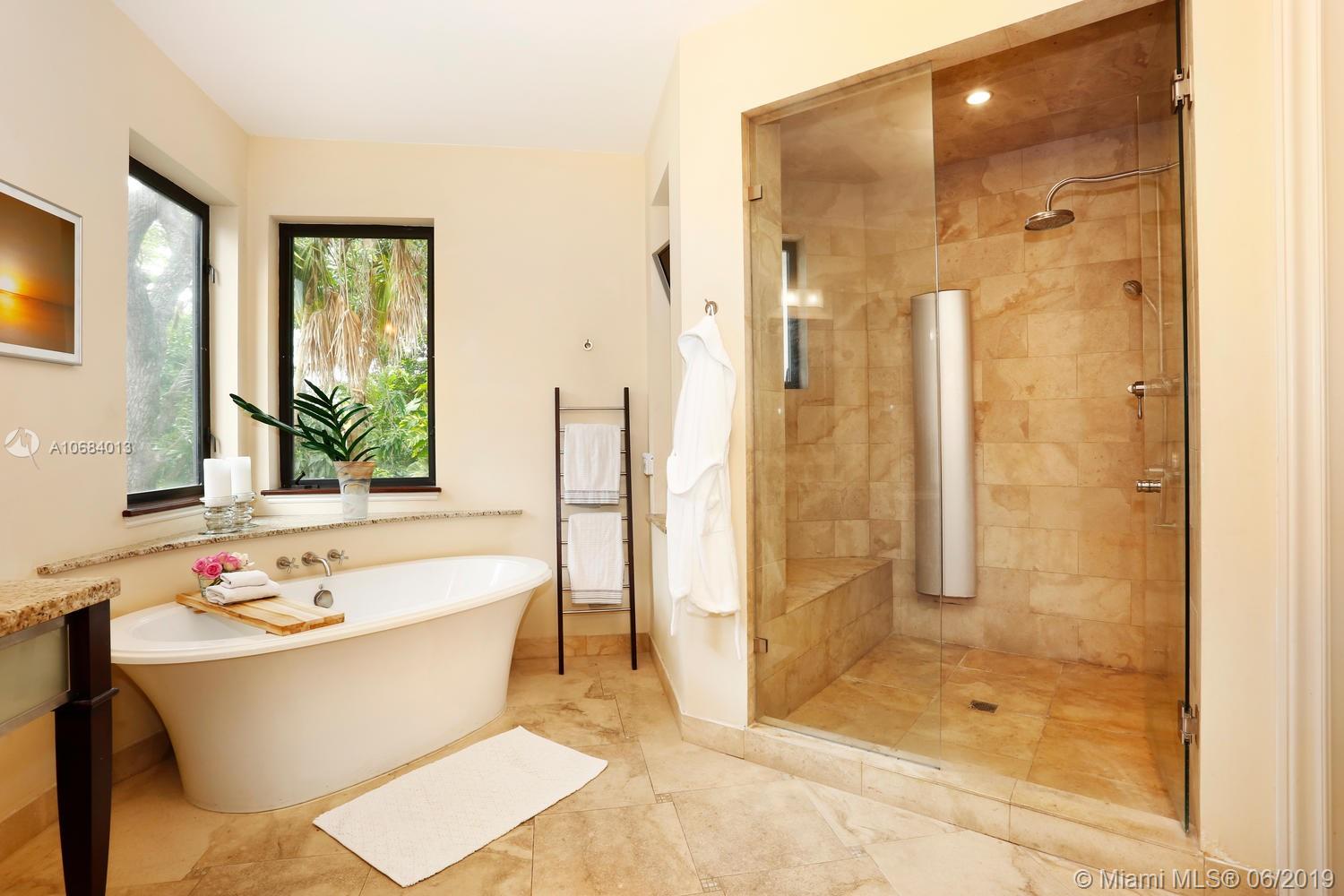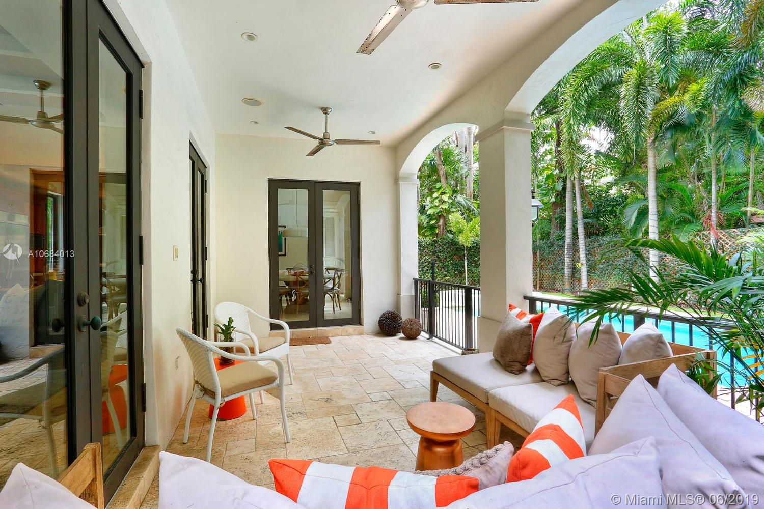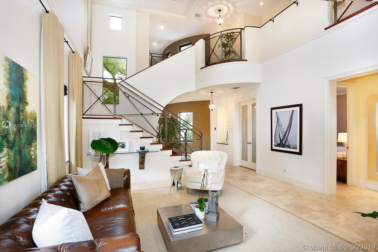 Ultra-private, walled & gated villa in prestigious North Coconut Grove. Walk to bayfront parks, marinas & to the Grove village. Located at one of the highest sea-level elevations in S.Florida. Stunning, light-filled interior spaces offer double-height ceilings, stone & hardwood flooring and a blending of classic architectural details w/a modern vibe. Expansive formal living, dining & family rooms. Spectacular custom kitchen features wood cabinetry, quartz countertops, center island & an adjacent breakfast area. Luxurious master suite includes an alcove sitting area, separate office, private balcony & stunning bath featuring soaking tub & frameless glass shower. Emergency generator connected to city gas. Lush interior courtyard + separate covered terrace overlooking the tranquil pool & spa