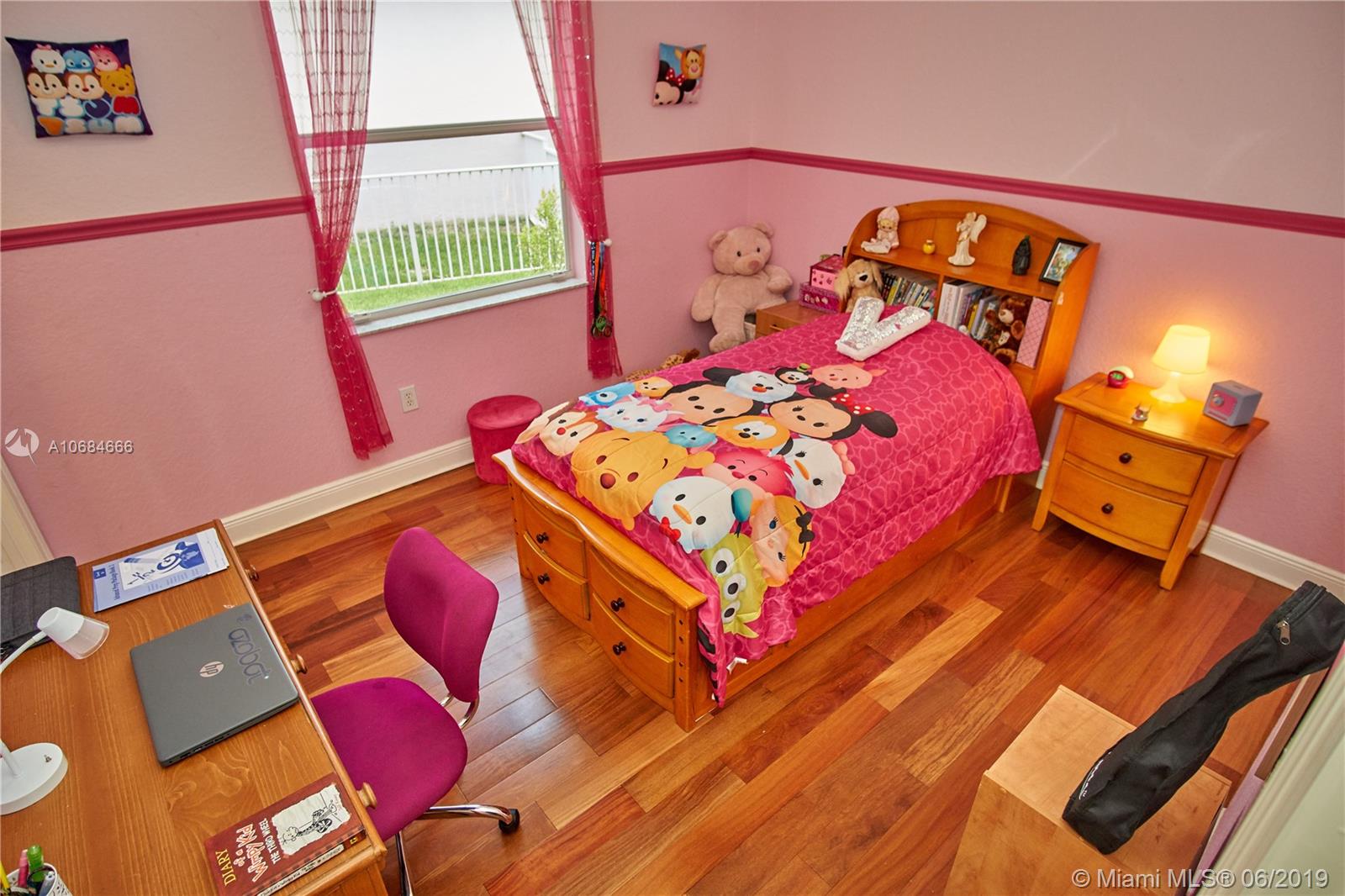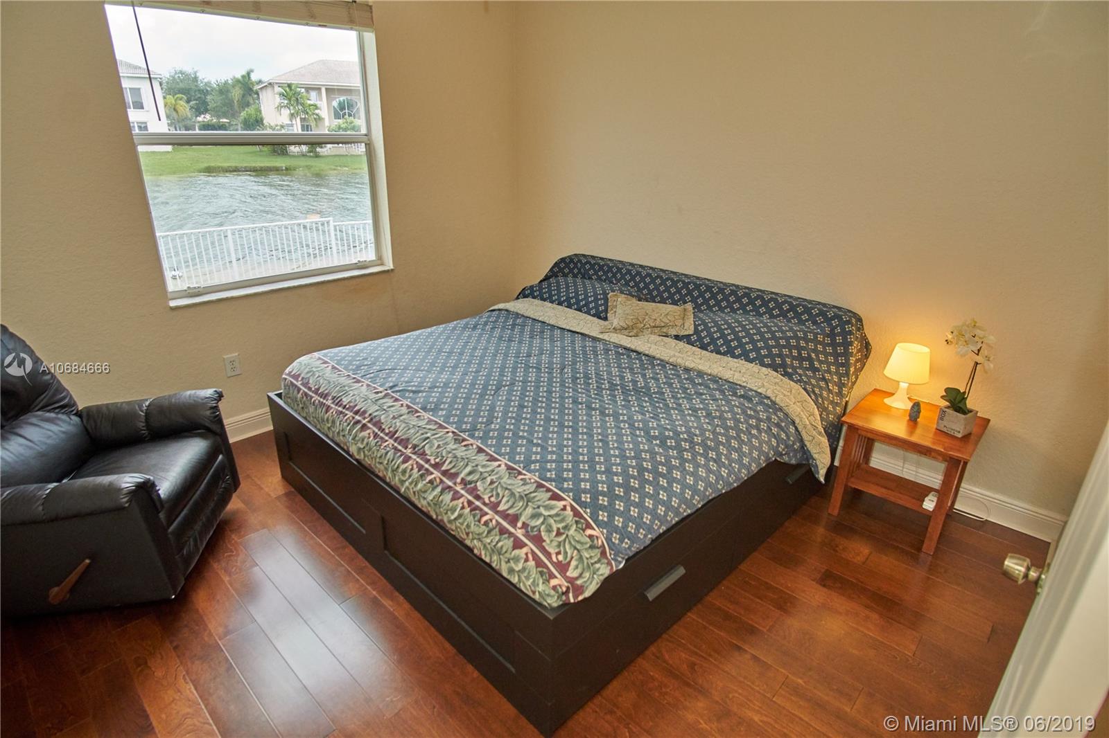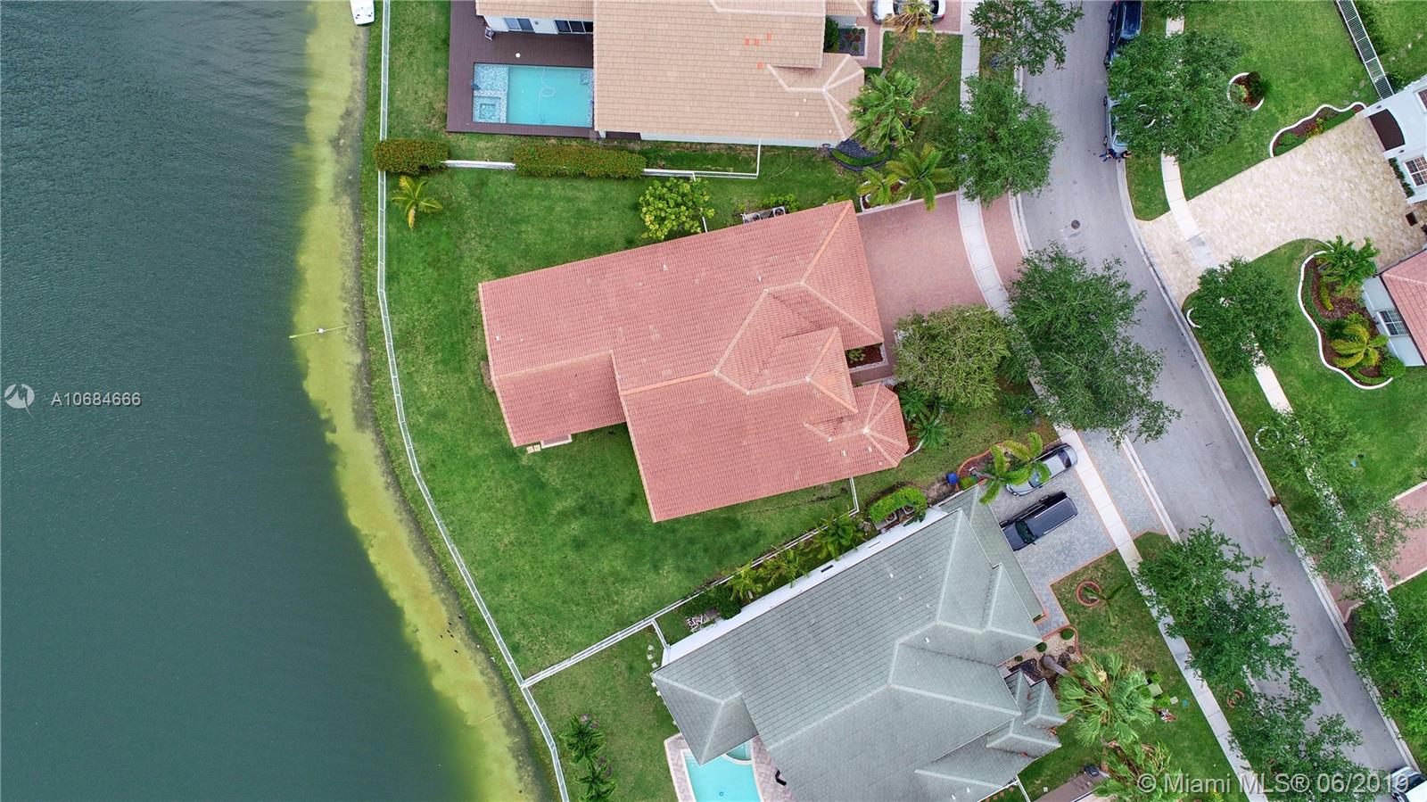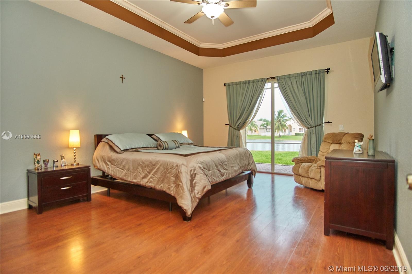 Beautiful lake front one story house in the prestigious community of Sunset Lakes. Over size lot. Open plan, high ceilings, large windows with plenty of natural light. 5 bedrooms with hard wood floors, 3 bathrooms. 2 bedrooms share a Jack-Jill bathroom. Large master bedroom with 2 walking closets. Master bathroom has his and hers sinks, jacuzzi tub. Formal dining room and living room, spacious kitchen with stainless steel appliances and granite counter tops. Big family room with a gorgeous sunset view over the lake, impact windows facing the lake, screened terrace, fence. Laundry room with sink and cabinets. 3 car garage. The Association fee includes basic cable, alarm and access to the club house that includes resort style pool, complete gym/sauna, tennis, basketball, and playground.