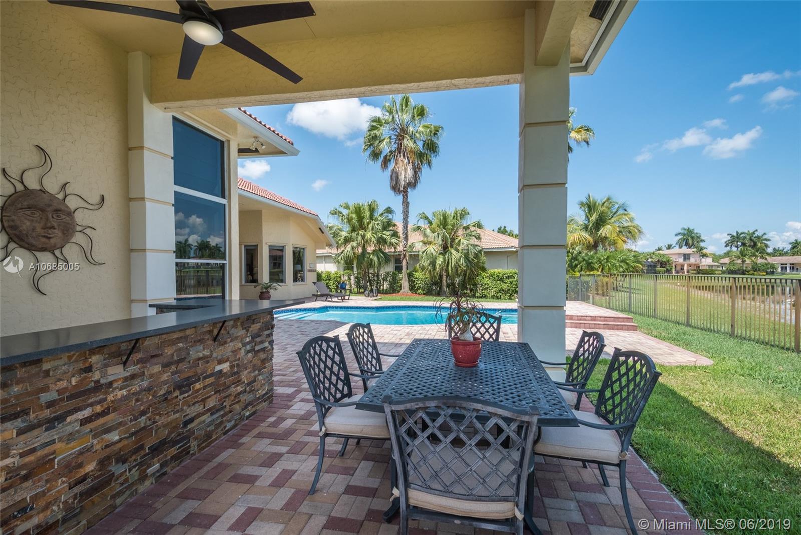 This is the one you have been waiting for. Expanded custom one story home on a private oversized 17,796 square foot lot. Enjoy long lake views with newly renovated heated pool - chlorinated but could be salt*cascading spa*spacious covered paver patio*summer kitchen*fully fenced*across the street from the community park. Chef's Delight kitchen*marble center island 9x5 with seating*top of the line Stainless Steel Appliances*Custom wood floors*Master bedroom with custom built in closet*glass doors*shoe closet*Marble Master Bath*Spa.Newer addition 2010 with full impact glass protection. Kid Wing includes large playroom*guest room*office* Newer Roof*Newer A/C's*Accordions*Fireplace