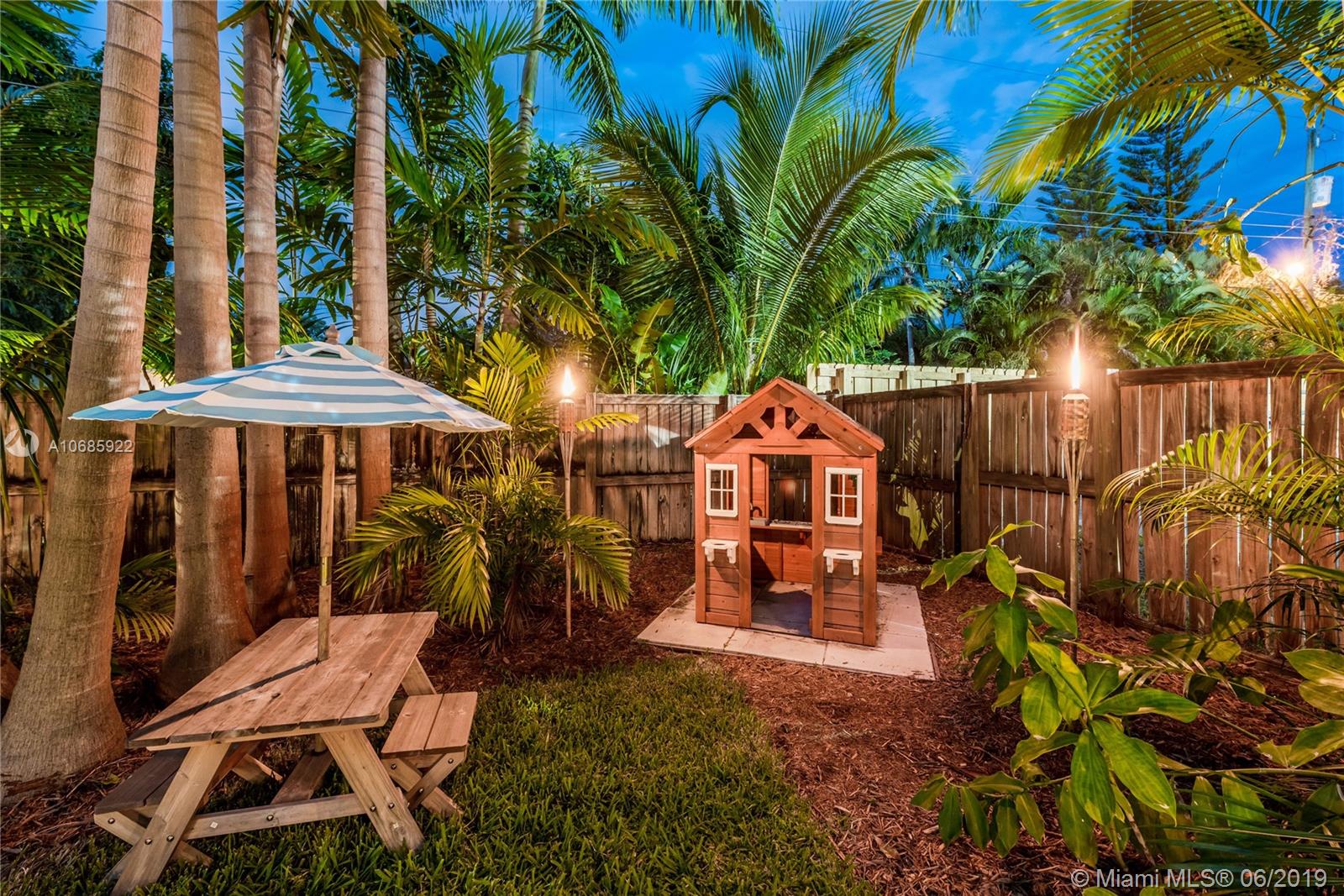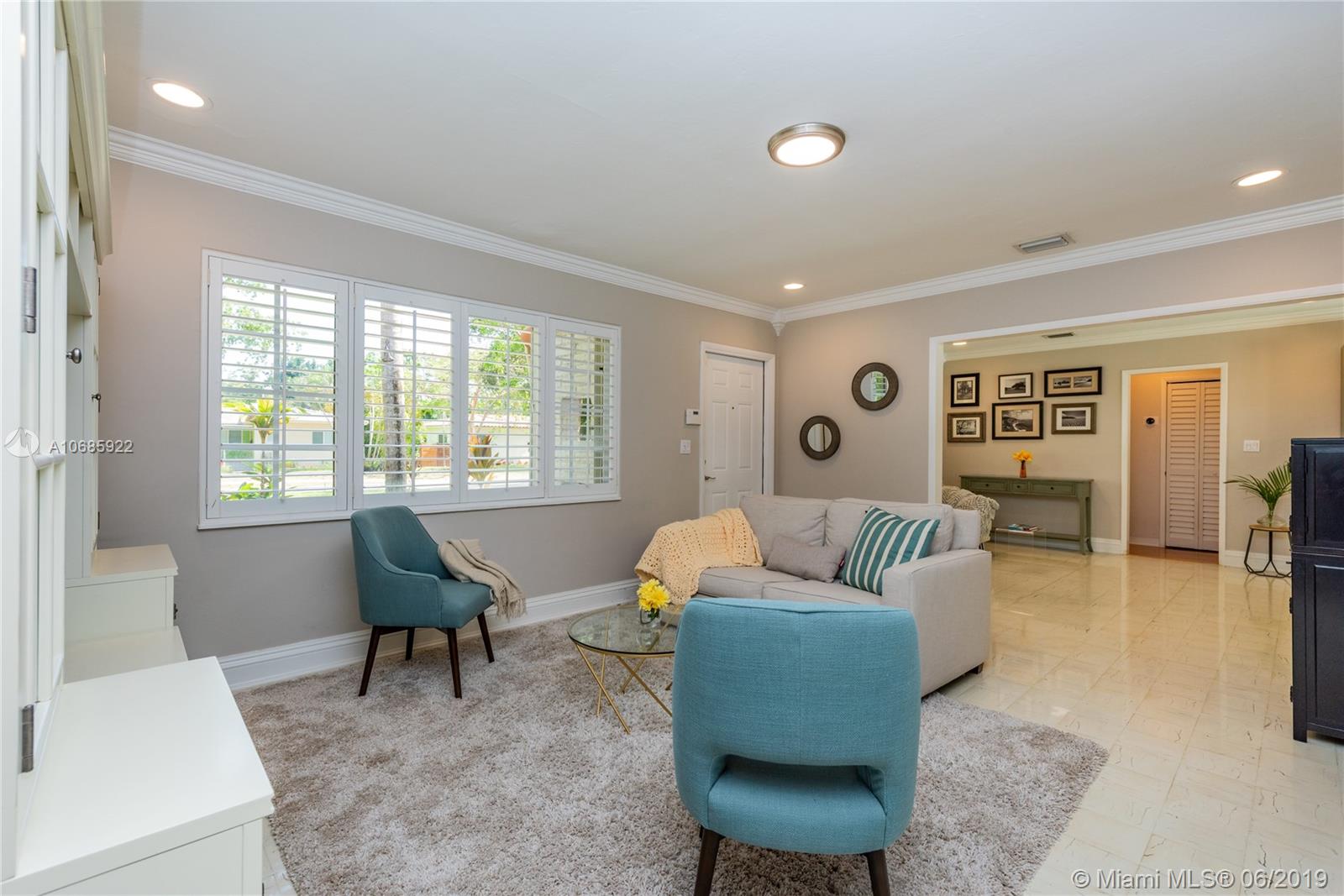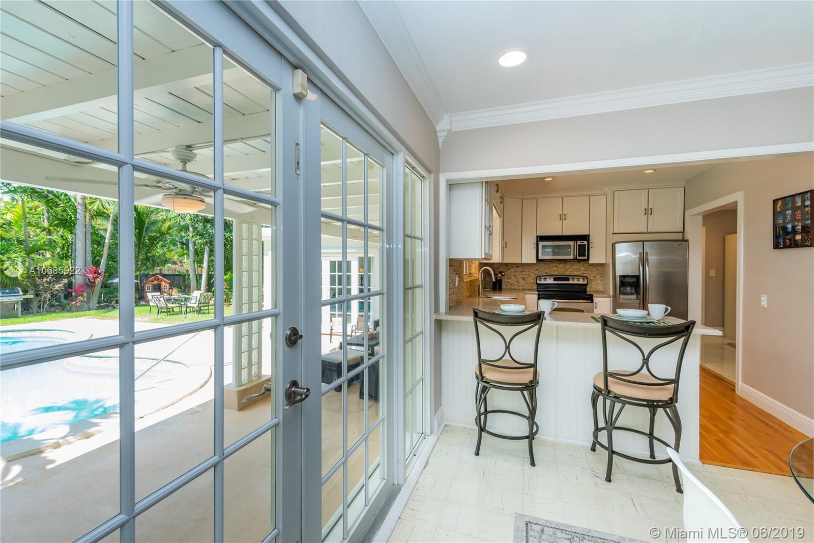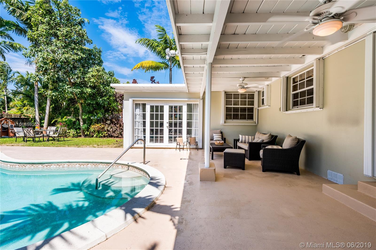 Welcome to Tropical Shores Oasis... Make a splash in this impeccable Miami Shores pool home! You'll feel like you're on vacation in the spacious tropical backyard oasis with a sparkling pool and multiple areas for dining, playing and fun! "Oh, waiter, another round, please!" Enjoy bright living in this updated home with an open flow plan with formal living, den, kitchen and dining room with double French doors opening to the covered patio, perfect for year-round indoor-outdoor living. Double en-suite split three bedroom plan with a bonus sitting room in the master suite retreat with double French doors-- so you can slip out for a private moonlight swim. All with a one car garage, located in a non-flood zone on a quiet, tree-lined street in beautiful Miami Shores. Dive in!