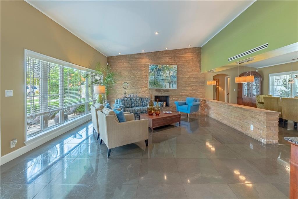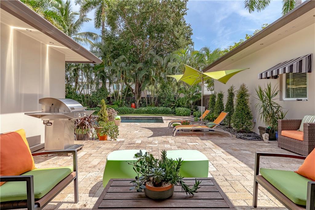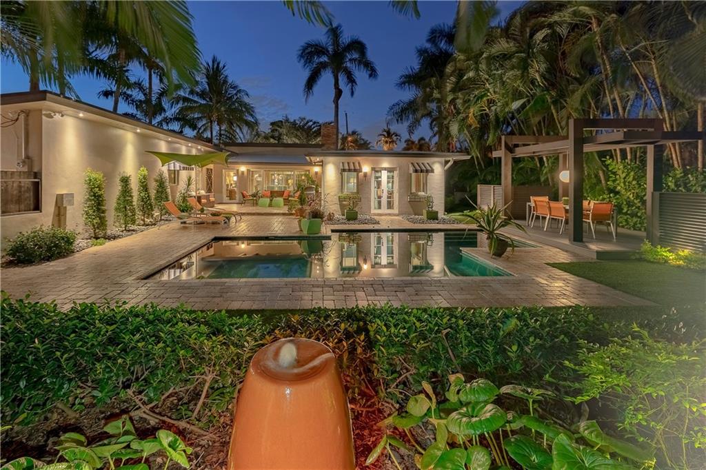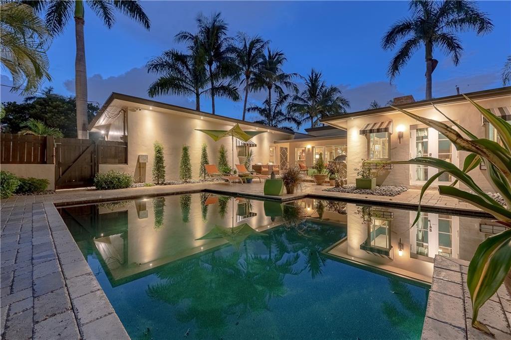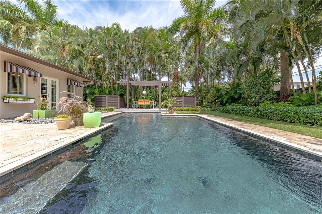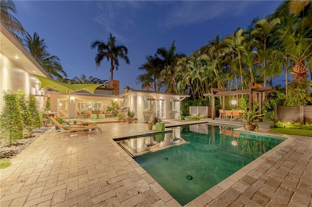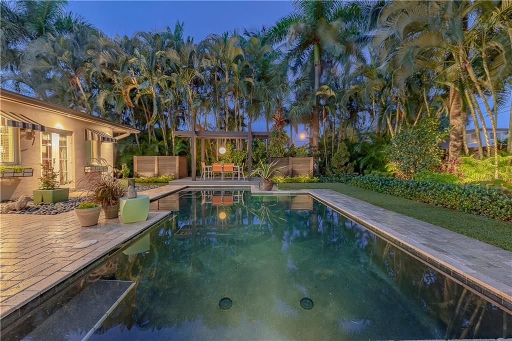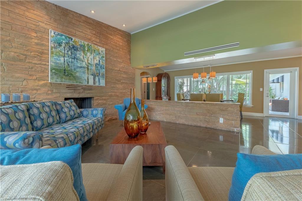 A beautifully modernized Victoria Park Mid-Century is a sterling representation from the Atomic period. This three bedroom, three bath home with a Den boasts an iconic stacked Sandstone wall and room divider, wood burning fireplace, soaring vaulted ceilings, polished slate flooring and sloping roof lines. Features include impact windows and doors, whole house generator, over-sized single bay garage with storage loft and Chef's kitchen with premium stainless appliances including a Thermador gas range, hardwood cabinetry and granite tops. A spacious Breakfast bar separates the kitchen from the dining room. The very private fenced yard is surrounded by spectacular architectural gardens with marble pavered terrace, thoughtful dining loggia overlook a sparkling pool.