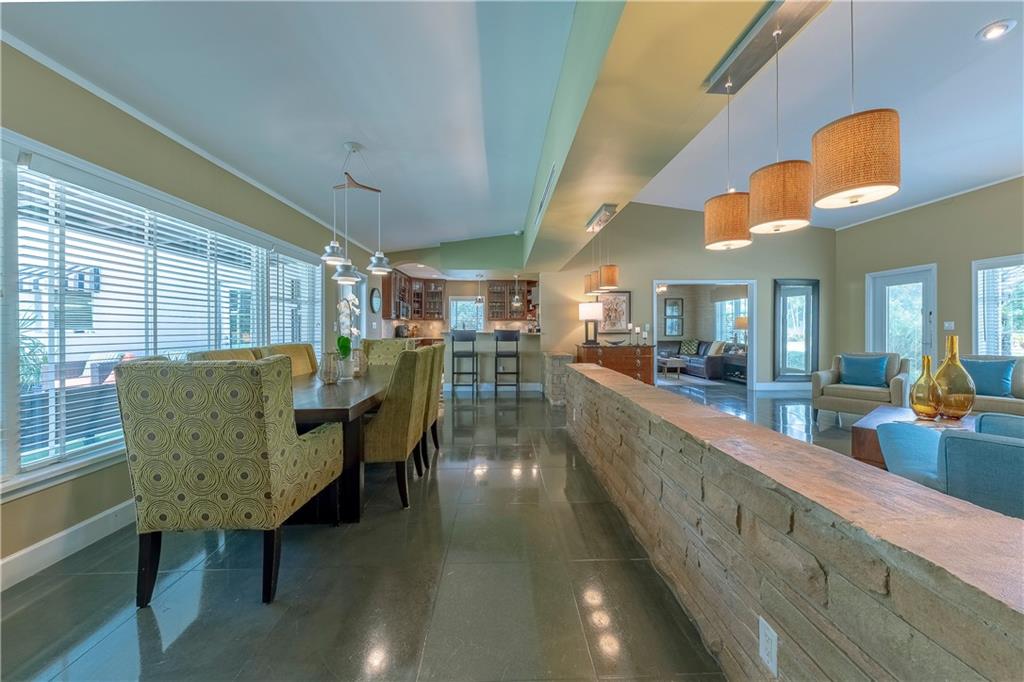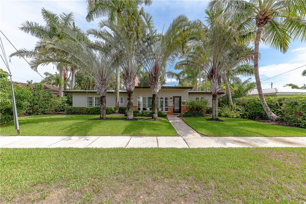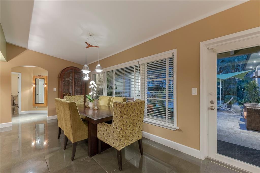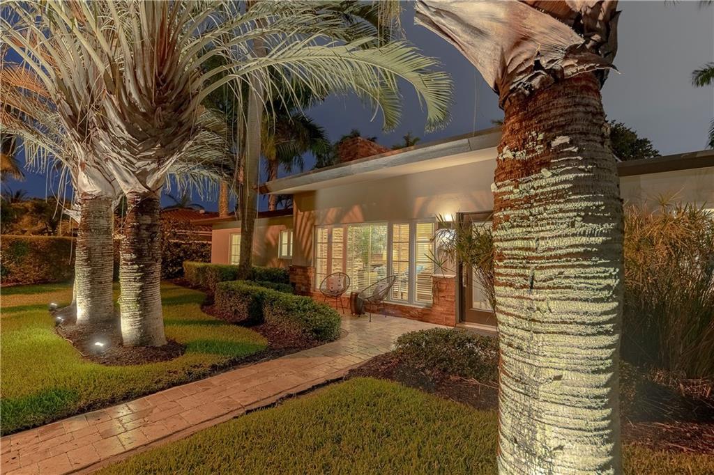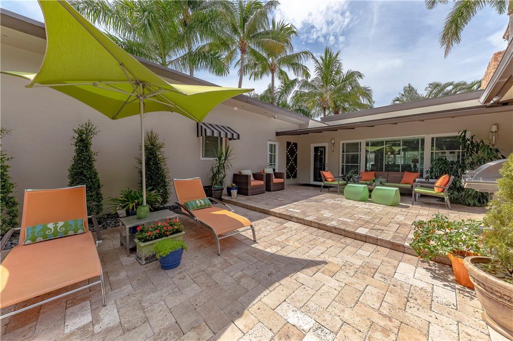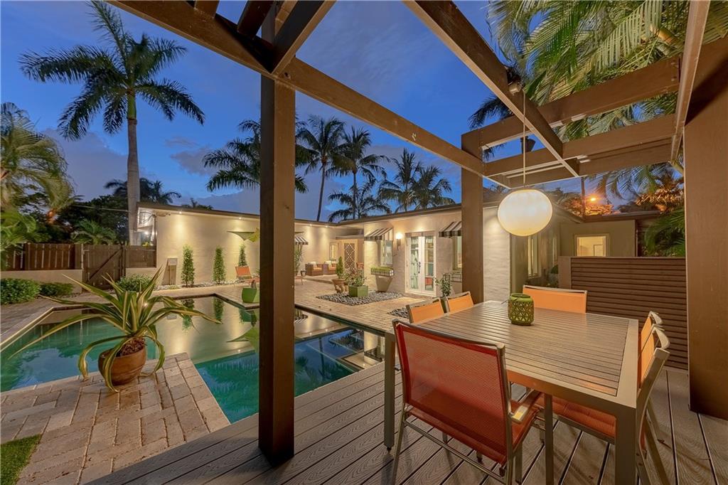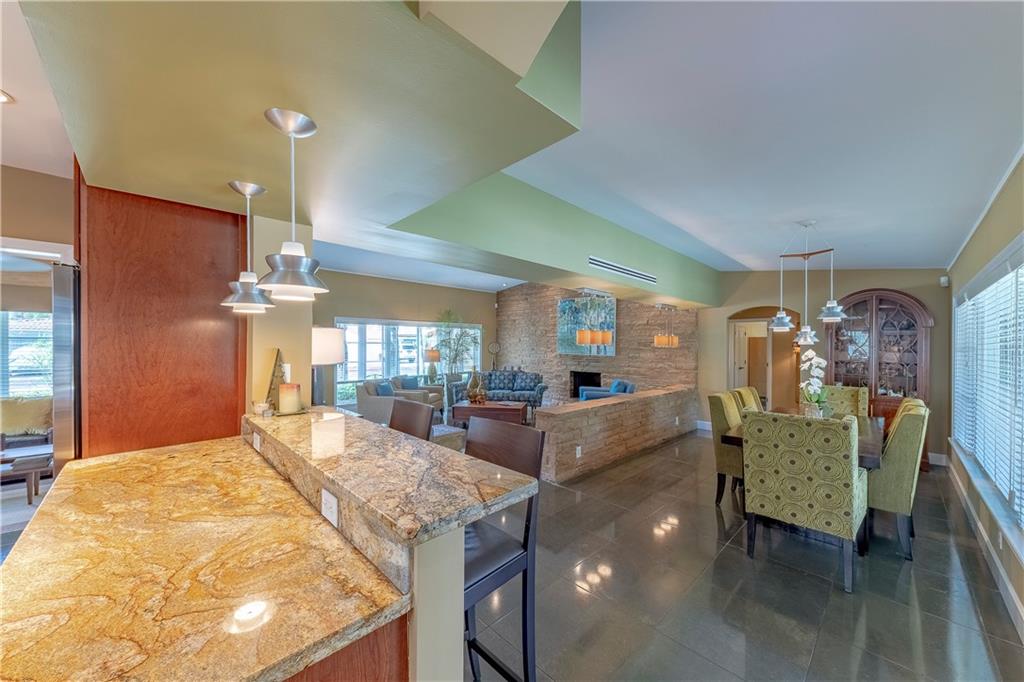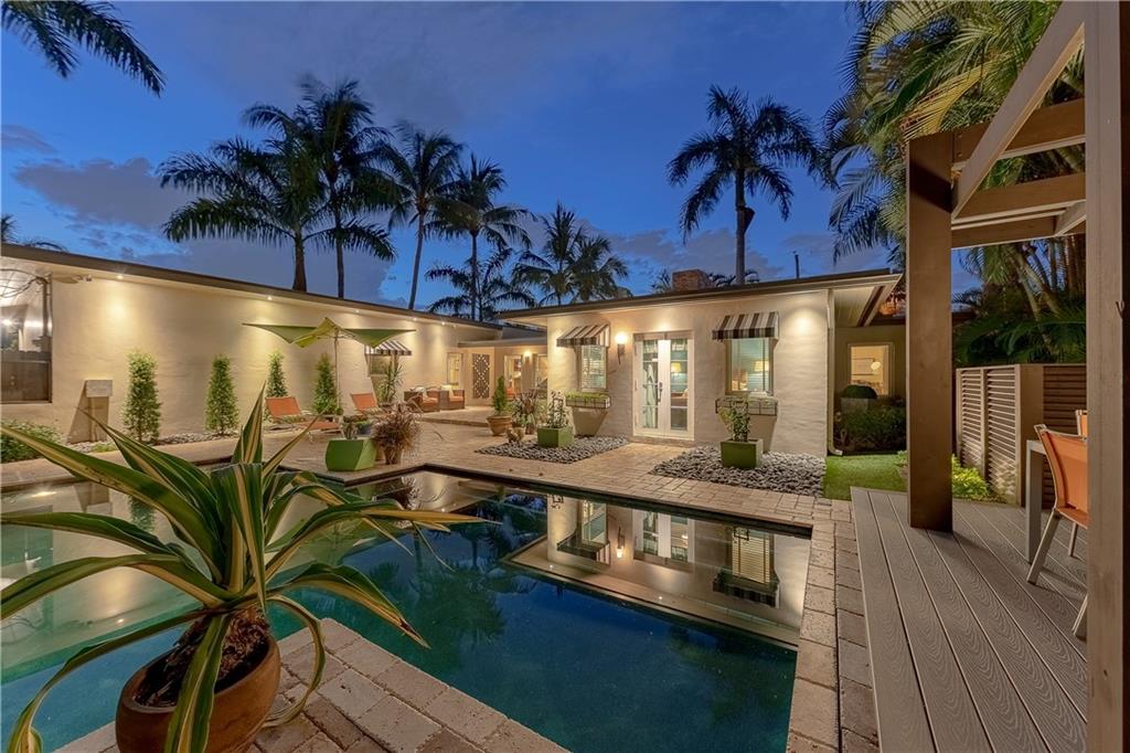 A beautifully modernized Victoria Park Mid-Century is a sterling representation from the Atomic period. This three bedroom, three bath home with a Den boasts an iconic stacked Sandstone wall and room divider, wood burning fireplace, soaring vaulted ceilings, polished slate flooring and sloping roof lines. Features include impact windows and doors, whole house generator, over-sized single bay garage with storage loft and Chef's kitchen with premium stainless appliances including a Thermador gas range, hardwood cabinetry and granite tops. A spacious Breakfast bar separates the kitchen from the dining room. The very private fenced yard is surrounded by spectacular architectural gardens with marble pavered terrace, thoughtful dining loggia overlook a sparkling pool.