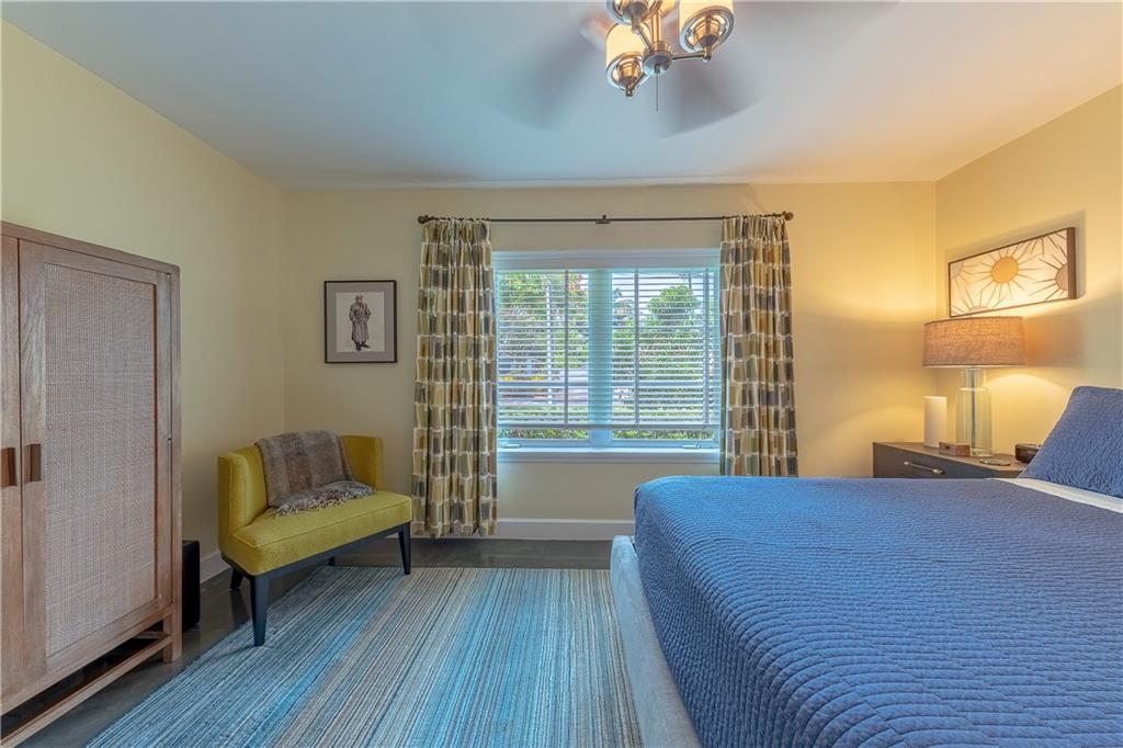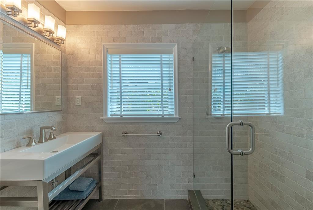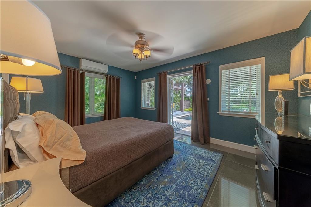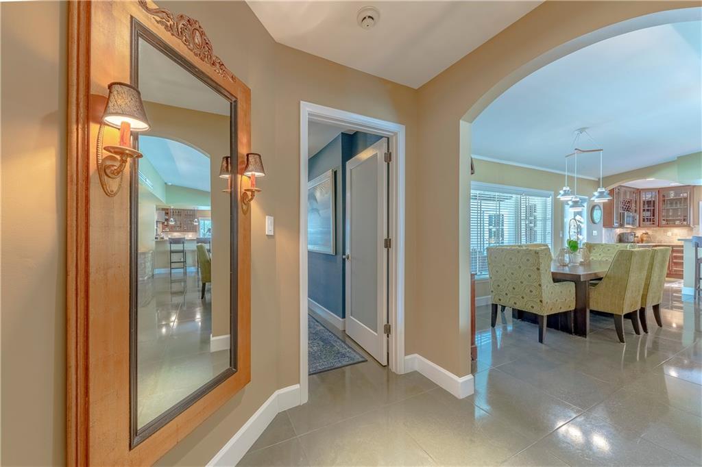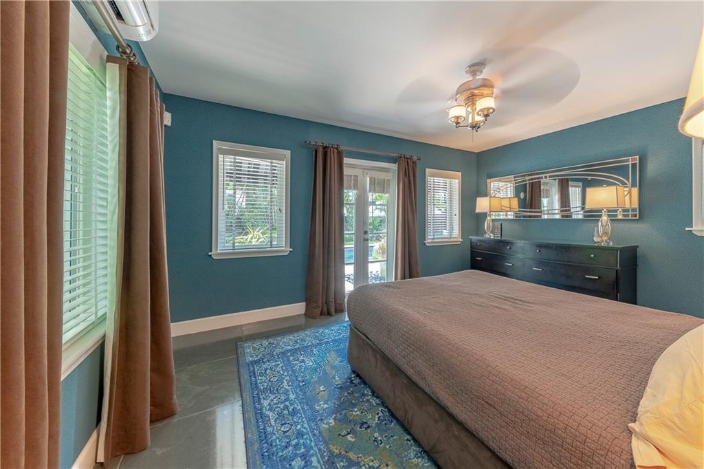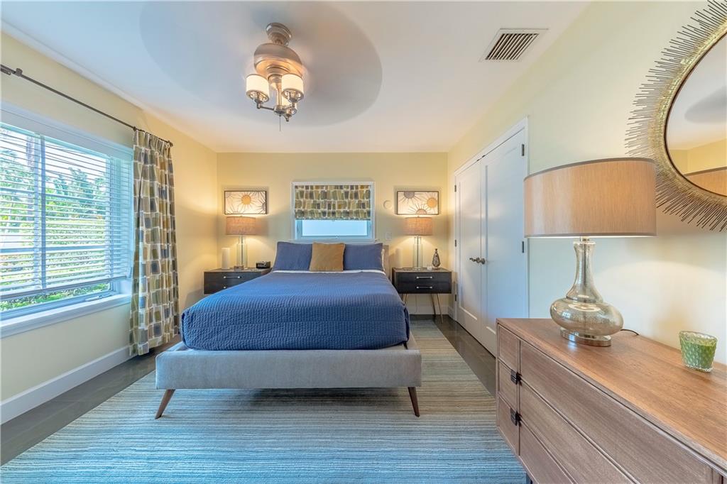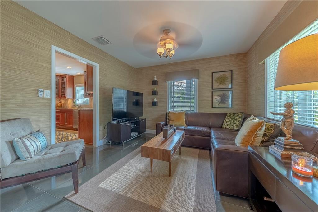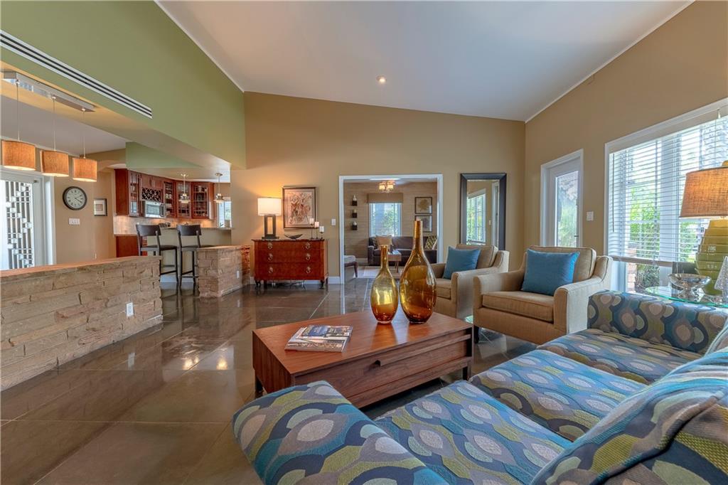 A beautifully modernized Victoria Park Mid-Century is a sterling representation from the Atomic period. This three bedroom, three bath home with a Den boasts an iconic stacked Sandstone wall and room divider, wood burning fireplace, soaring vaulted ceilings, polished slate flooring and sloping roof lines. Features include impact windows and doors, whole house generator, over-sized single bay garage with storage loft and Chef's kitchen with premium stainless appliances including a Thermador gas range, hardwood cabinetry and granite tops. A spacious Breakfast bar separates the kitchen from the dining room. The very private fenced yard is surrounded by spectacular architectural gardens with marble pavered terrace, thoughtful dining loggia overlook a sparkling pool.