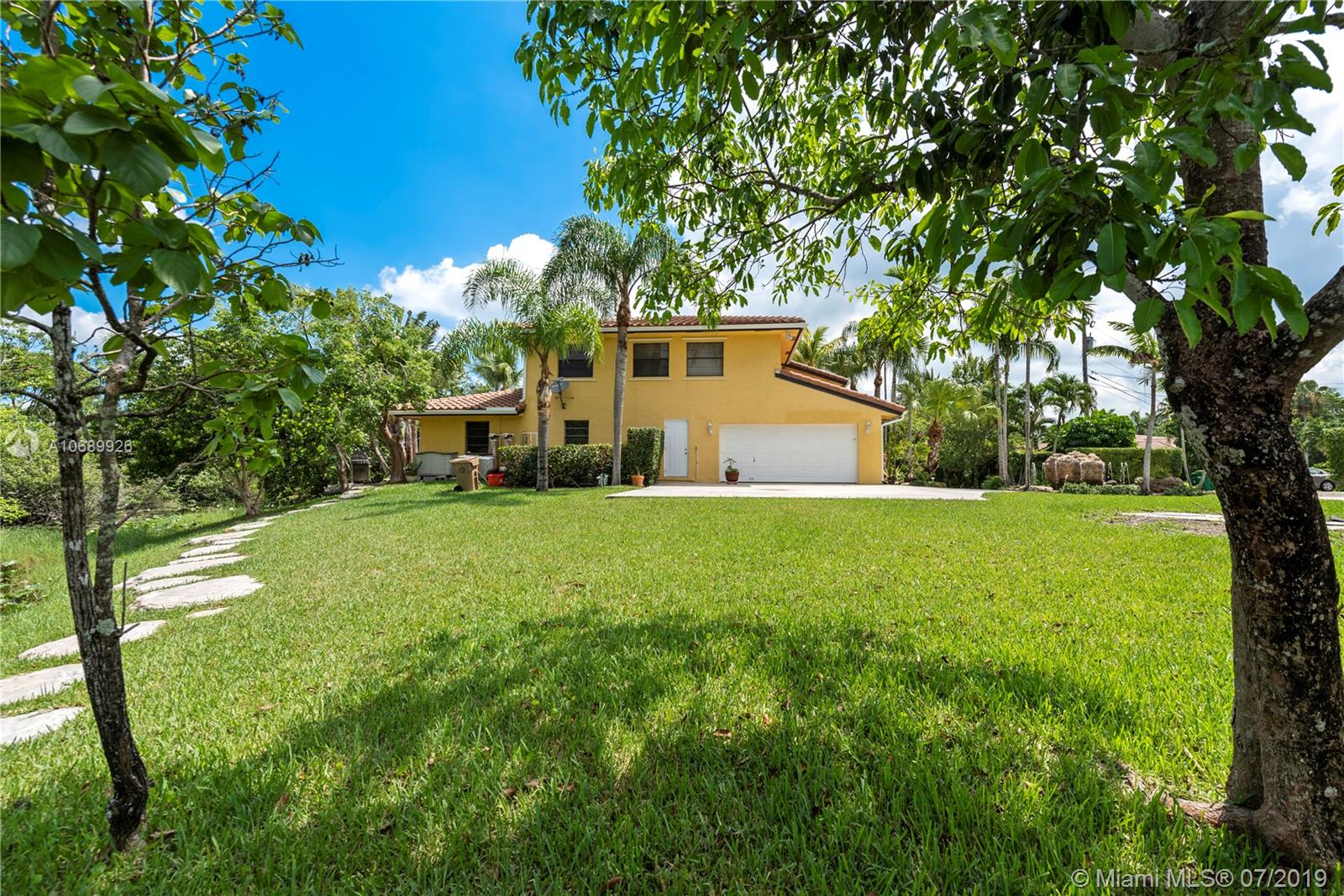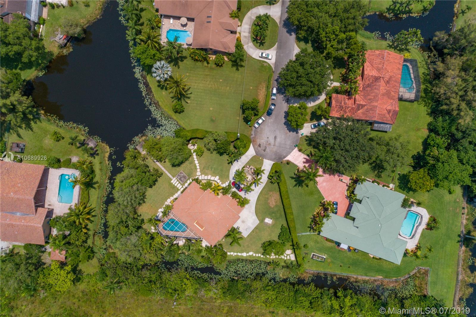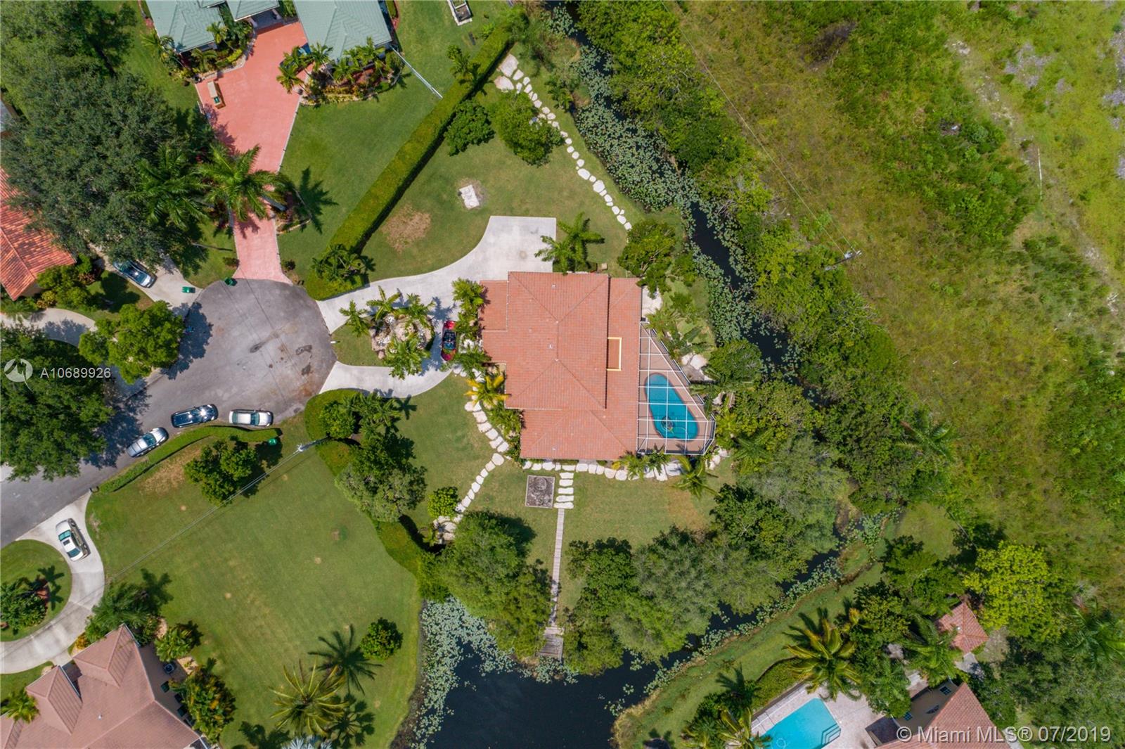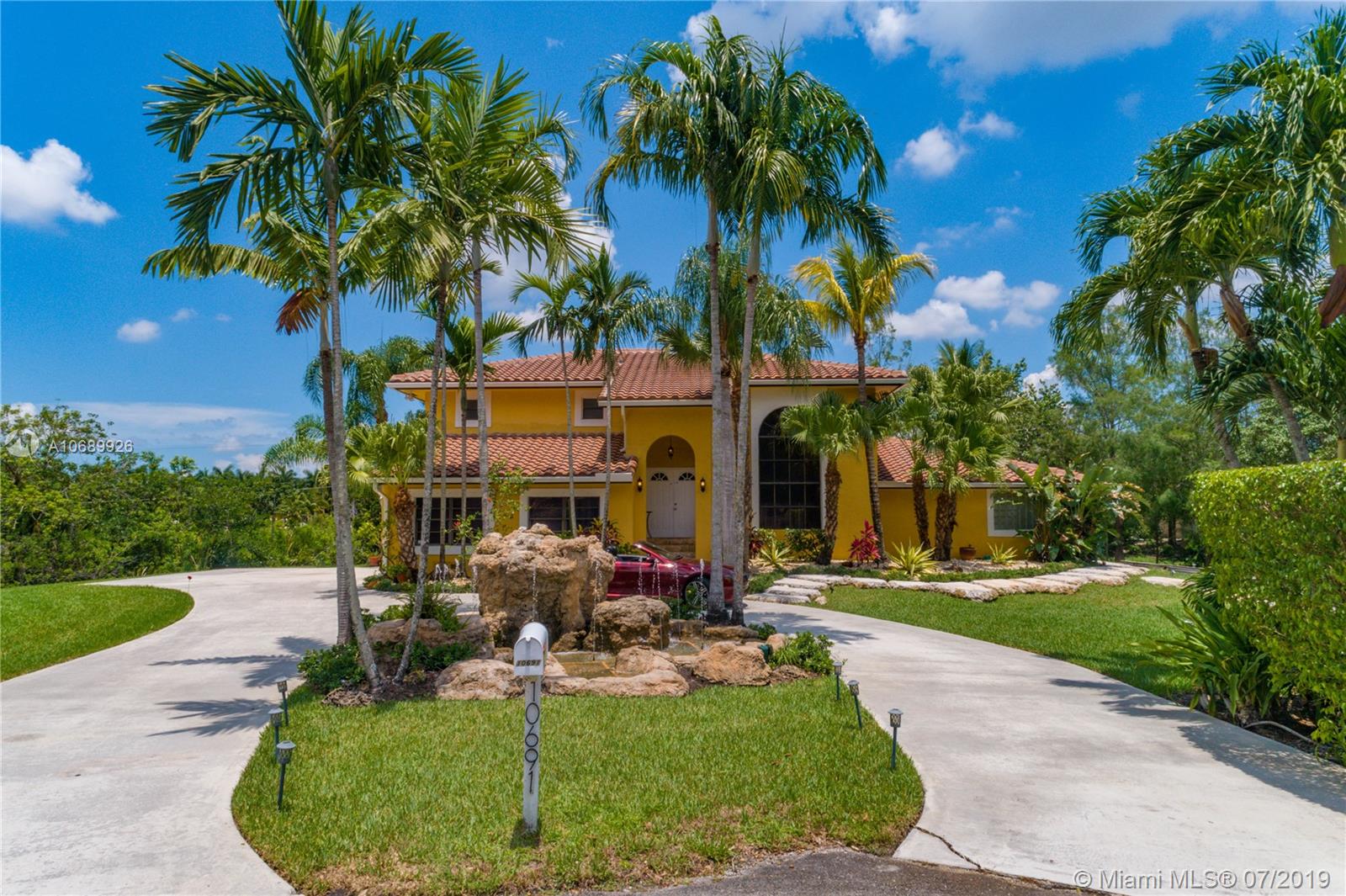 Beautiful two story Contemporary Mediterranean style house, with a lot size of almost 1 acre on a cul-de-sac in a quiet and very well maintained neighborhood of mostly acreage residential sites. 4 spacious Bed, 3.5 Bath and a loft that can be converted into another bedroom. Huge master bedroom downstairs, and a junior suite upstairs, walk-in closets, marble tile floors downstairs, laminated wood floors upstairs and the roof is new. Large covered terrace and screened enclosure back yard with a salt water system pool. Contemporary kitchen with all the appliances.3 new AC units and a power generator included. Two car garage and parking space for 4 -6 cars and a circle drive with a water fountain. Easy access to I-595.