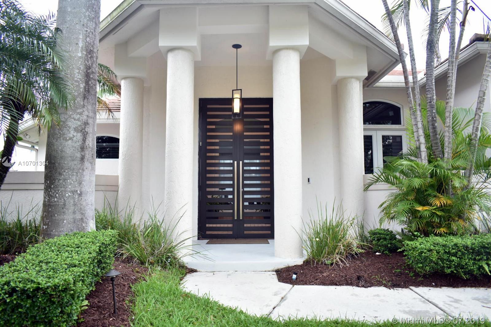 Warm Modern Masterpiece with 5 Beds / 4 baths set on an over 11,000 sq.ft. lot in prime Weston Hills. Newly renovated in 2016, this property offers high ceilings and open spaces. Designed for large scale entertaining, the vast living rm flows to the outdoor living rm & pool. Enter in the courtyard with a beautiful pond and Magnificent Custom Front Doors, Large dining, living, family rm and fabulous open chef's kitchen with full length islands, vaulted ceilings and loads of light. Top of the line Vikings appliances make it complete. Impeccable condition, all hurricane impact windows and doors (2018), 3 car garage, washer/dryer and AC units replaced in 2015. The master suite features beautiful pool views, walk-in closets & spectacular bath. 2 add'l bdrm suites with en-suite baths.