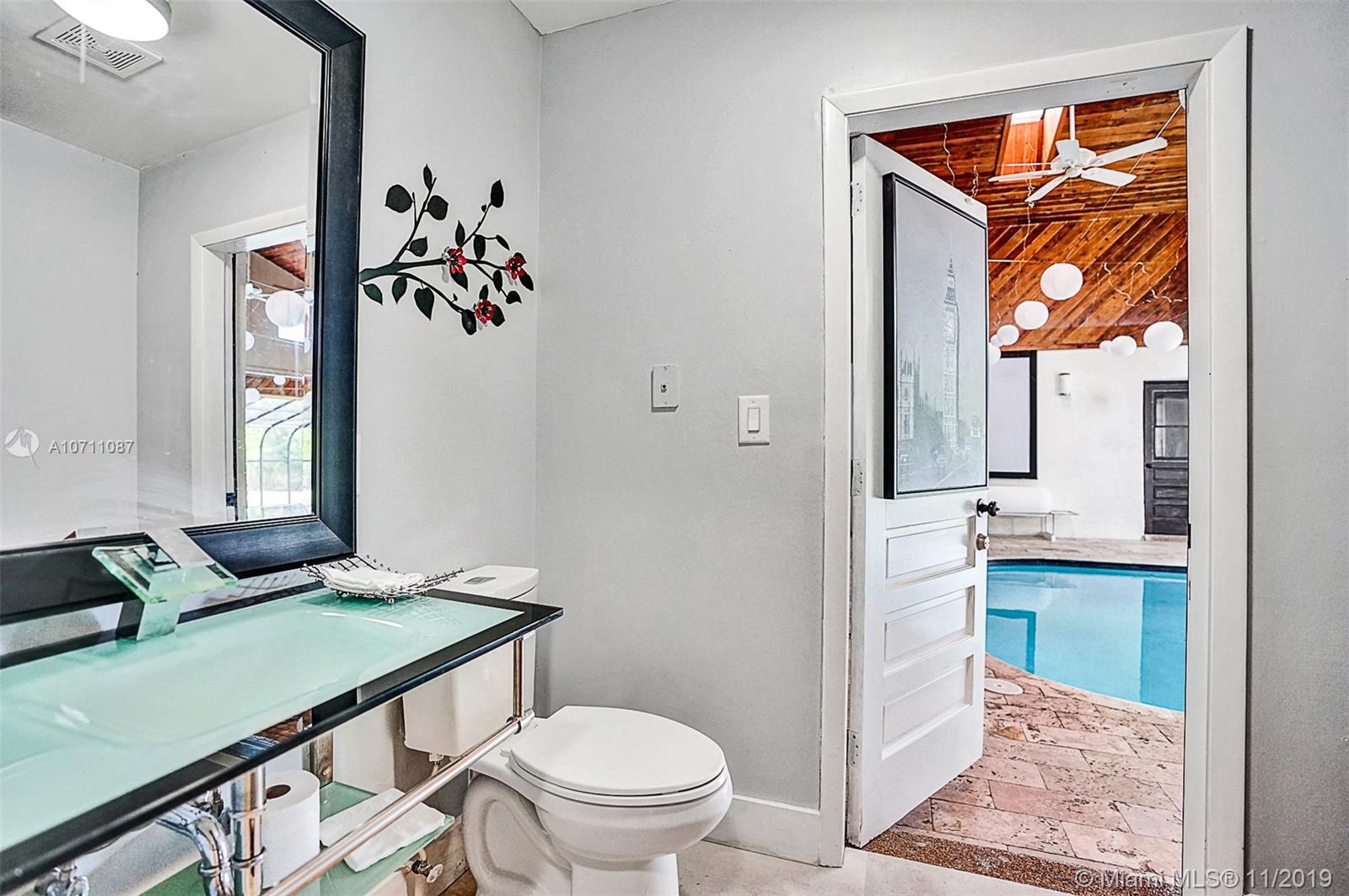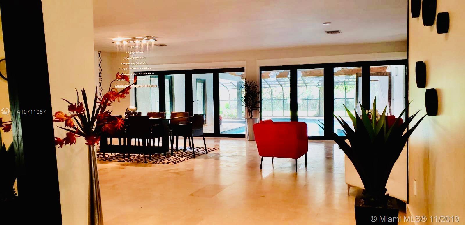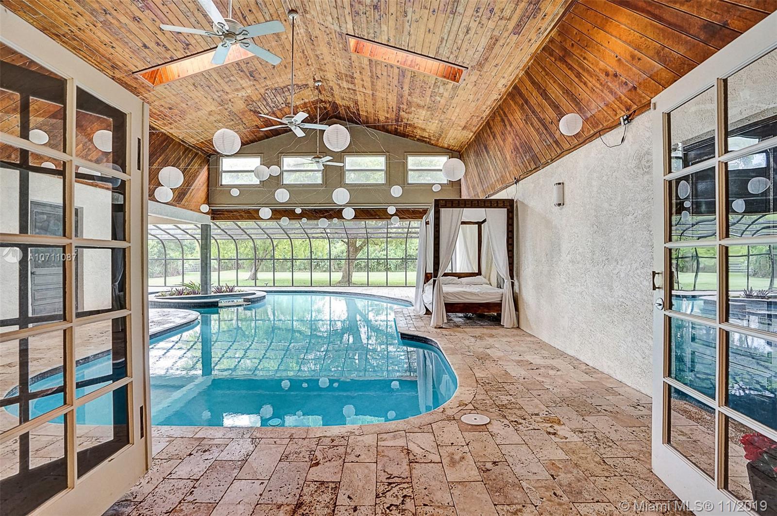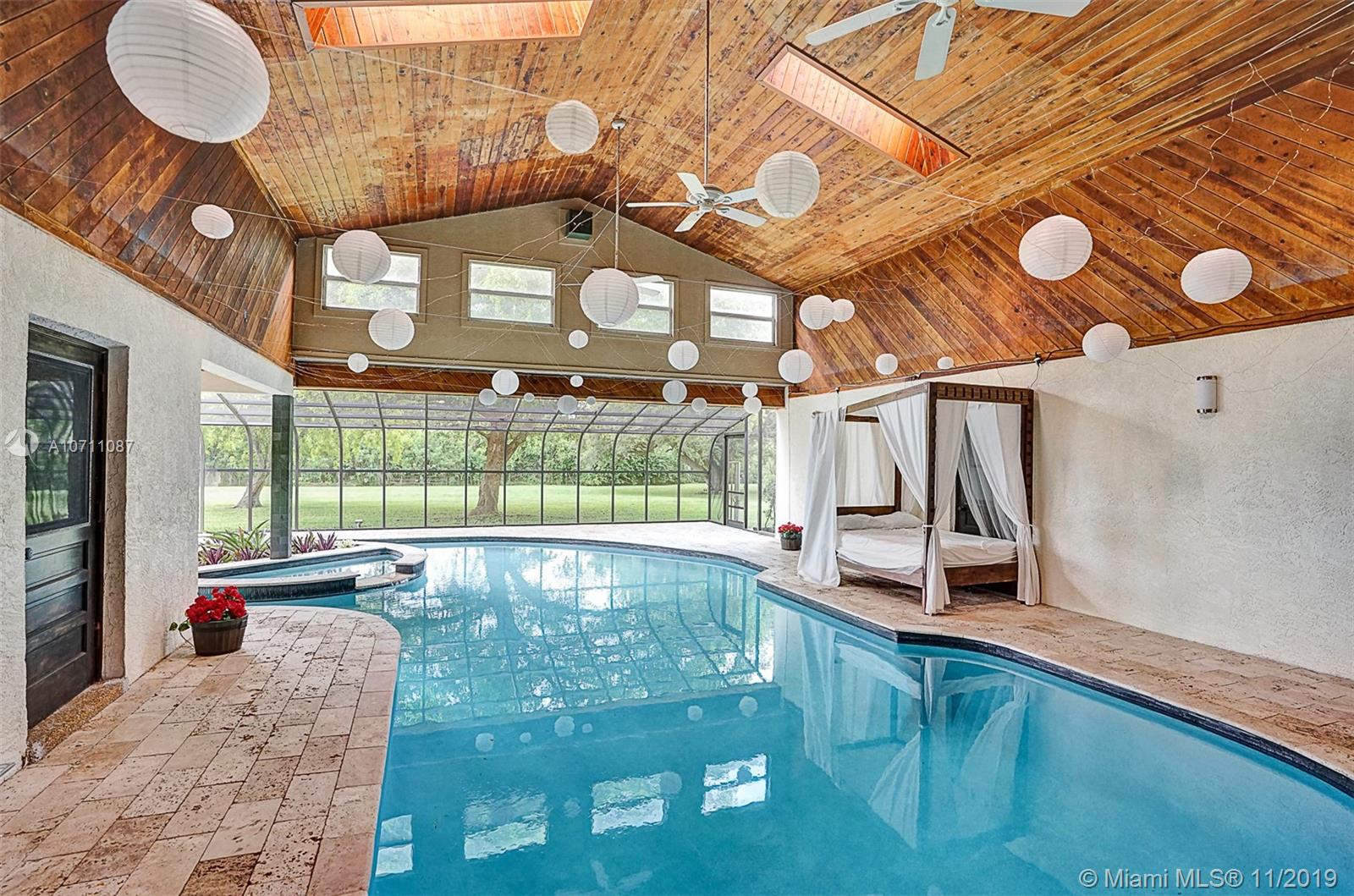 Unique and beautiful home in Southwest Ranches with an open floor plan and a breathtaking view of the indoor pool as you open its entrance doors. Floors in the main areas are high-quality Italian stone. Kitchen has a white quartz center island 8' x 4.5' that allows seating area as well as comfortable cooking space with all wooden cabinets beautifully combined with glass backsplash. 4 spacious bedr are inside the house and the 5th bedr has its own private entrance at the indoor pool area.The indoor pool has wooden high ceilings with fans and spa and 1/4 of the pool has no ceiling to allow sunlight and tanning area. House will be delivered with all impact windows and doors. New roof. Front yard has a beautiful garden w/ huge oak trees that are the inspiring view from kitchen and bedrooms.
