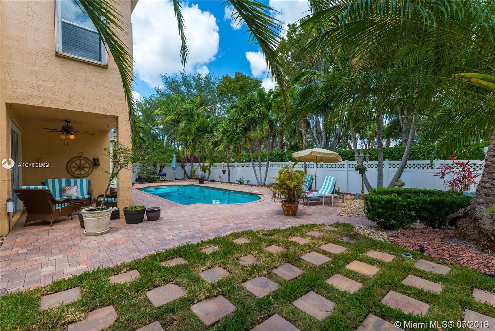 Rare opportunity to own this tastefully upgraded & impeccably maintained home by original owners. The property sits on an oversized lot with no rear neighbors. Surrounded by lush mature tropical trees the yard features a large paver patio and oversized pool which is perfect for entertaining & pool parties. The 1st-floor feature 24 inch porcelain tile, a large modern EIK with oversized center island in granite, the adjacent family room features surround sound, a new 1/2 bath on 1st fl, vaulted ceilings newer paint, drapes and more. Follow the grand circular stairs up and you will find hardwood floors, a renovated full bath, all of the large bedrooms including the elegant master suite. Located in resort style community w/ Tennis, Gym, Pool, basketball courts. 5th Bedroom taken as den option.