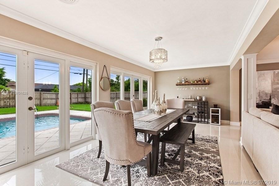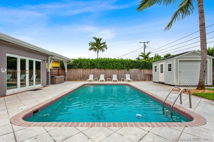 WOW! This beautifully updated pool home is move-in ready! Walk in to a spacious 3 bedroom, 2 bathroom home with a nice open layout. This residence features impact windows and French doors, crown moldings and baseboards, alarm, 2 car garage, circular paved driveway, tile floors throughout and wood “like” floors in bedrooms, formal dining space with views to the pool and recessed lighting. The kitchen offers stainless steel appliances, dark cherry wood cabinets, and granite countertops. The backyard sits on a large 9,975SF lot with a shed, pool, tropical lush landscaping and a covered patio which is great for outdoor entertaining. Location, location! Live in Hollywood Hills best locations close to major highways, shopping and A+Rated Hollywood Hills Elementary school zone.