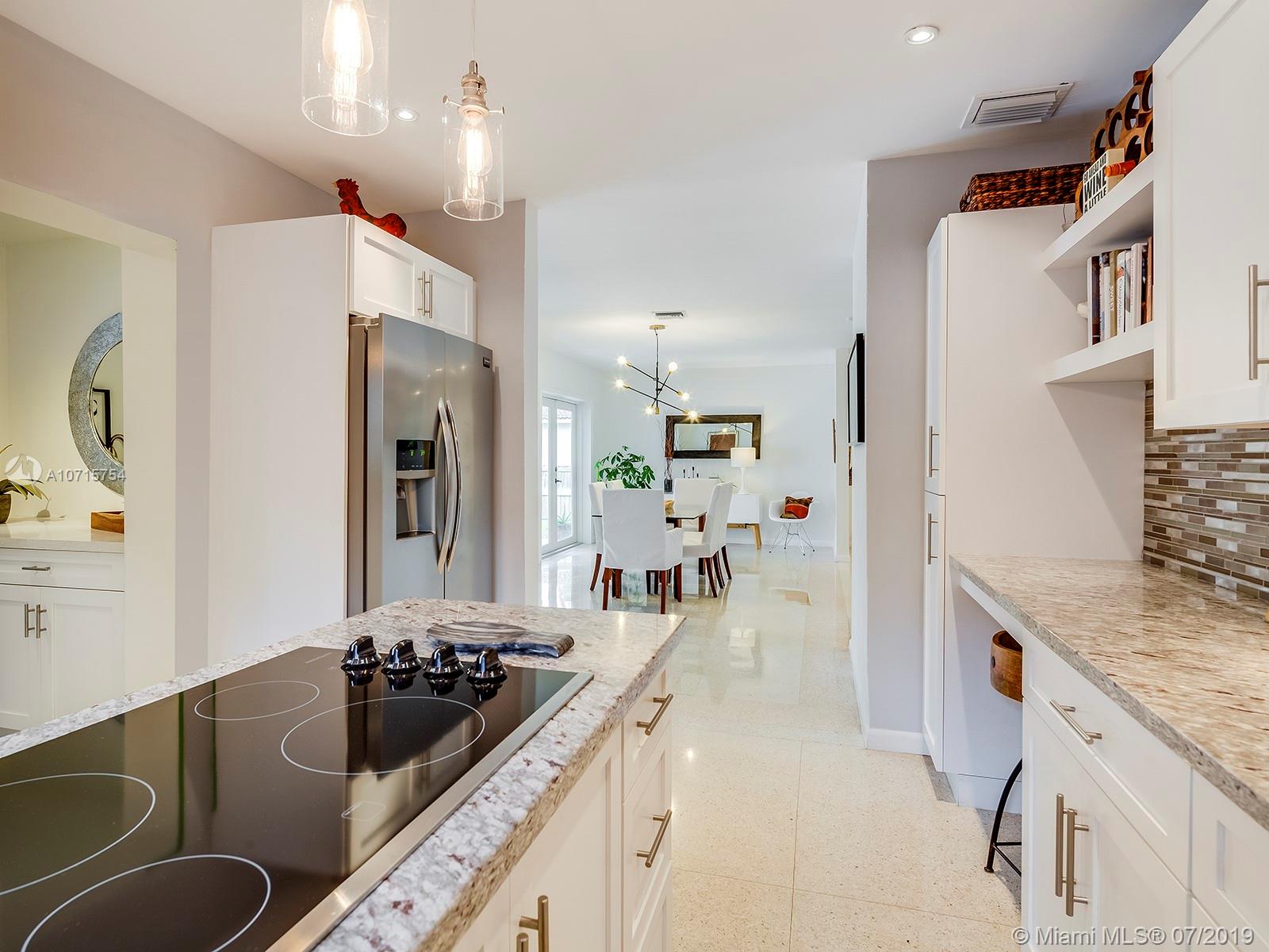 Wonderful modern home! Open floor plan with terrazzo floors with inlay, updated electric, recessed lighting, newer impact windows/doors allow optimum relationship with the outdoors and plenty of natural light. Newly remodeled beautiful kitchen with granite and glass backsplash. Stunning designer baths. Living room/dining room open to large, covered patio and pool. Bedroom split plan with 4th bdrm great for inlaws. Fully fenced backyard with lovely pool and deck. This home is turnkey and a pleasure to show. Do not miss! As per tax roll Liv area sf 2,242, Adj sf 2,457 (includes 50% of garage/33% of covered porches), Total sf 2,910