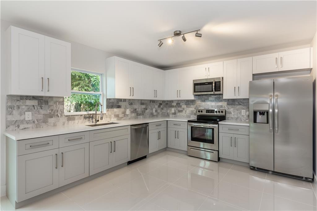 This stunningly remodeled 3 bedroom 2 bathroom home is in the sought after community of Shady Banks. This bright & open home has vaulted ceilings & high impact windows throughout. The kitchen is modern & elegant with high-end 2 tone shaker cabinets, stainless steel appliances & quartz counter-tops. This style continues throughout the house into the master-bath with the impressive wall to wall, walk-in rain shower & marble top dual sink vanity. This home has been COMPLETELY renovated down to the concrete walls with New Electrical, New A/C, New Roof & the list keeps going. You will have the comfort & peace of mind that comes with NEW Construction. This AMAZING OPPORTUNITY to live in East Ft Lauderdale walking distance to a park won't last long. Come see for yourself, you'll be glad you did.