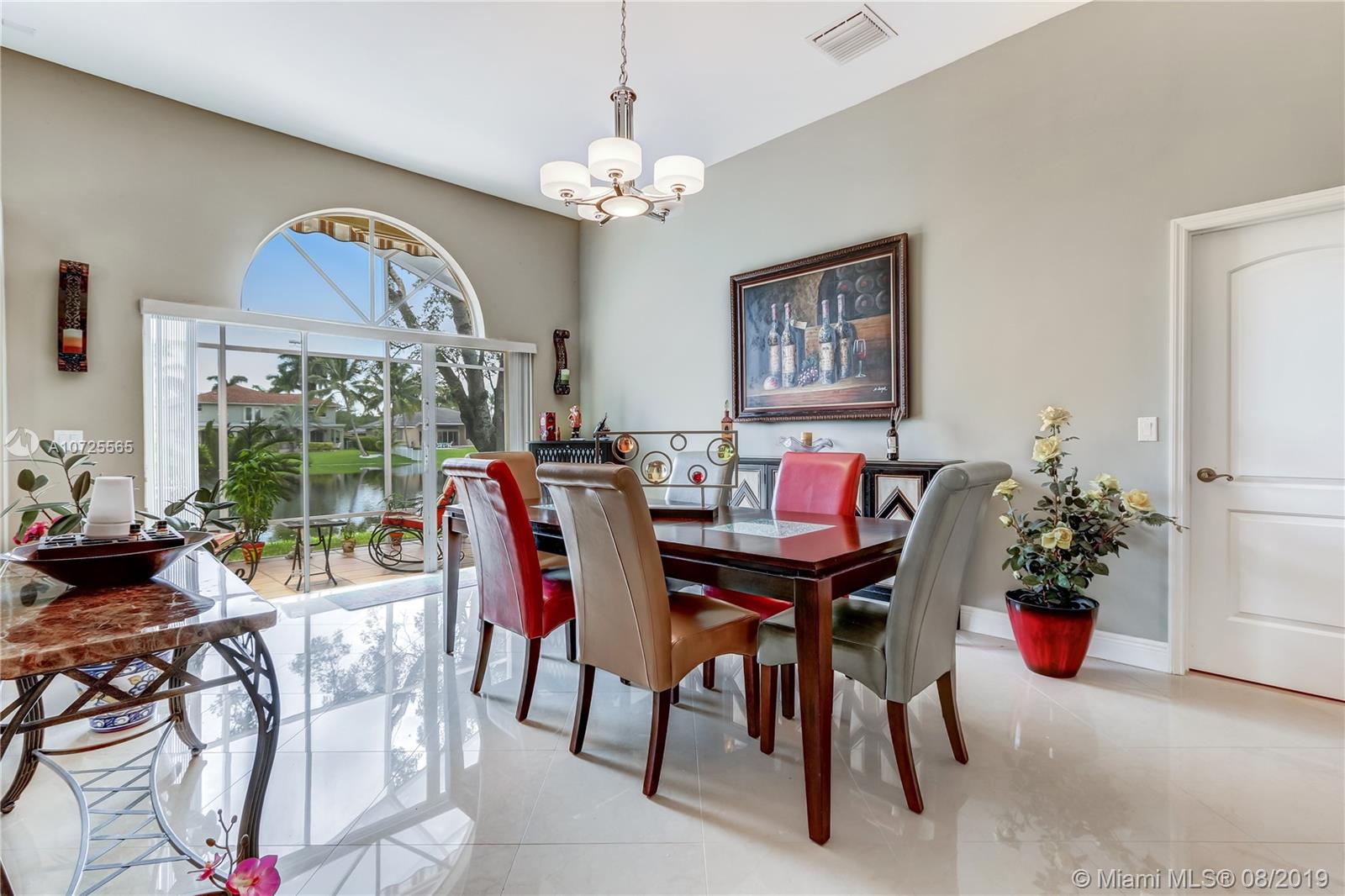 RARE FIND LOCATED IN PRESTIGIOUS EMERALD LAKES! This highly sought out Mediterranean architecture home is one of its kind! Single story w/ beautiful surrounding landscapes & spectacular views of the lake from every room! Kitchen is wood cabinetry dressed with granite counter tops on an open floor concept to the living room; perfect for family gatherings and entertaining guests. Home showcases upgraded porcelain tile flooring, screened in porch with water resistant treatment, elec. retractable awning, 4 bedrooms, 3 baths with travorntine and marble tiles. Master bed/bath features double vanities, whirlpool tub, & 2 large walk-in closets. Dinning room includes arched entries, custom stone wall, and amazing natural lighting to illuminate the home throughout. IT'S A MUST SEE & PRICED TO SELL!