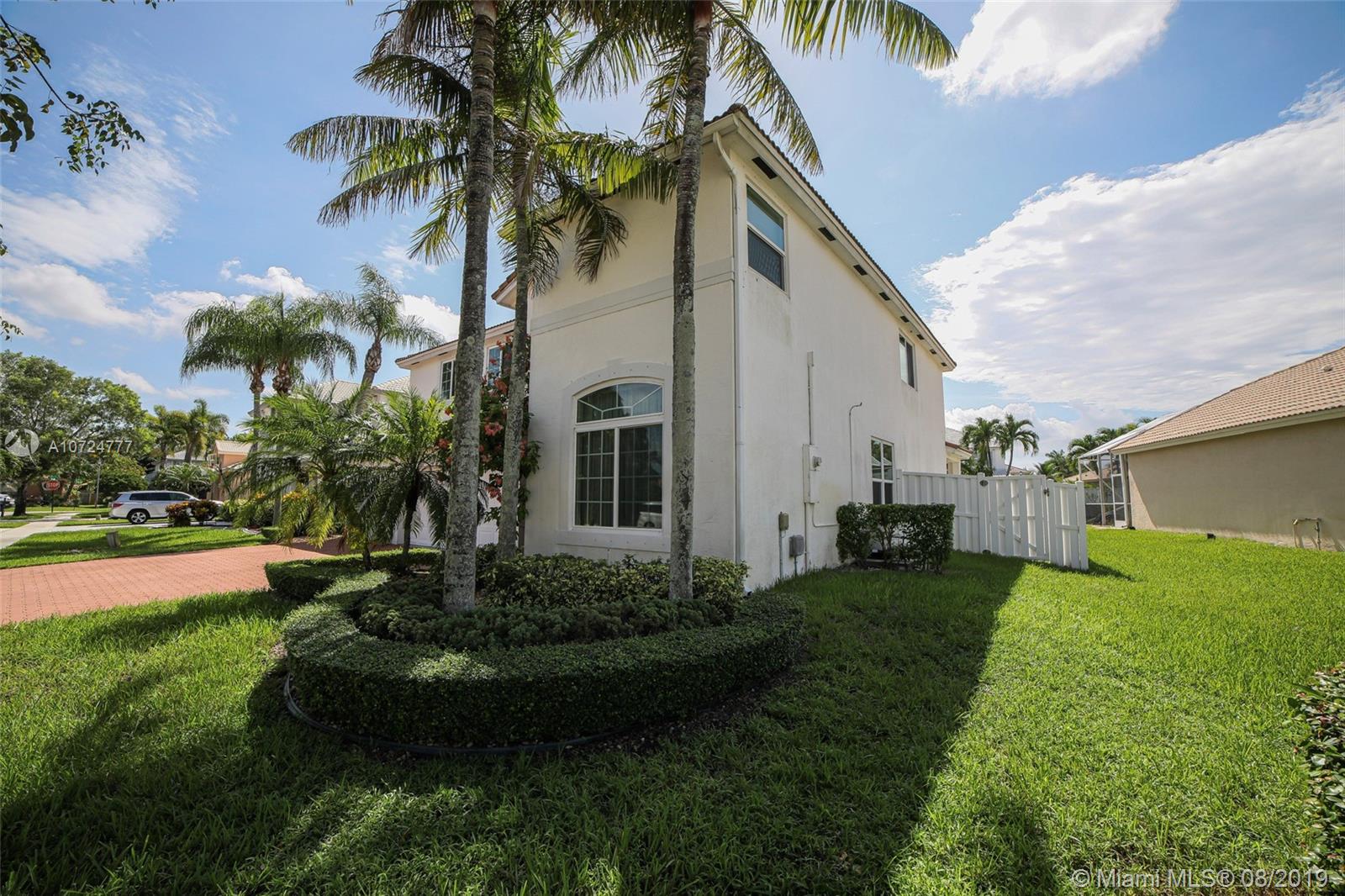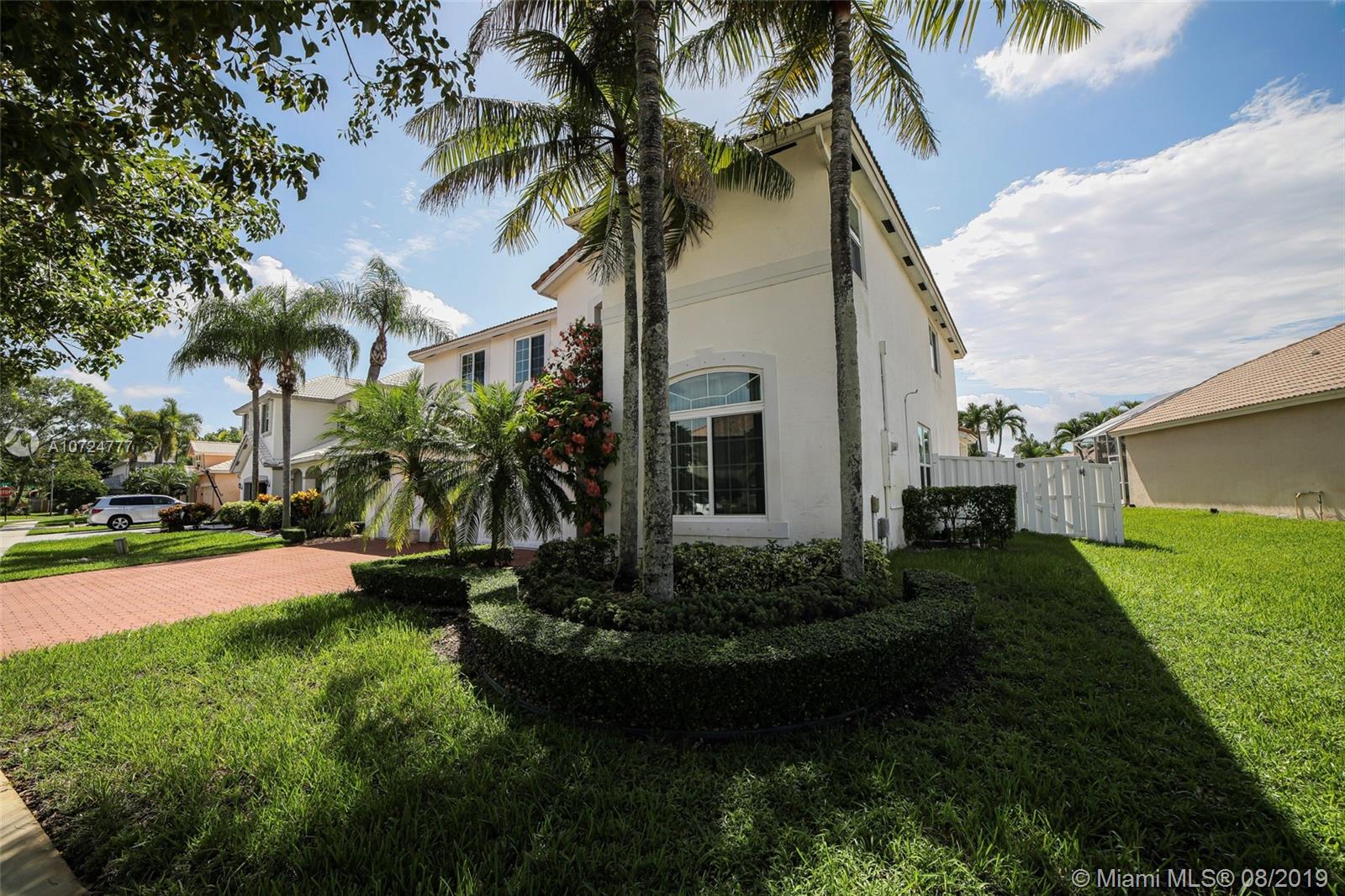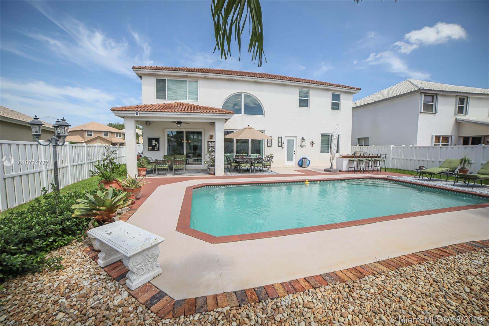 Gorgeous home in a desirable gated community Pembroke Shores, 4bedrooms, 3full baths, 3car garage. Bright, airy and open floor plan with natural lighting and great flow. High ceilings. Tastefully updated kitchen that features granite countertops, stainless steel appliances, and modern style wood cabinets. Ample tiled living areas with a great Living Room, and a formal Dining Room area. Wood Stairs to the second floor redone with an open design. Upstairs has laminated wood floors. Good size Master Bedroom with a just beautifully renovated Master Bathroom. Split bedroom design. Other bathrooms also renovated. New hurricane windows with thermal protection. Amazing backyard with white vinyl fence, pool, paved patio, large landscape, built-in outdoor grill, outdoor speaker. Move-in ready!!