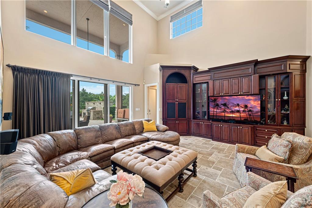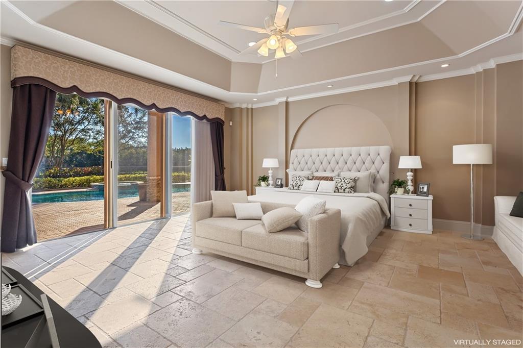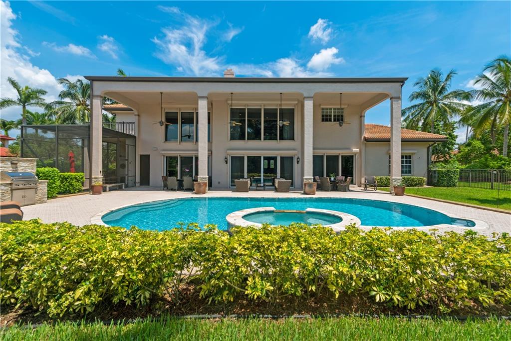 This spectacular Windmill Lake Estates home is privately nestled in an exclusively gated enclave of only 54 custom homes on acreage lots. Property boasts a grand driveway entrance with large fountain, beautifully manicured grounds, 2 story foyer, 7 bed/6 bath/ 2 half-baths, formal dining with butler’s pantry, formal living room with wet bar, and updated kitchen with center island and large pantry. Tumbled marble floors. Elegant master suite with separate sitting area overlooks the lush resort-style pool which offers complete privacy with no rear neighbors. Easily accessible air conditioned attic space, plenty of parking space, oversized garage, Rolladen hurricane protection throughout, new roof, hue lighting, nest smart home system, outdoor turf in backyard, and low HOA.