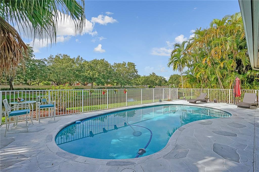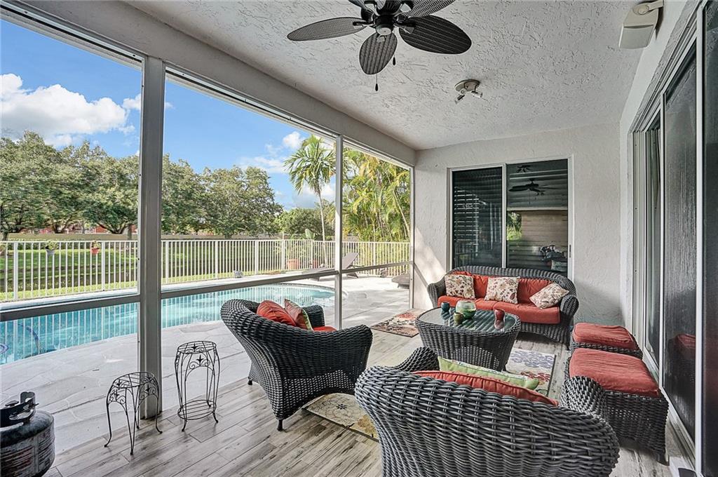 Located in sought after Highland Place in Eagle Trace. Home is absolutely beautiful! From the moment you walk in through the double stain glass doors the soaring ceilings and wood floors will take your breath away. It is bright and open with plenty of room for any size furniture.Plantation shutters through out this home. Three bedrooms and three bathrooms, master bath has been remodeled and looks modern, chic and clean. The third bedroom is converted to a office with built in cabinets but can easily be converted to a bedroom. Outside patio is screened and a huge room to entertain overlooking the pool and canal. Home is located very close to shopping with Publix just a short walk or drive in distance. Imagine yourself grilling and entertaining family and friends in a beautiful pool home .