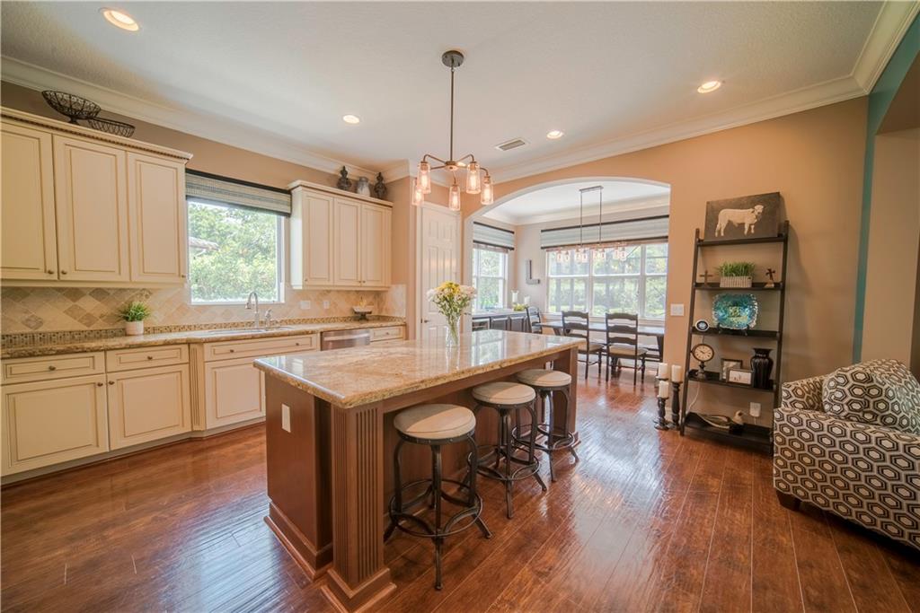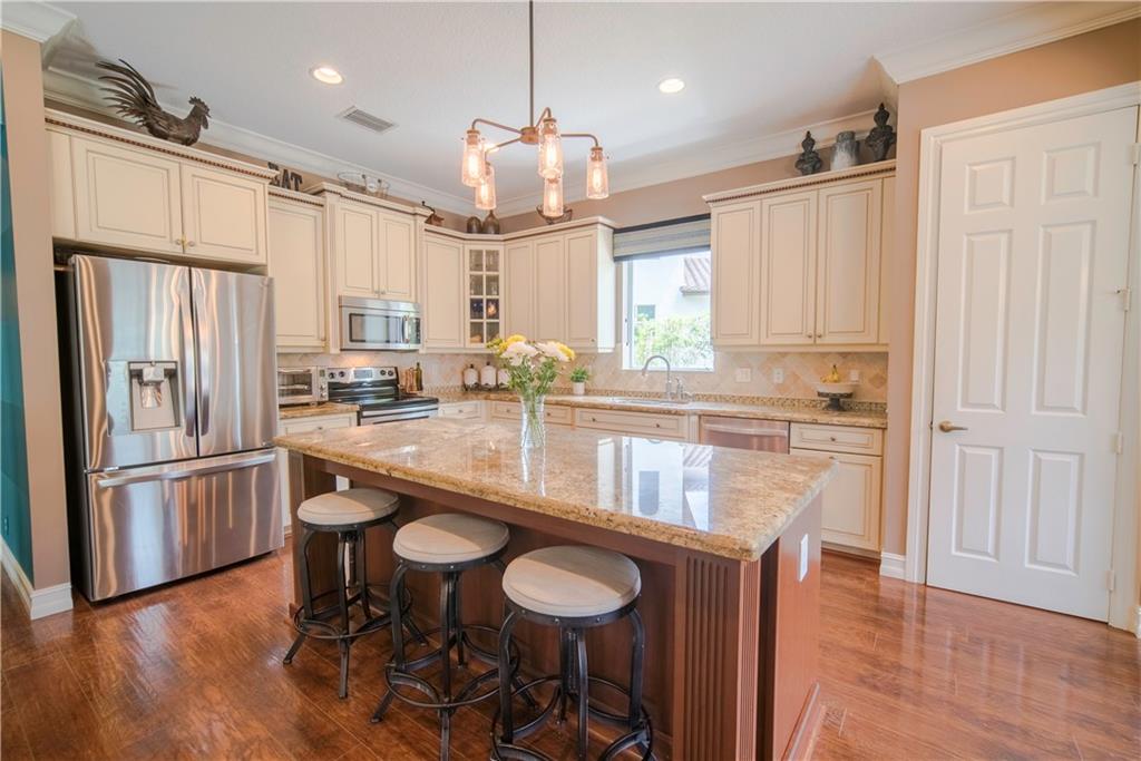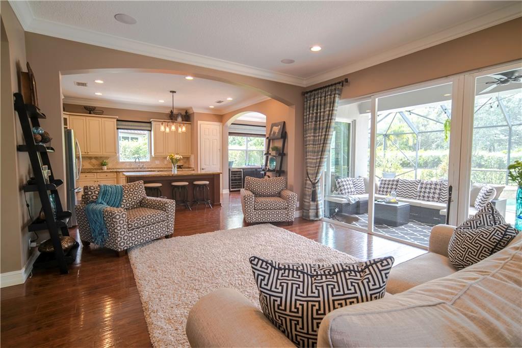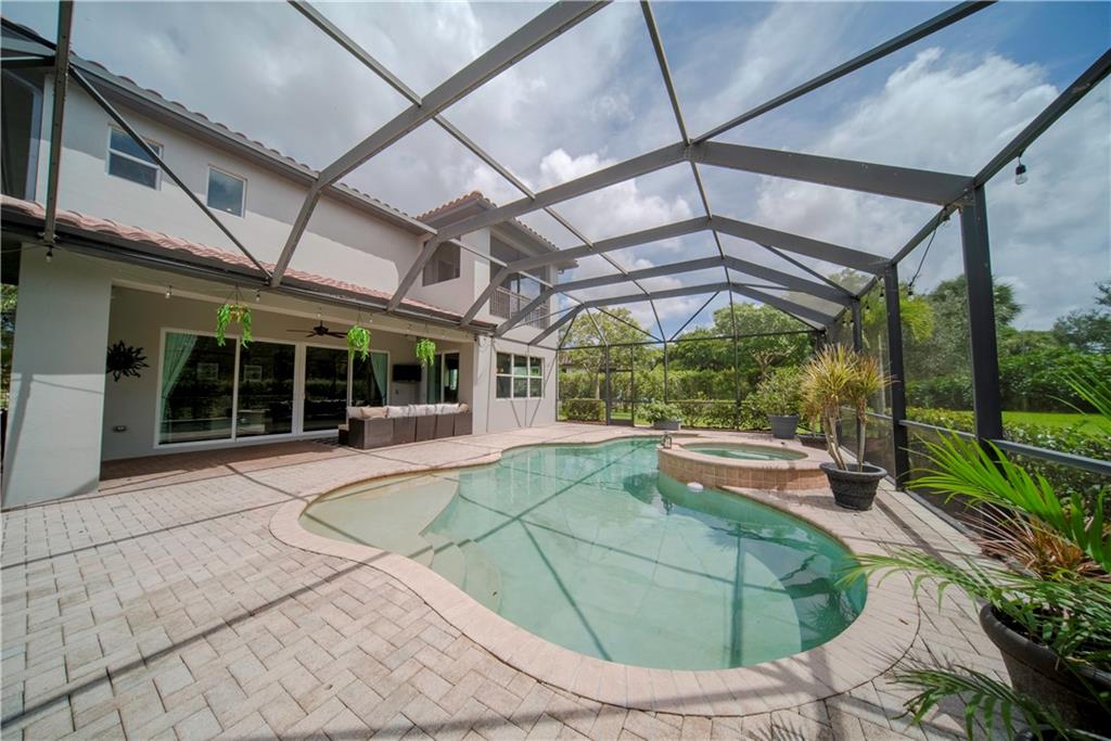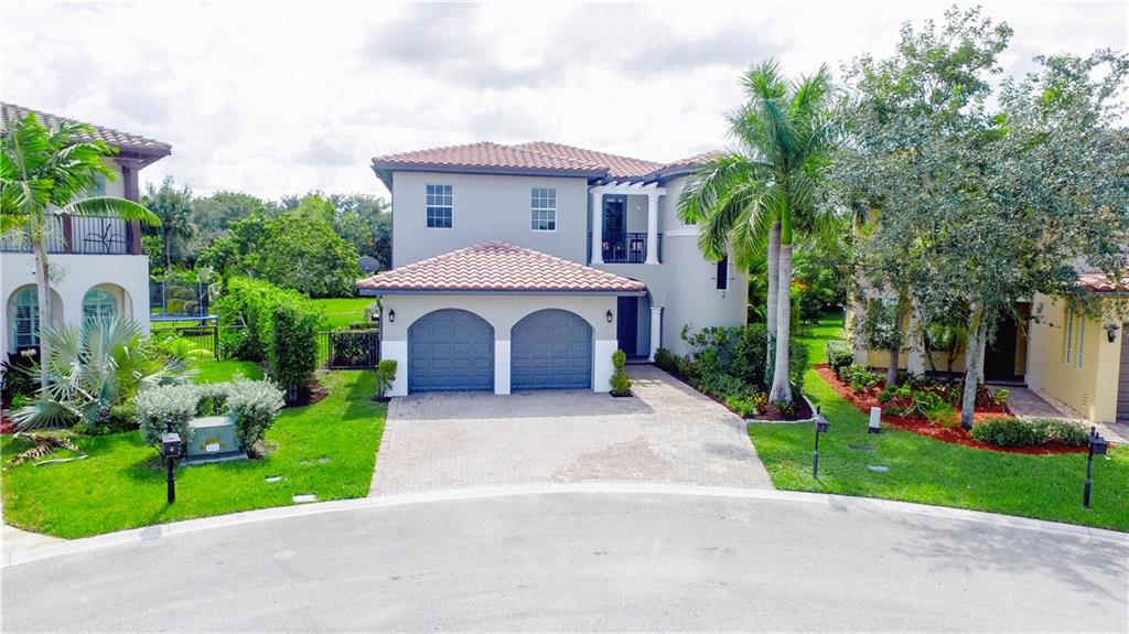 Contemporary & Turnkey Expanded St. John Model w/5 Beds + Loft, 4 Baths, Pool & Spa on a Large, Pie-Shaped Cul-de-Sac Lot. Freshly Painted Outside, Impact Windows/Doors, Hardwood Floors, Crown Molding & Upgraded Light Fixtures Throughout Living Areas. Upgraded Kitchen w/Granite Countertops, SS Appliances, Pantry, Off White Wood Cabinets & Contrasting Brown Center Island w/Barstool Seating. Open Family Room w/Sliding Glass Doors Opens Up Into Large Covered Patio Area & Screened-In Pool. Downstairs Has 1 Full Guest Bed & Bath. Upstairs Master Suite w/Tray Ceilings & Walk-In Closets Has A Screened-In Balcony Overlooking Pool & Backyard w/Upgraded Landscaping. Master Bath w/Glass Shower, Whirlpool Spa Tub, Dual Vanity Sinks. Enjoy Guard Gated Community, Resort Style Amenities, A-Schools!