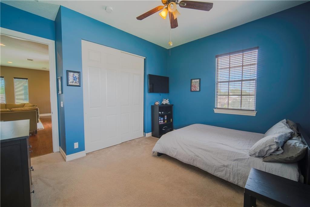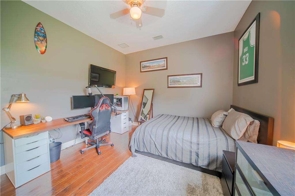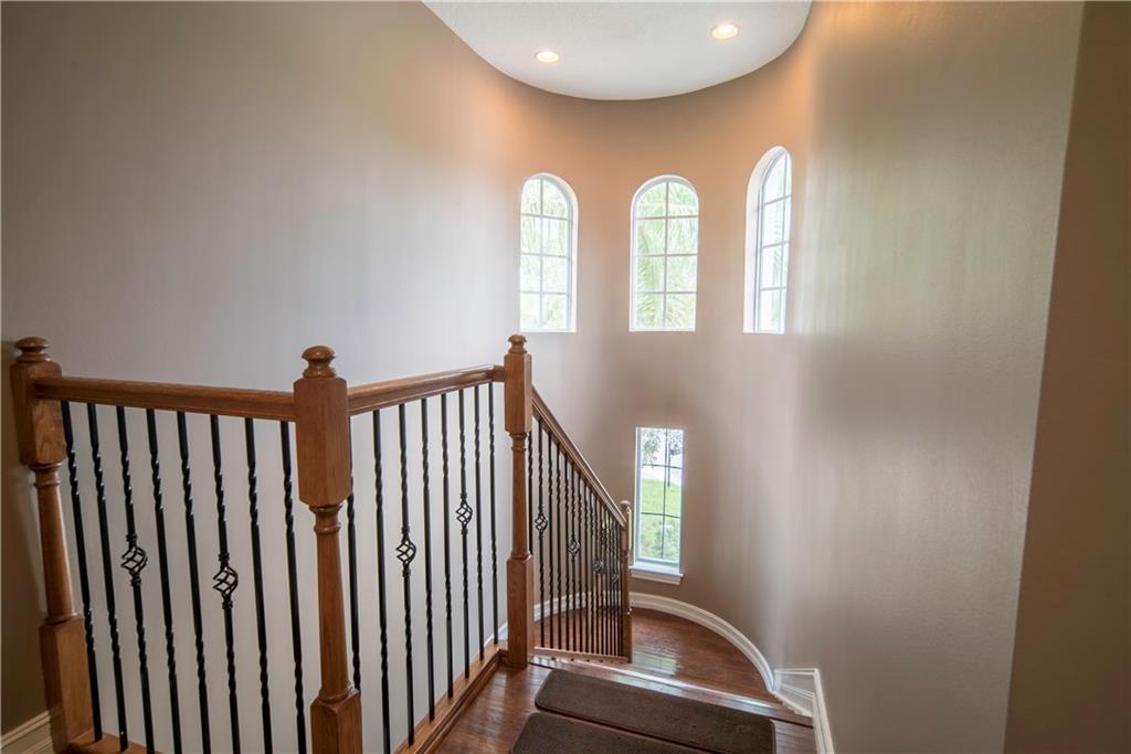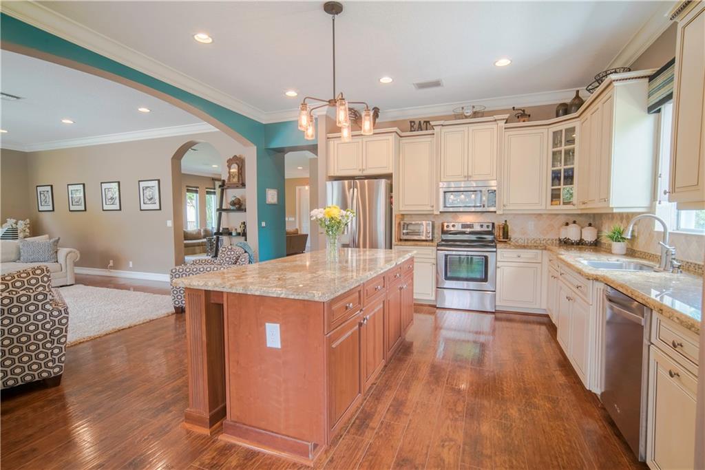 Contemporary & Turnkey Expanded St. John Model w/5 Beds + Loft, 4 Baths, Pool & Spa on a Large, Pie-Shaped Cul-de-Sac Lot. Freshly Painted Outside, Impact Windows/Doors, Hardwood Floors, Crown Molding & Upgraded Light Fixtures Throughout Living Areas. Upgraded Kitchen w/Granite Countertops, SS Appliances, Pantry, Off White Wood Cabinets & Contrasting Brown Center Island w/Barstool Seating. Open Family Room w/Sliding Glass Doors Opens Up Into Large Covered Patio Area & Screened-In Pool. Downstairs Has 1 Full Guest Bed & Bath. Upstairs Master Suite w/Tray Ceilings & Walk-In Closets Has A Screened-In Balcony Overlooking Pool & Backyard w/Upgraded Landscaping. Master Bath w/Glass Shower, Whirlpool Spa Tub, Dual Vanity Sinks. Enjoy Guard Gated Community, Resort Style Amenities, A-Schools!