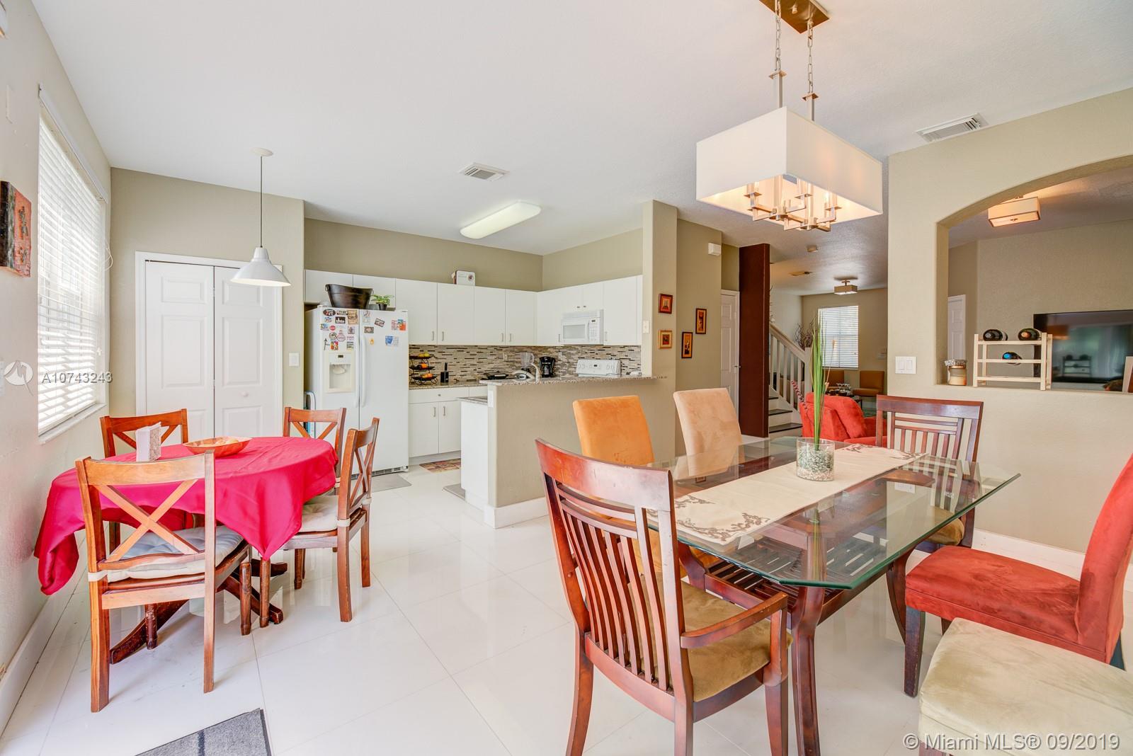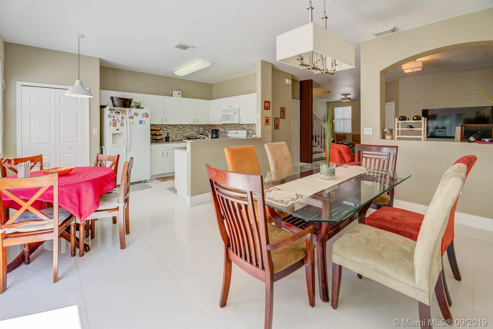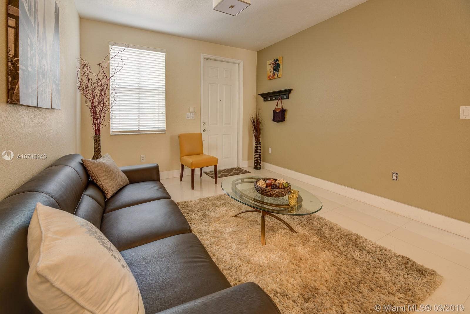 This modern 2006 two story Mediterranean style town home with garage in the heart of Doral has everything you're looking for. Sparkling white porcelain floors throughout the living area give the home its wide open airy feel and the exquisite cafe colored wood floors in the bedrooms make a beautifully stunning contrast. Modern accents and fixtures decorate the entire interior of the home giving it a unique look along with its classic Spanish/Mediterranean exterior. Great for entertaining you'll enjoy its formal living room with adjacent Florida room making it great for receiving guests. Its nearly 1900sf of living space encompasses 4 bedrooms and 2.5 baths all updated with pristine light fixtures, sinks and cabinetry. A large open kitchen overlooking the dining area.